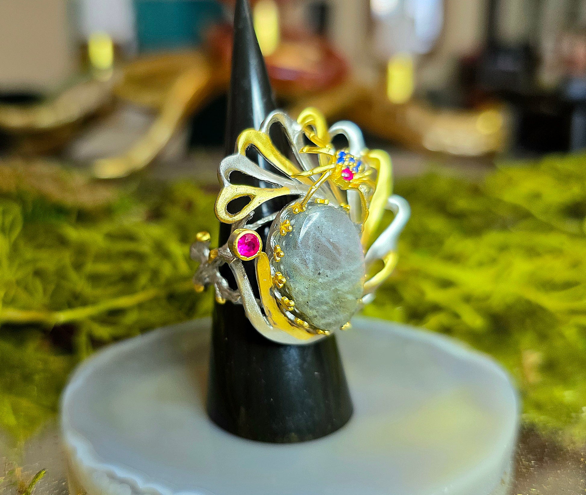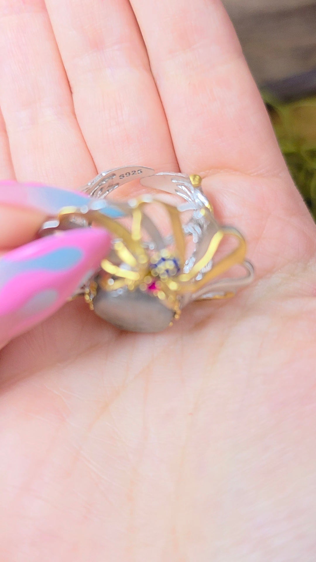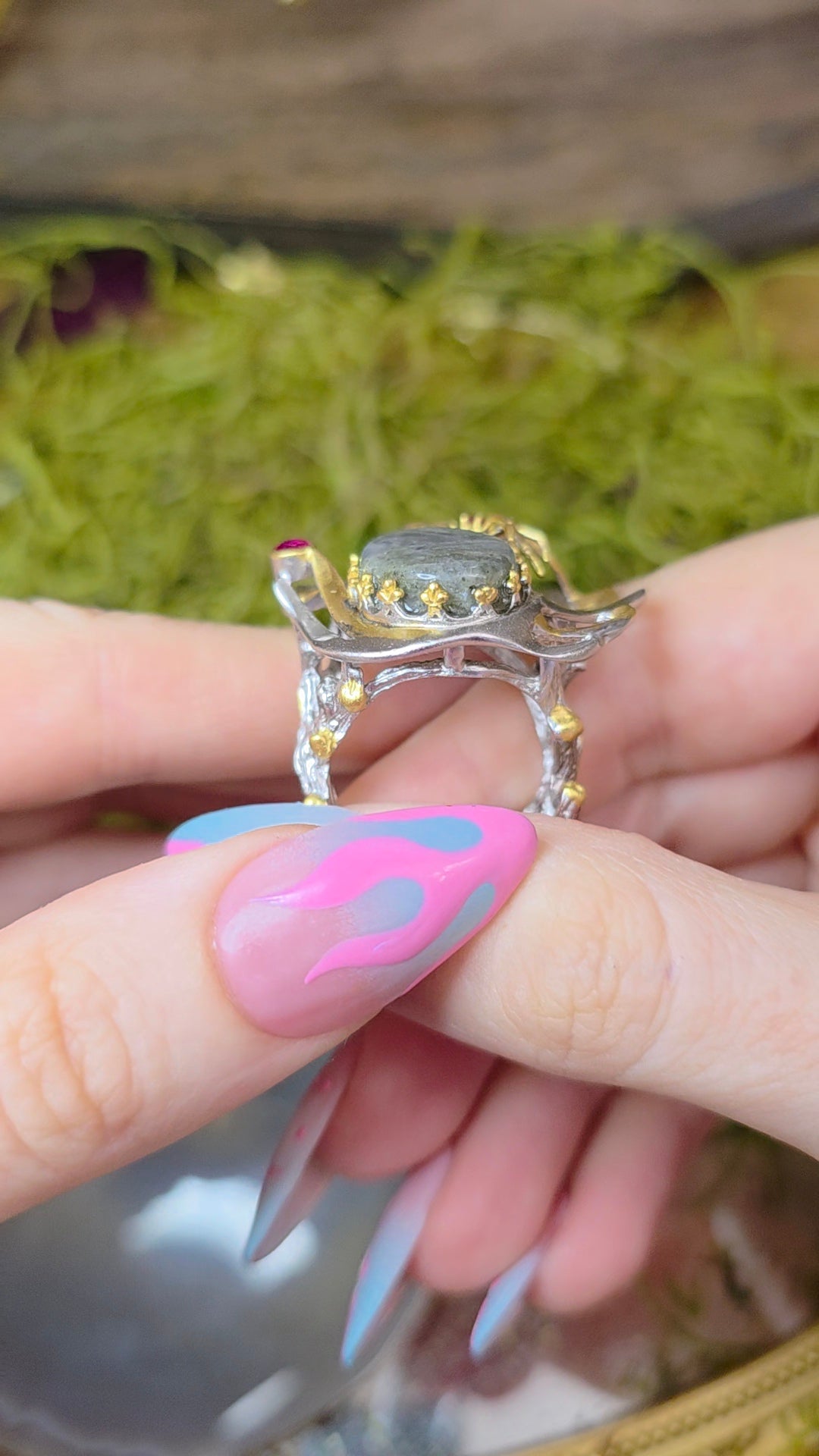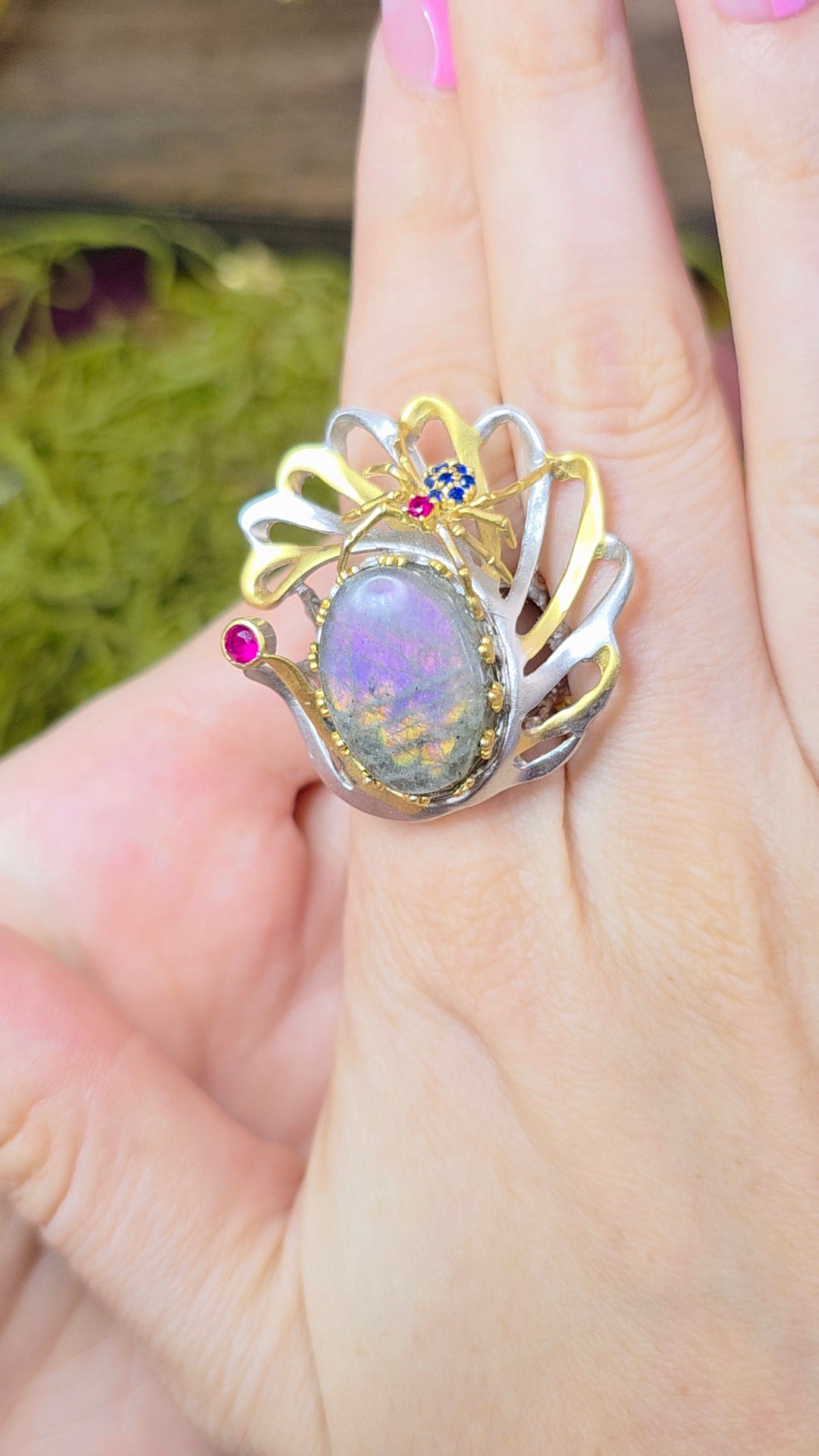 18x13mm flashy labradorite cabochon set into an adjustable sterling silver and gold plated ring with a spiderweb design. The ring is decorated with labradorite created sapphires and rubies.