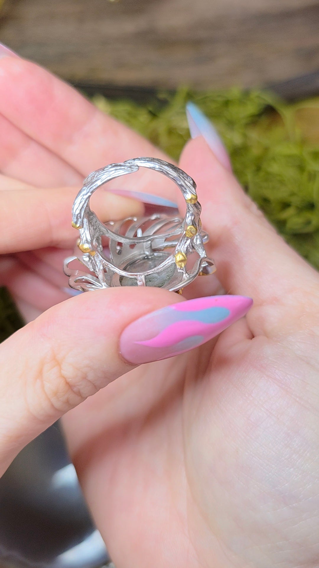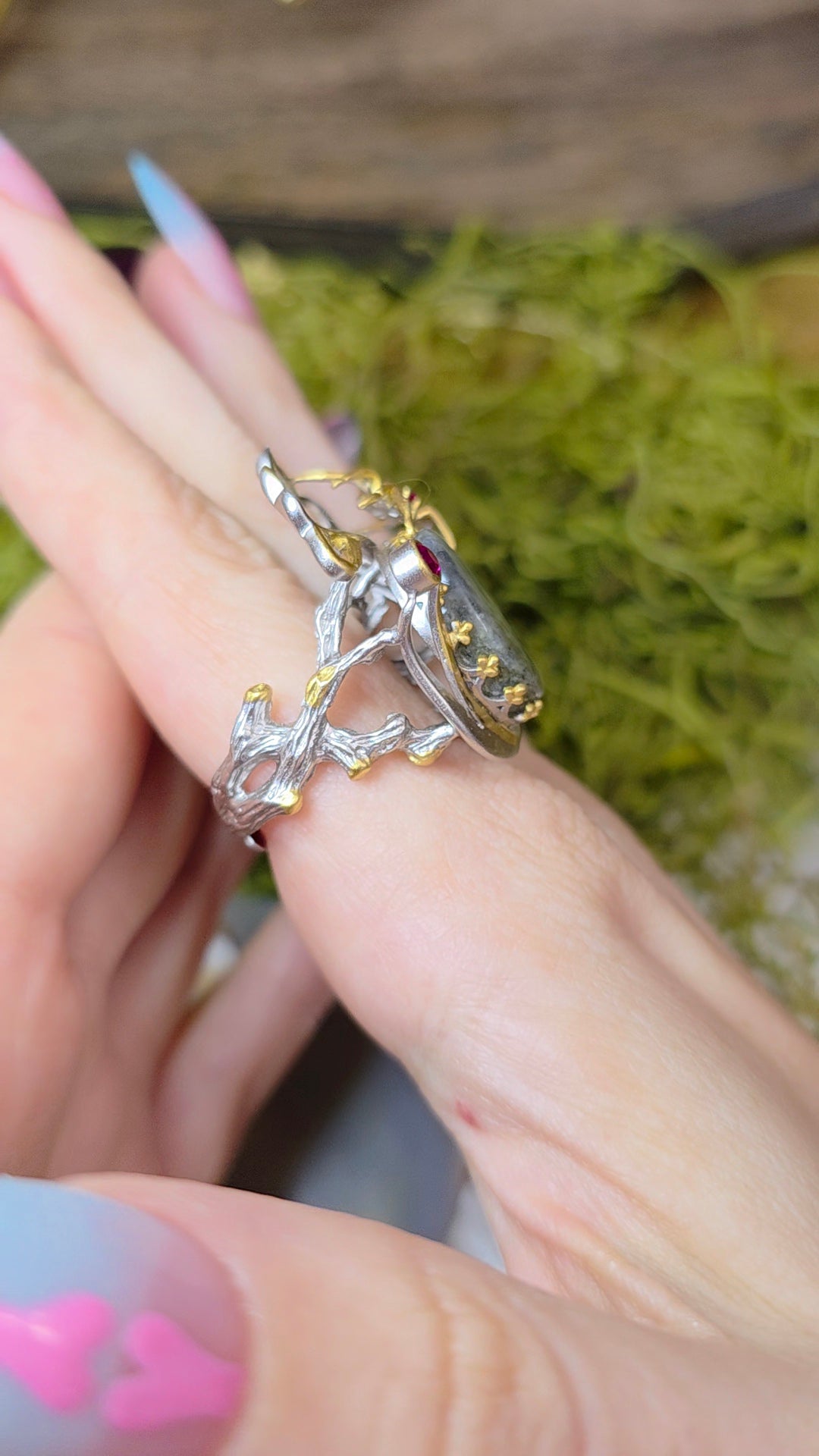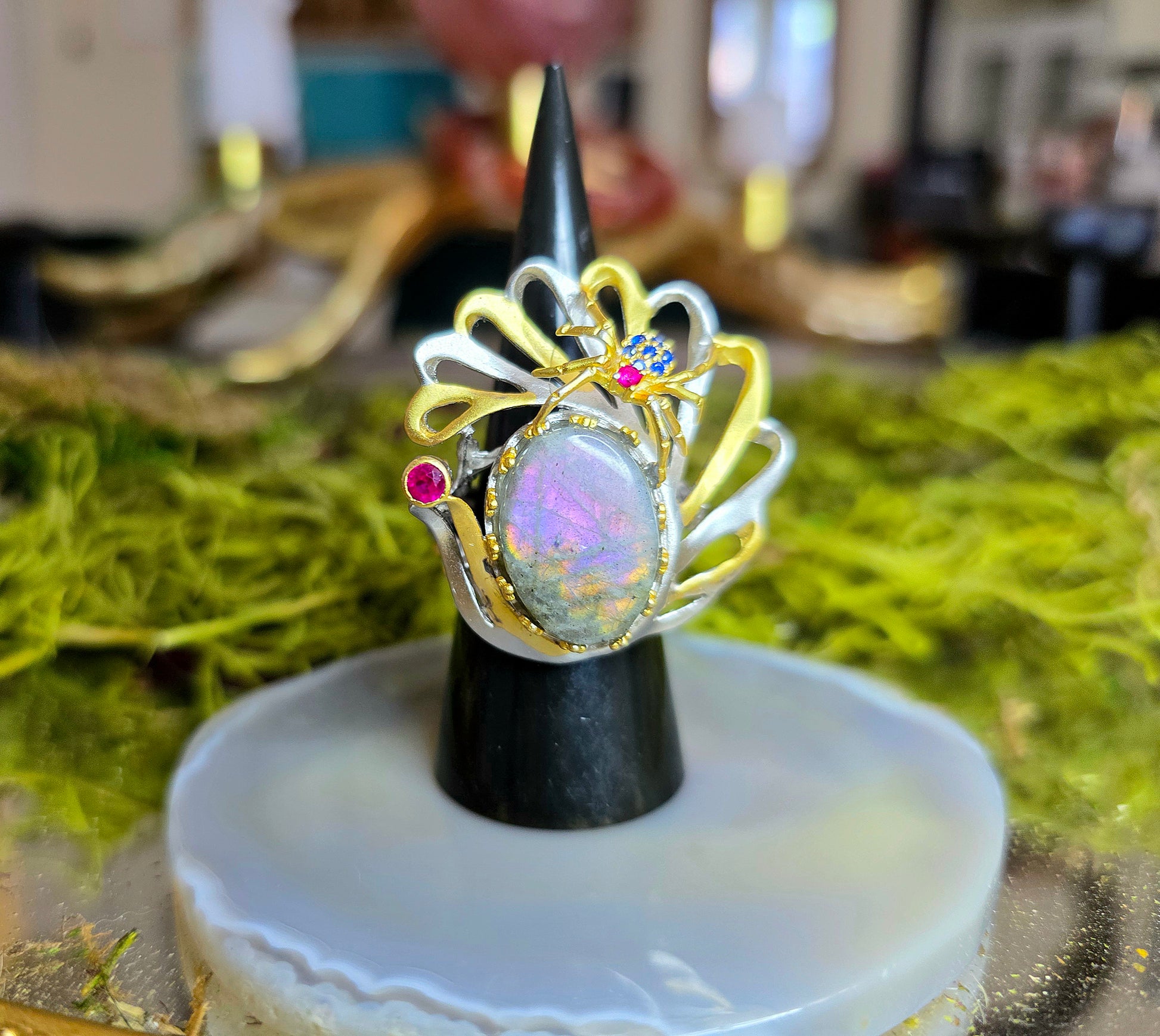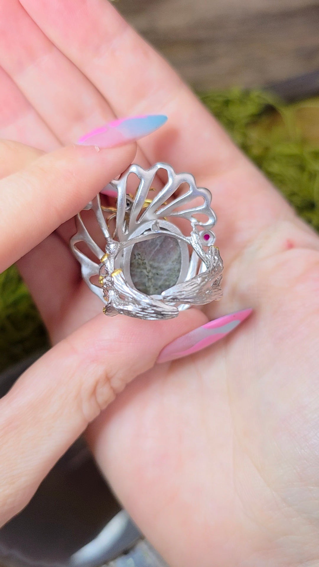 18x13mm flashy labradorite cabochon set into an adjustable sterling silver and gold plated ring with a spiderweb design. The ring is decorated with labradorite created sapphires and rubies.