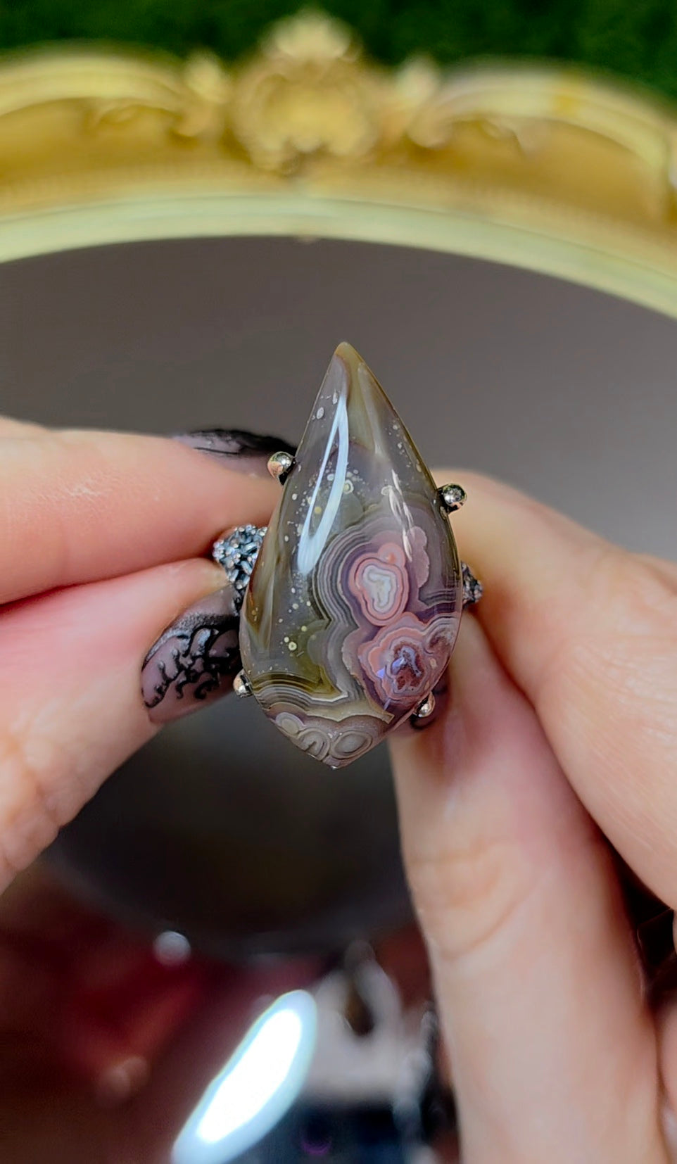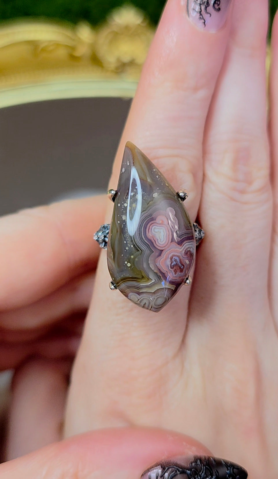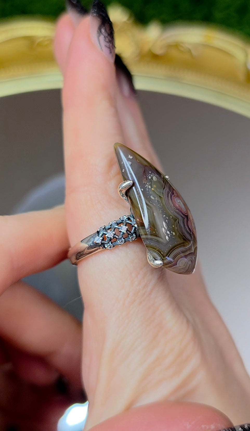 This stone is approximately 32 x 15mm and is set into an adjustable sterling silver ring that will best fit sizes 8 - 10