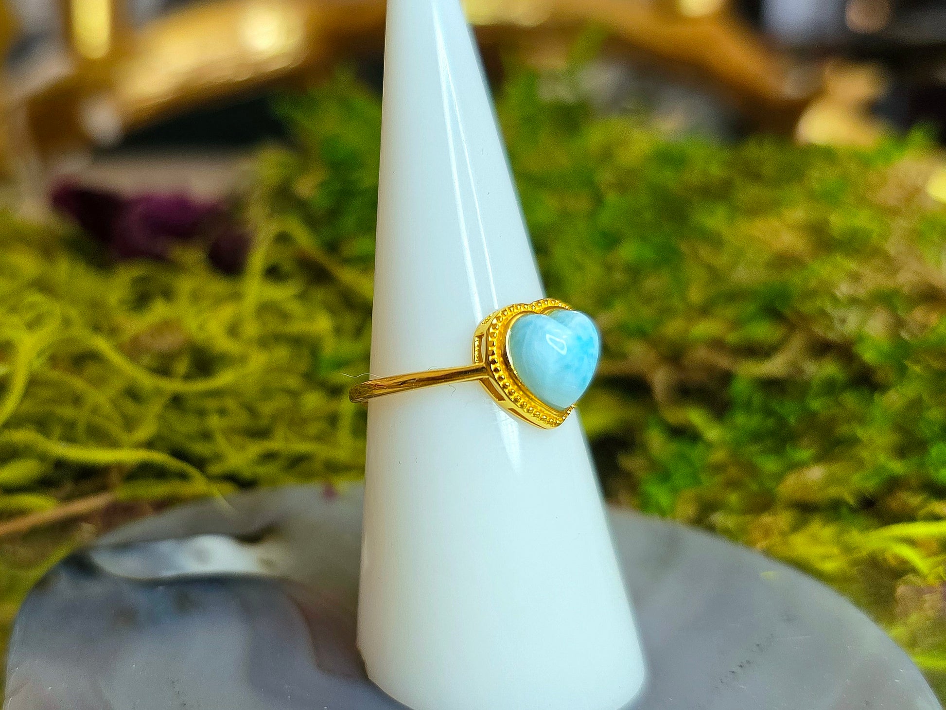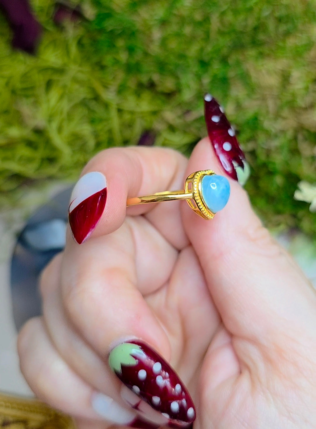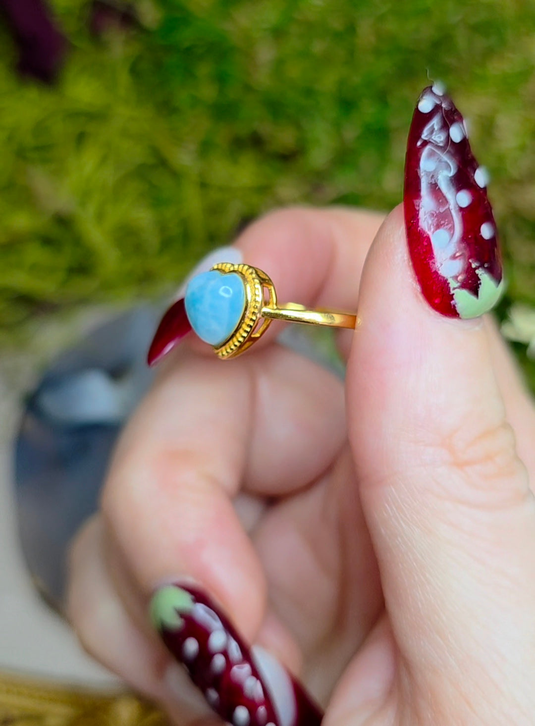 This ring features a 7.5mm larimar cabochon that is set into a gold-plated sterling silver adjustable ring that will fit sizes 7 - 9 best.