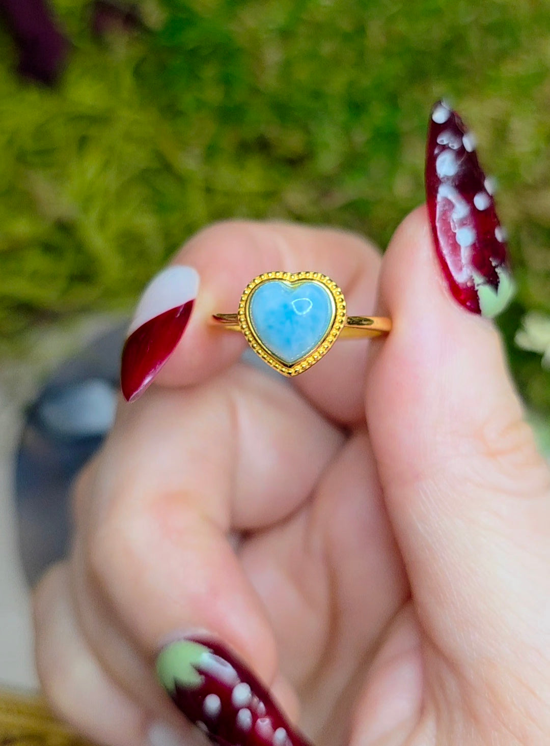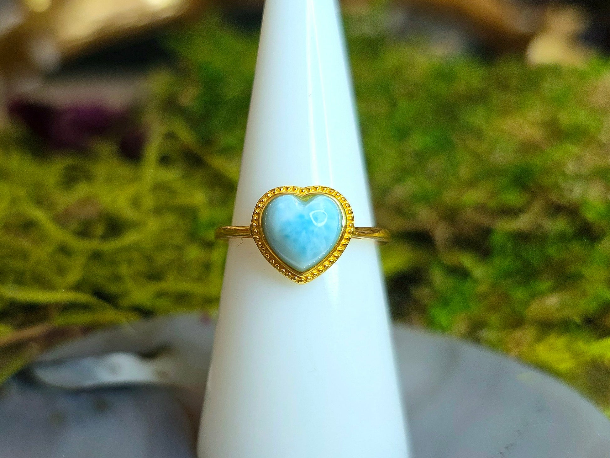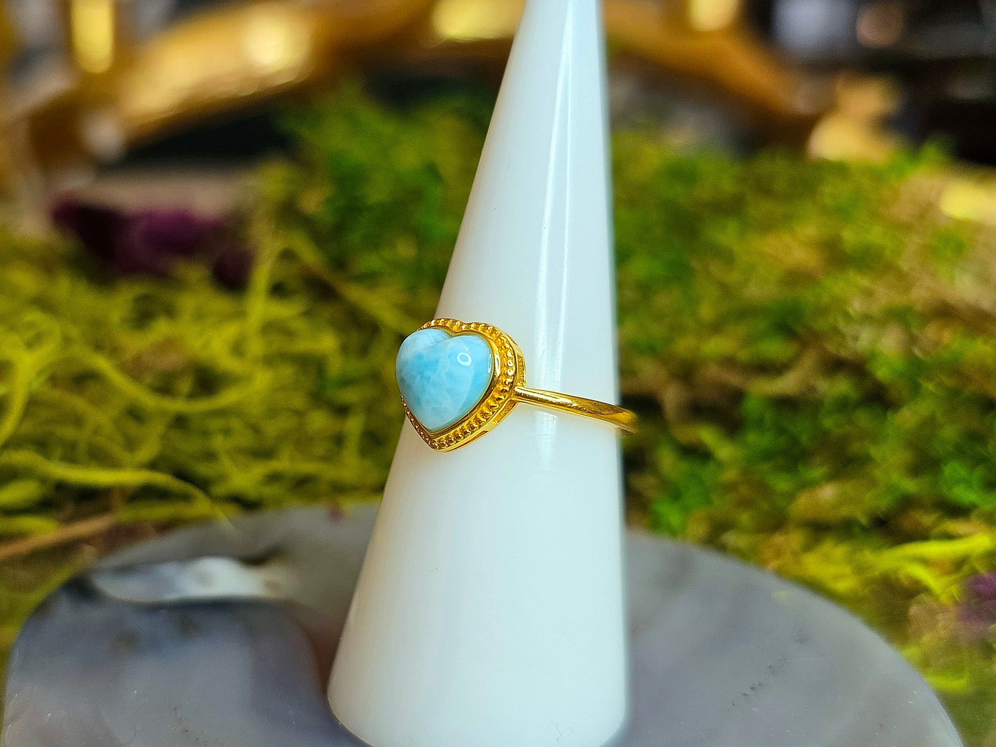 This ring features a 7.5mm larimar cabochon that is set into a gold-plated sterling silver adjustable ring that will fit sizes 7 - 9 best.