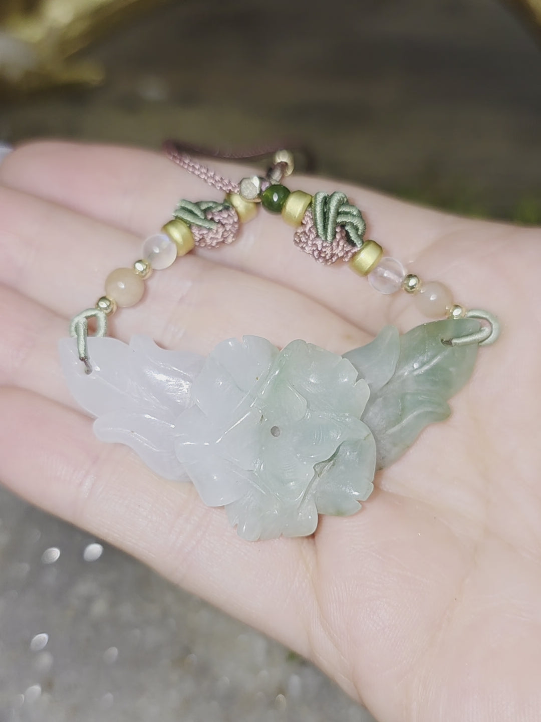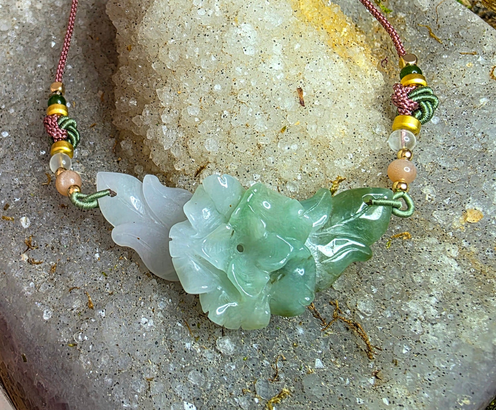 This pendant features two tone lavender and green jade that has been hand carved into a floral design. It is set onto an adjustable 28" nylon cord with 4mm rainbow moonstone and sunstone accent beads.