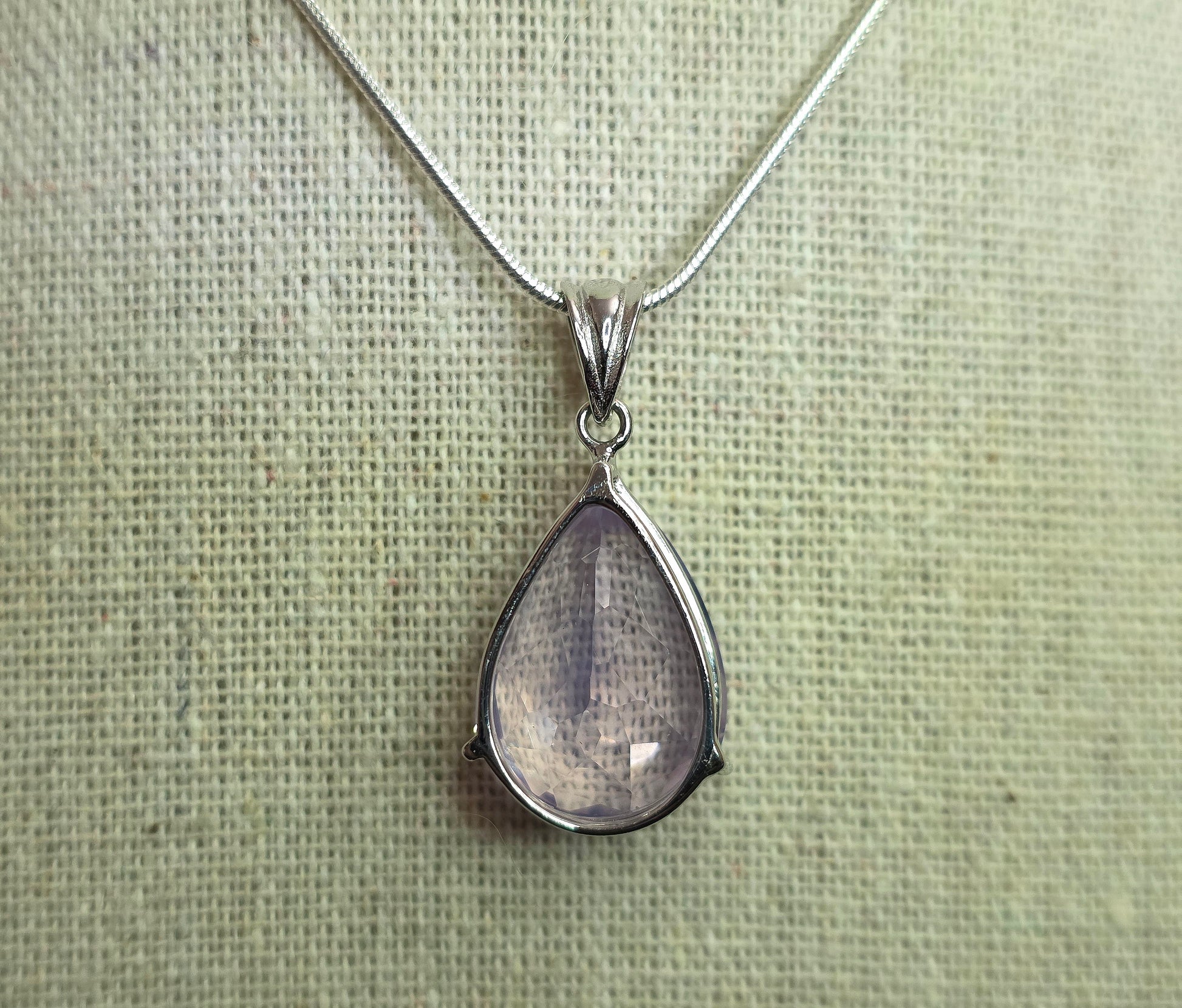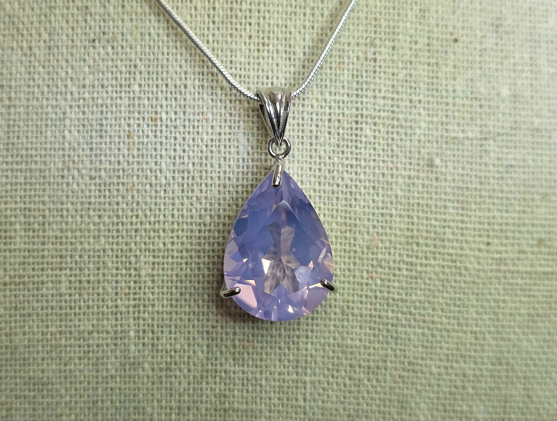 This pendant features a 21x14 mm faceted piece of lavender moon quartz in the shape of a teardrop. The stone is set in a sterling silver bail.