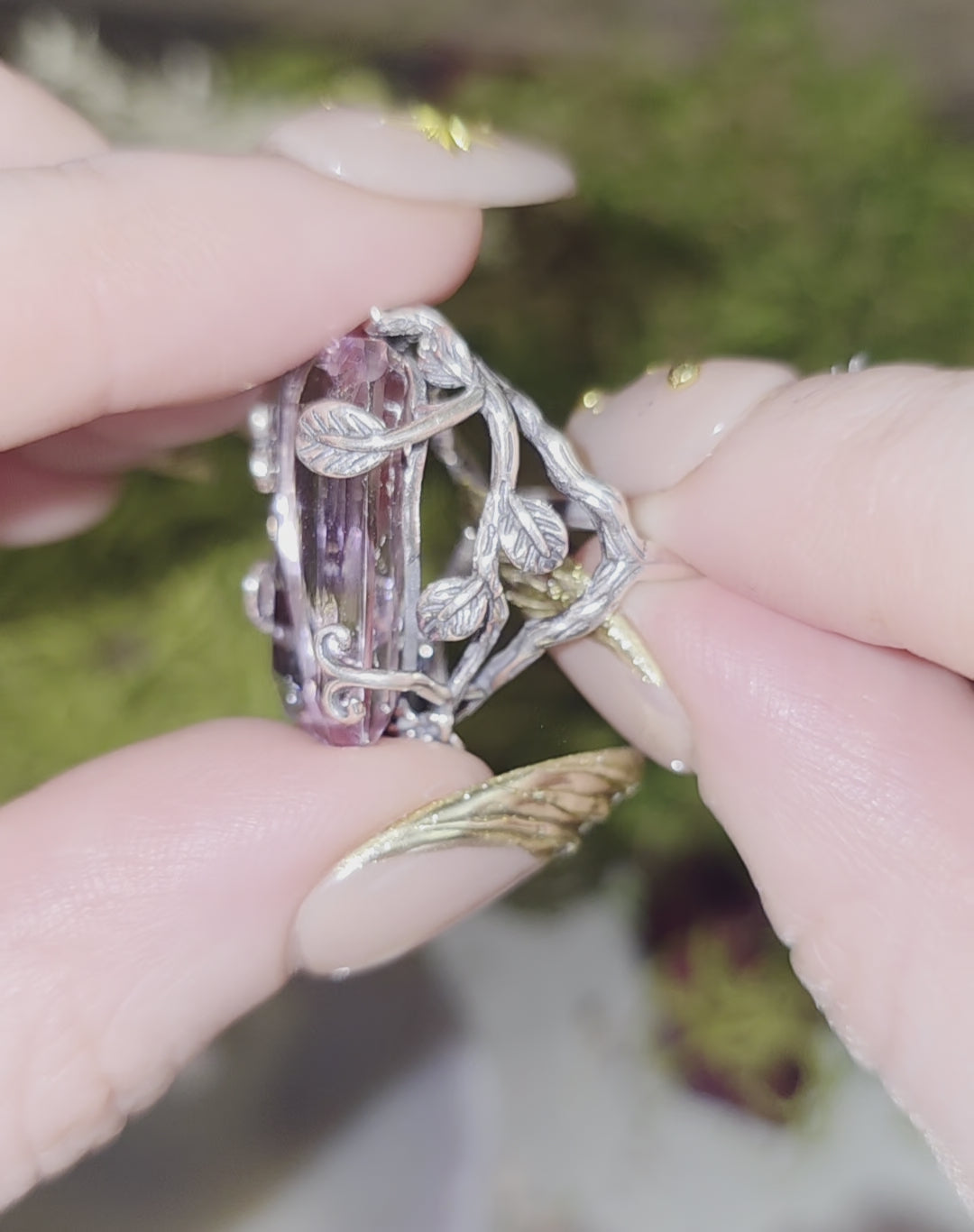 23 x 12mm faceted light color amethyst, set into an adjustable sterling silver ring with leaf and vine details.
