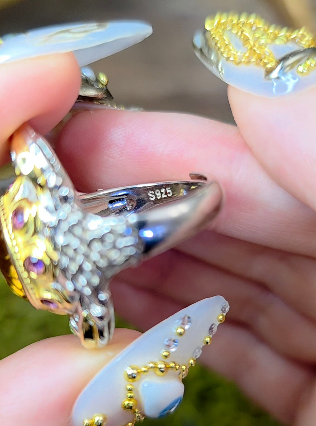 13x11mm citrine that has been faceted and set into a gold plated adjustable sterling silver ring with eight 3mm ruby and two 3mm peridot accent stones.