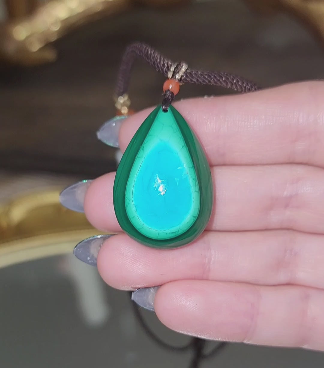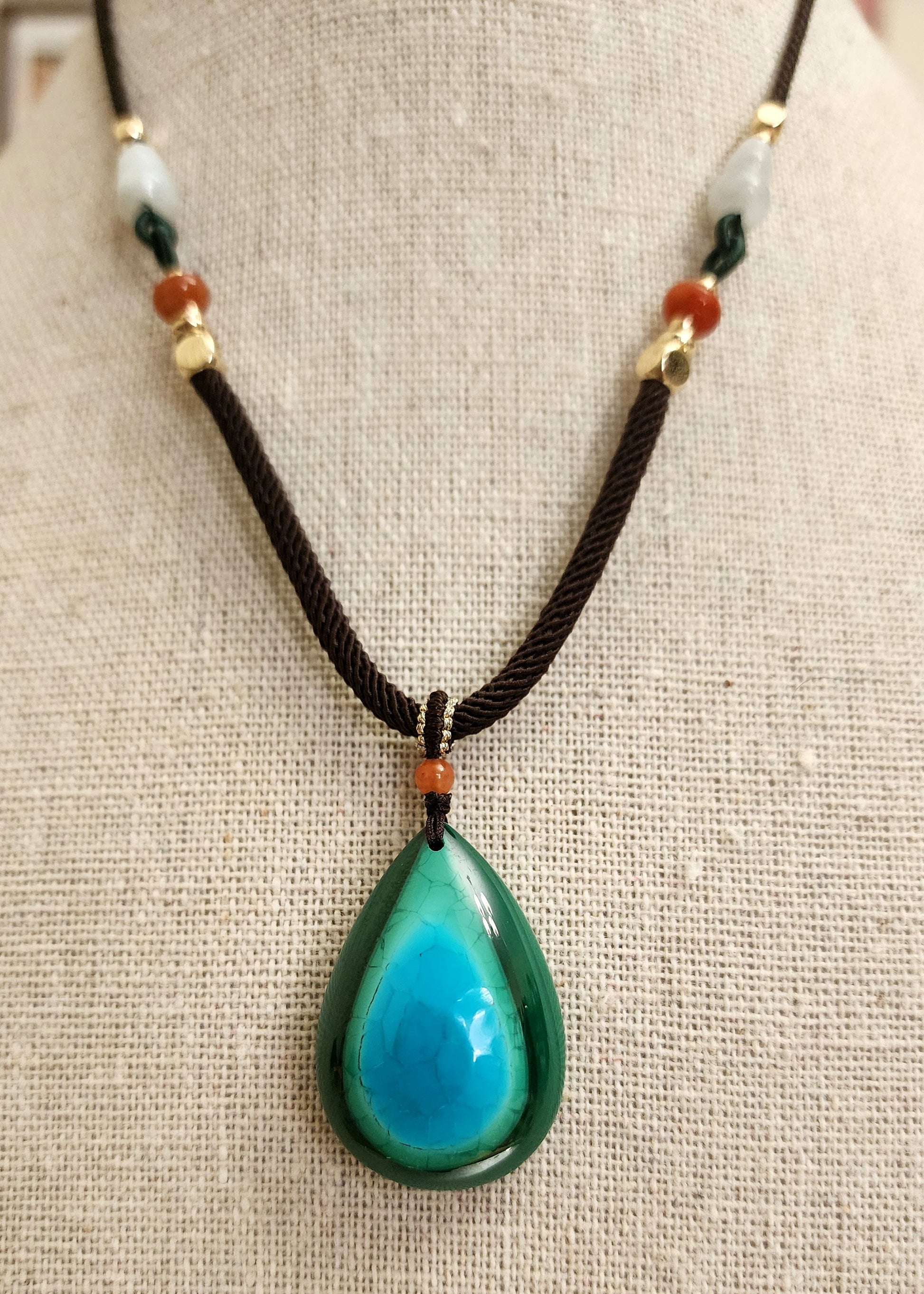 Malacholla is a combination mineral of Malachite and Chrysocholla. The pendant itself is a little over 1 inch long. The necklace cord is adjustable and can be as long as 27 inches long and decorated with jade and carnelian beads