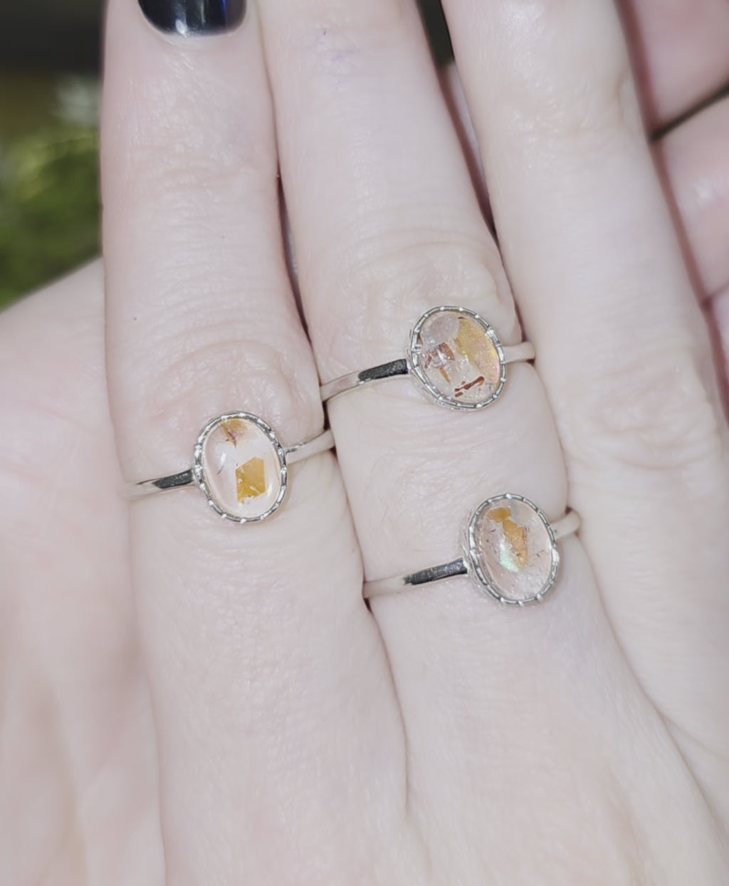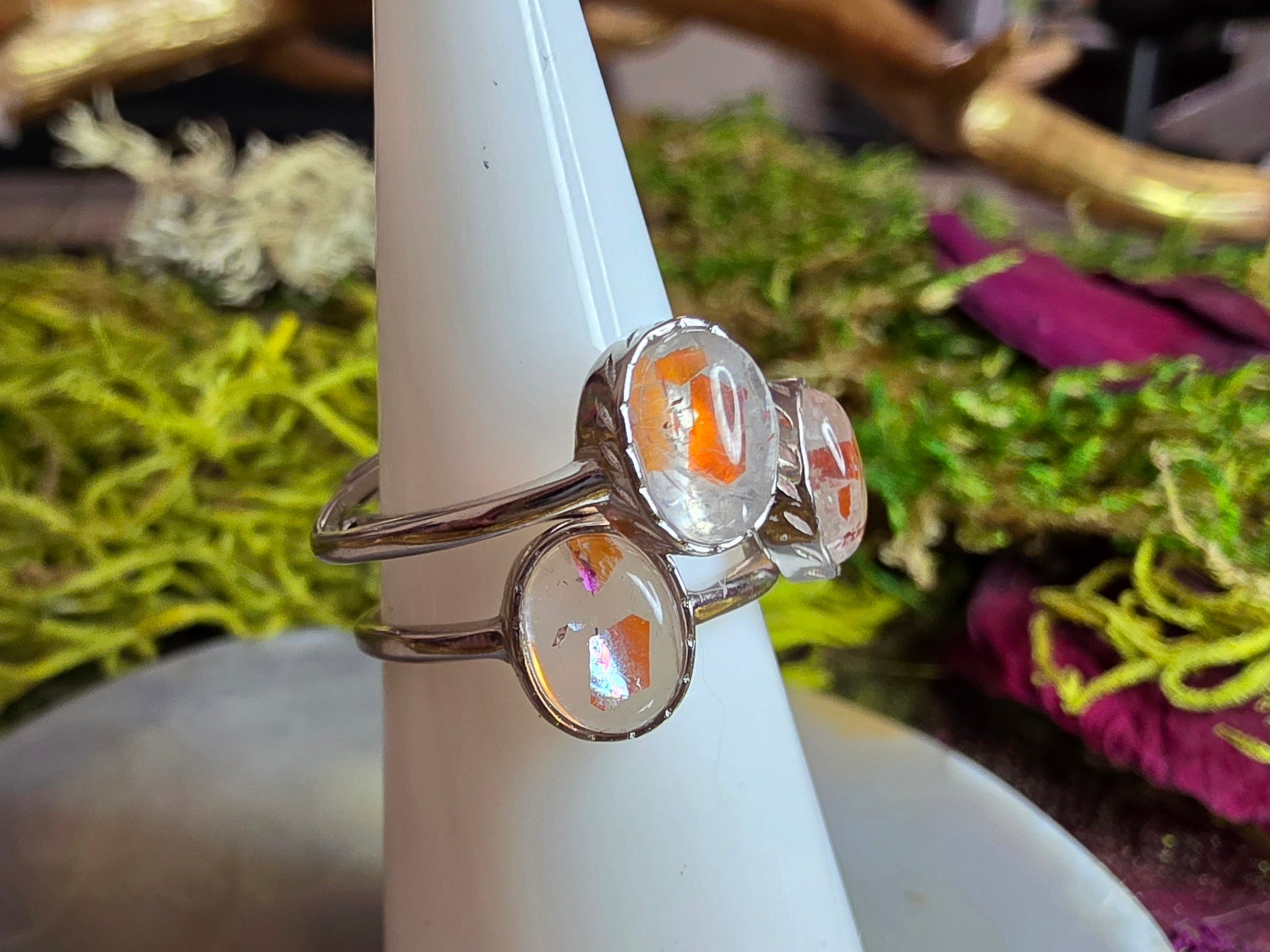 8mm clear quartz cabochon with flashy orange mica inclusions set into a simple adjustable sterling silver ring.