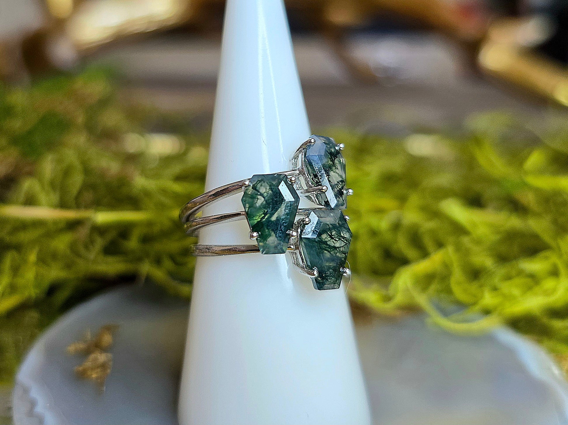 9x6mm facted moss agate coffin set into a plain adjustable sterling silver band.