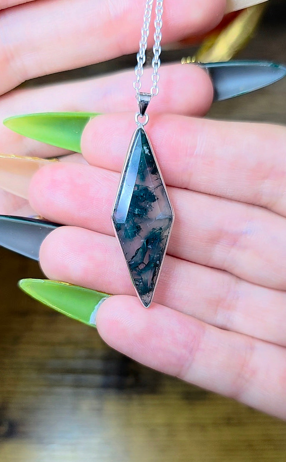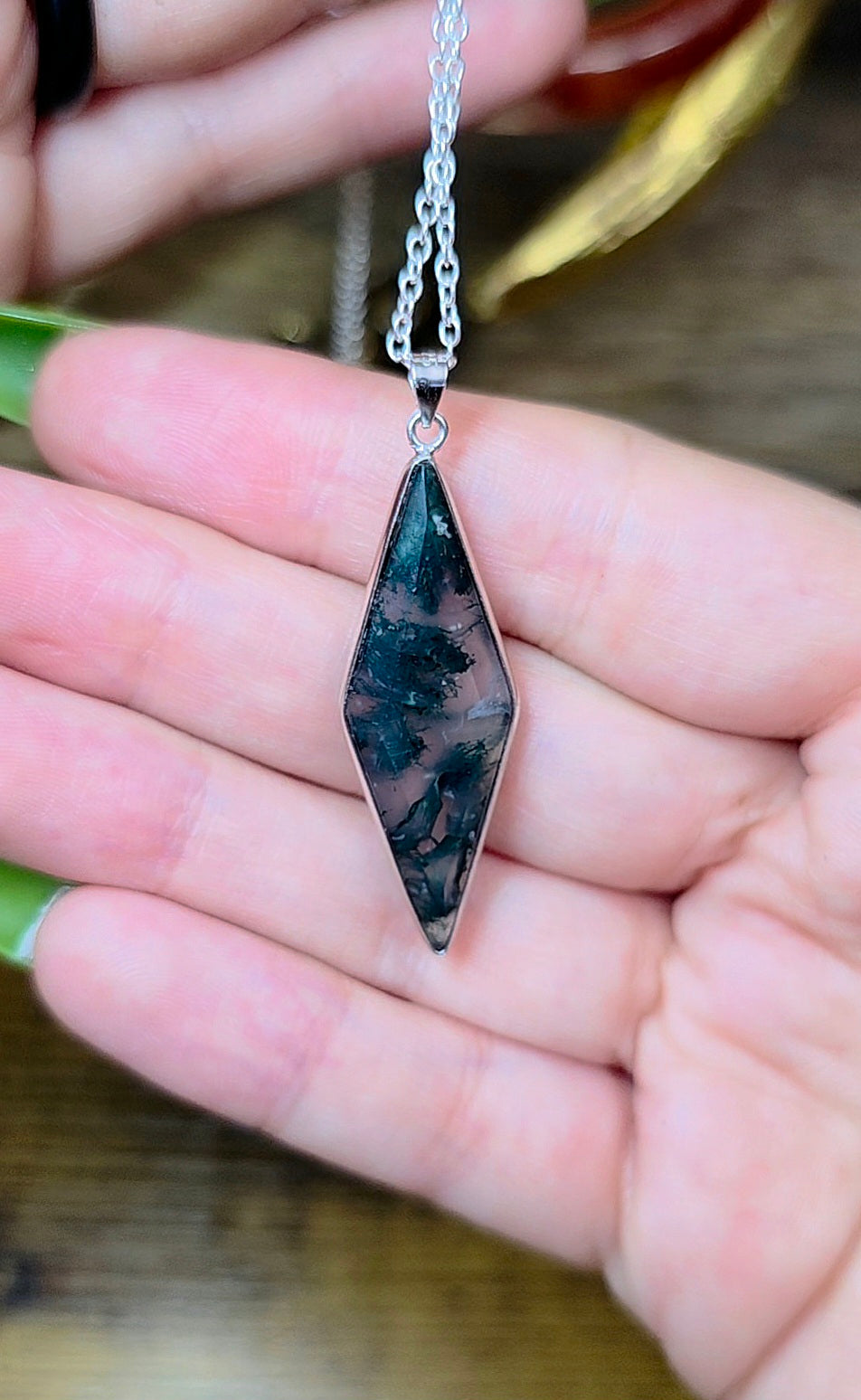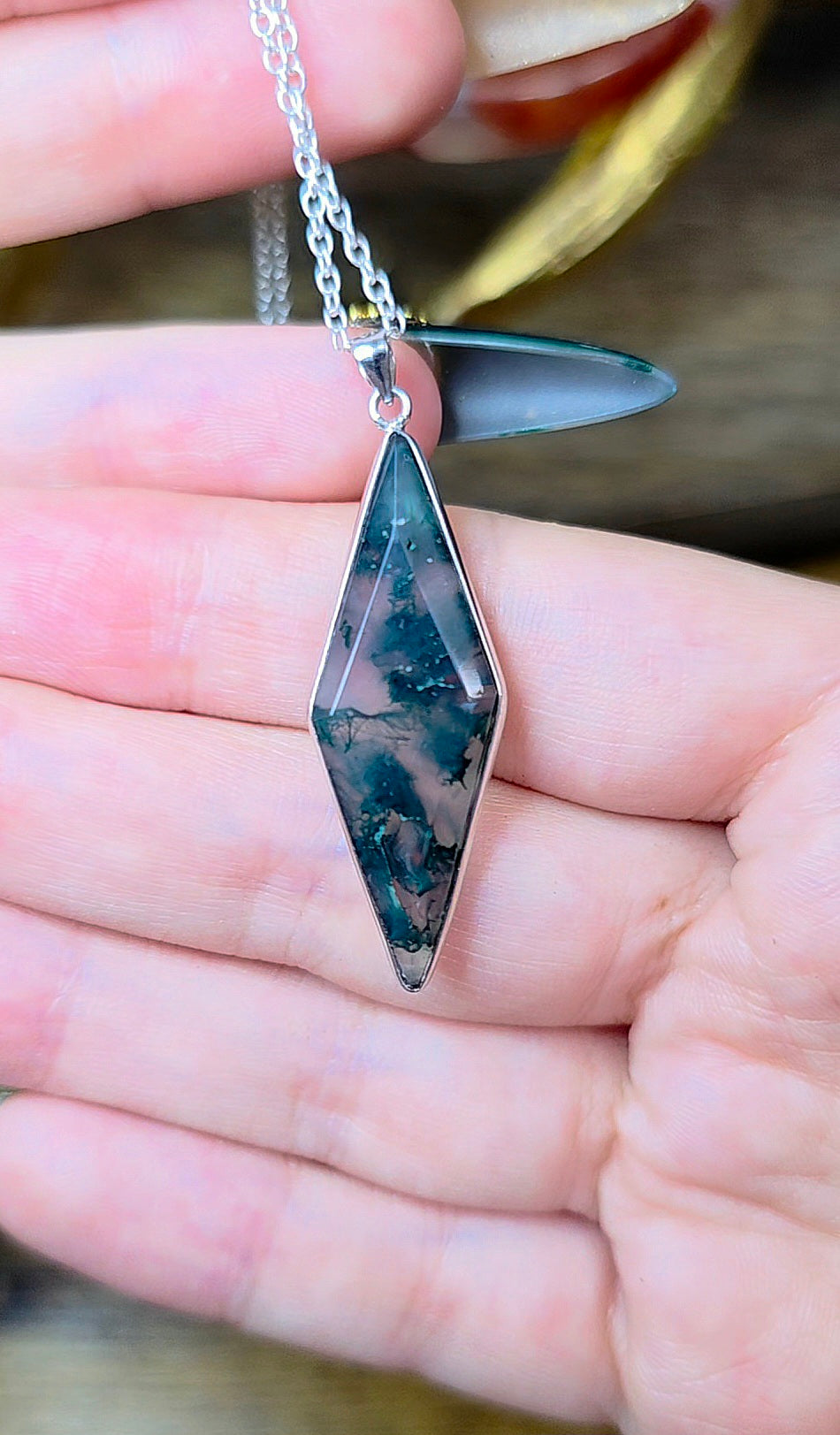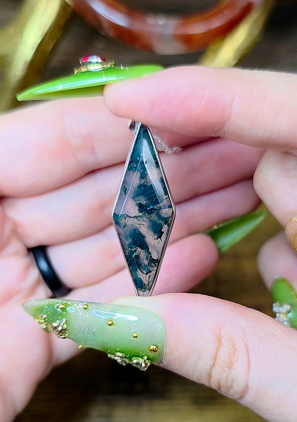 These pendants are made from carved Moss Agate and set into a sterling silver bail. The agates have beautiful green and white banding and unique patterns.