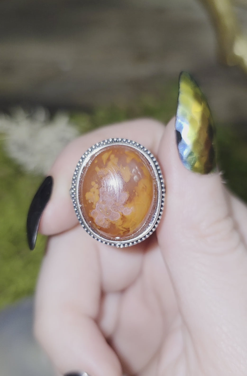 This 19mm cabochon is set into an adjustable sterling silver ring.