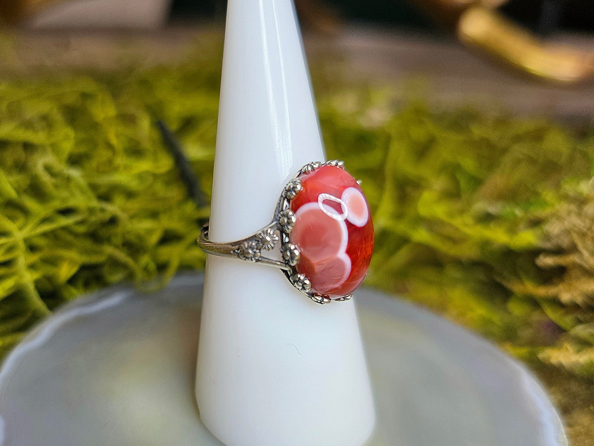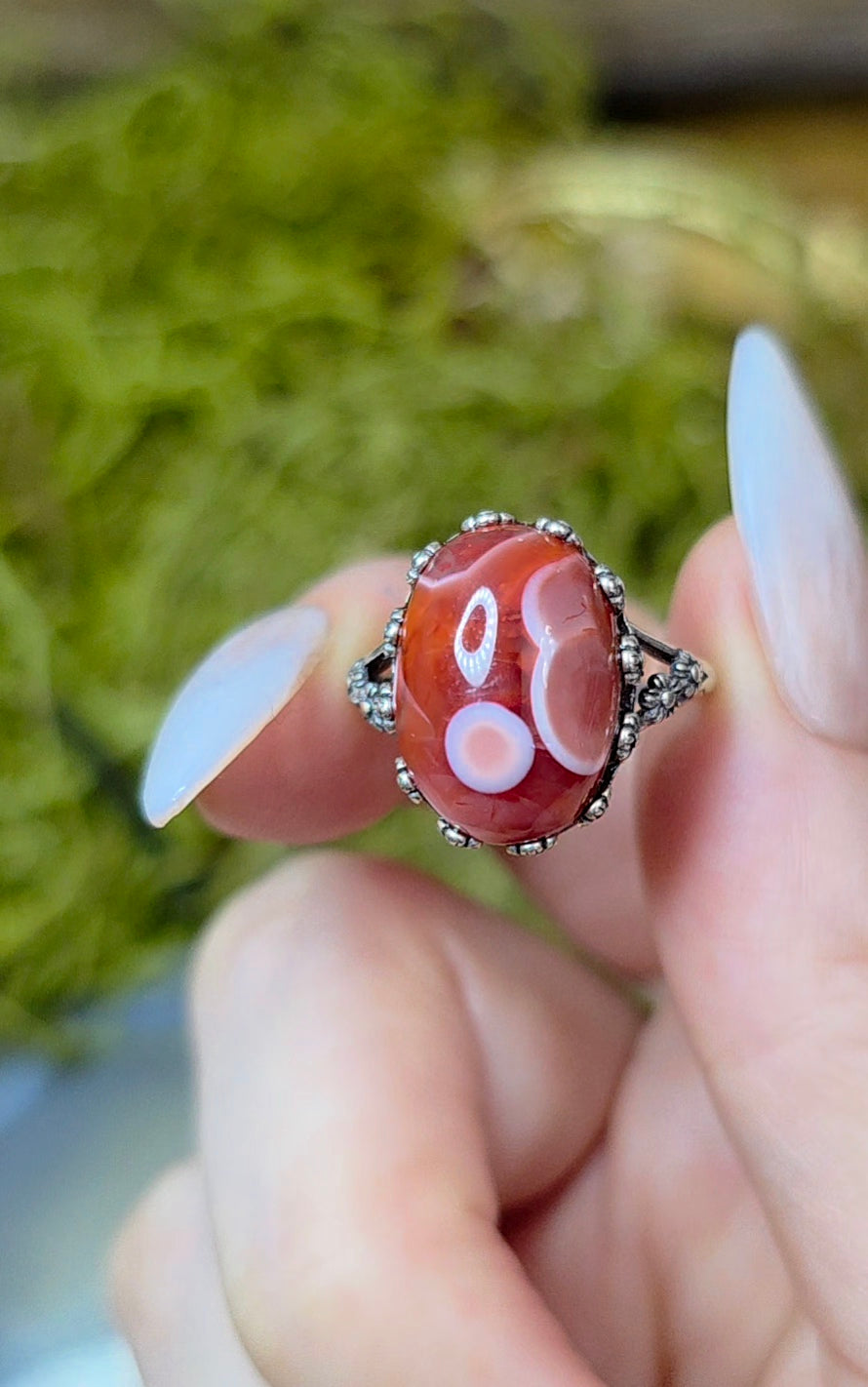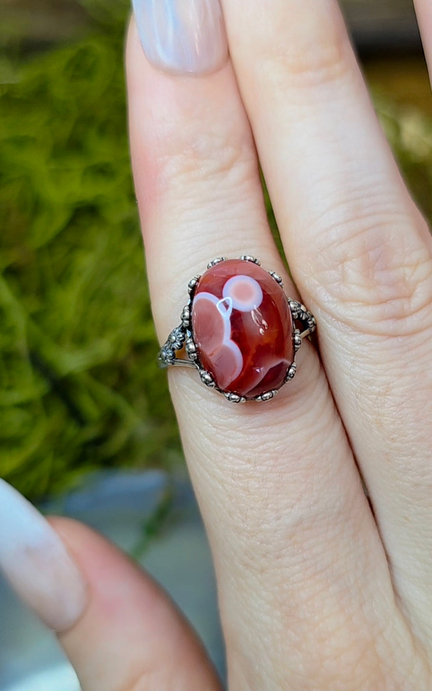 This 16x11 mm cabochon is set into an adjustable sterling silver ring that will best fit sizes 6 - 8