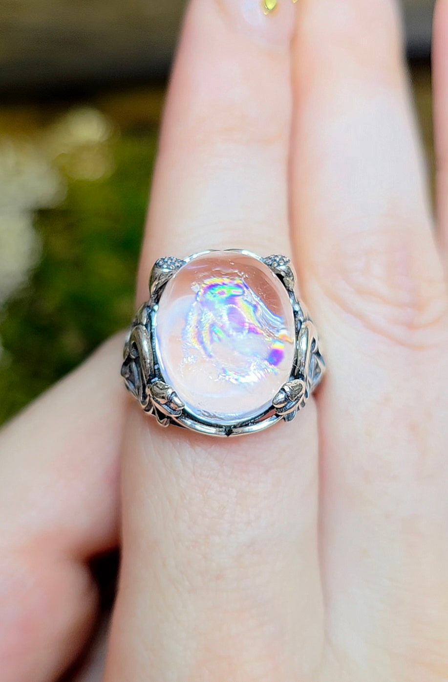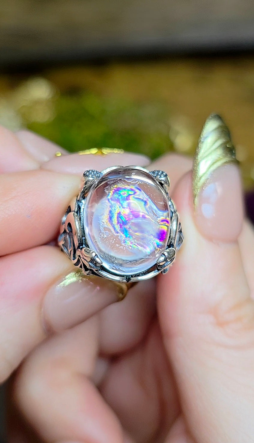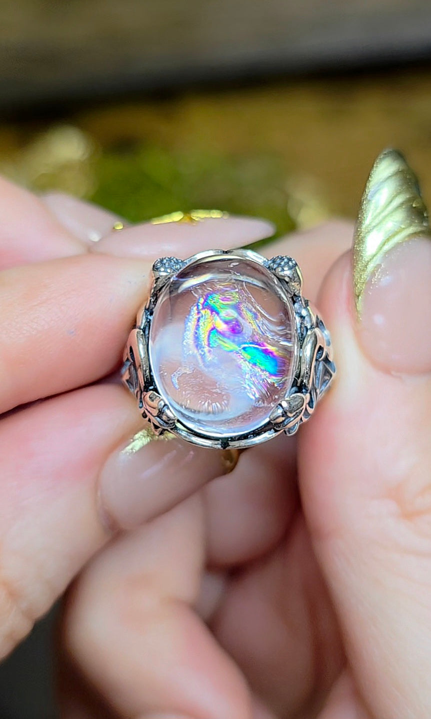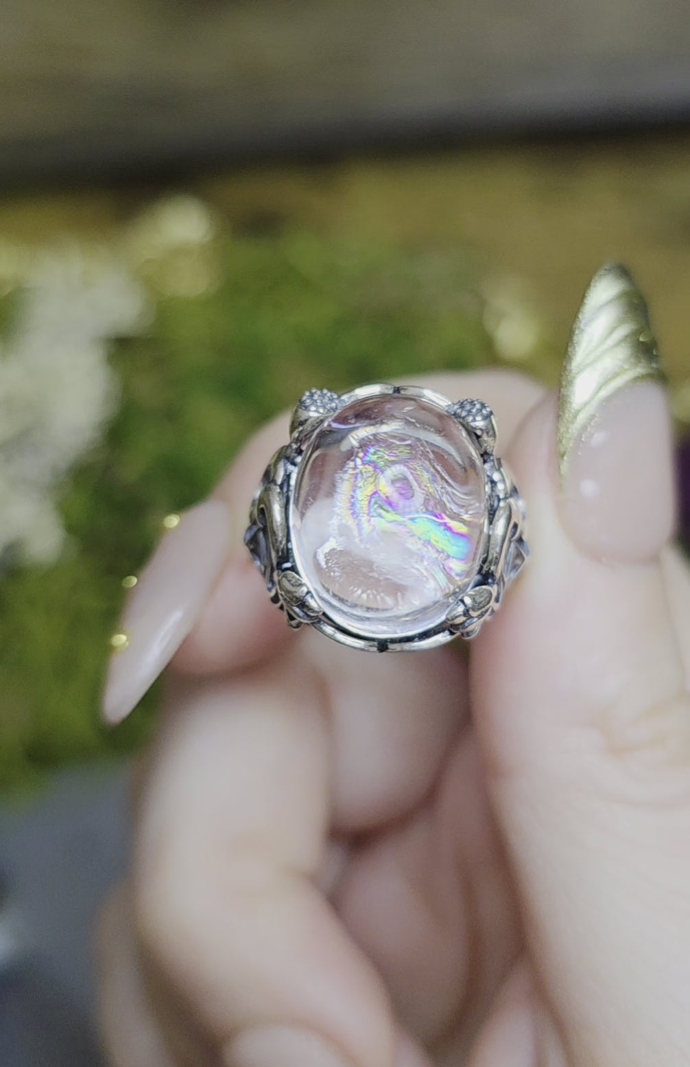This ring features a 16x13 mm clear quartz with an internal fracture that reflects the light in a way that makes it look like an oil spill. The stone is set into an adjustable sterling silver ring.