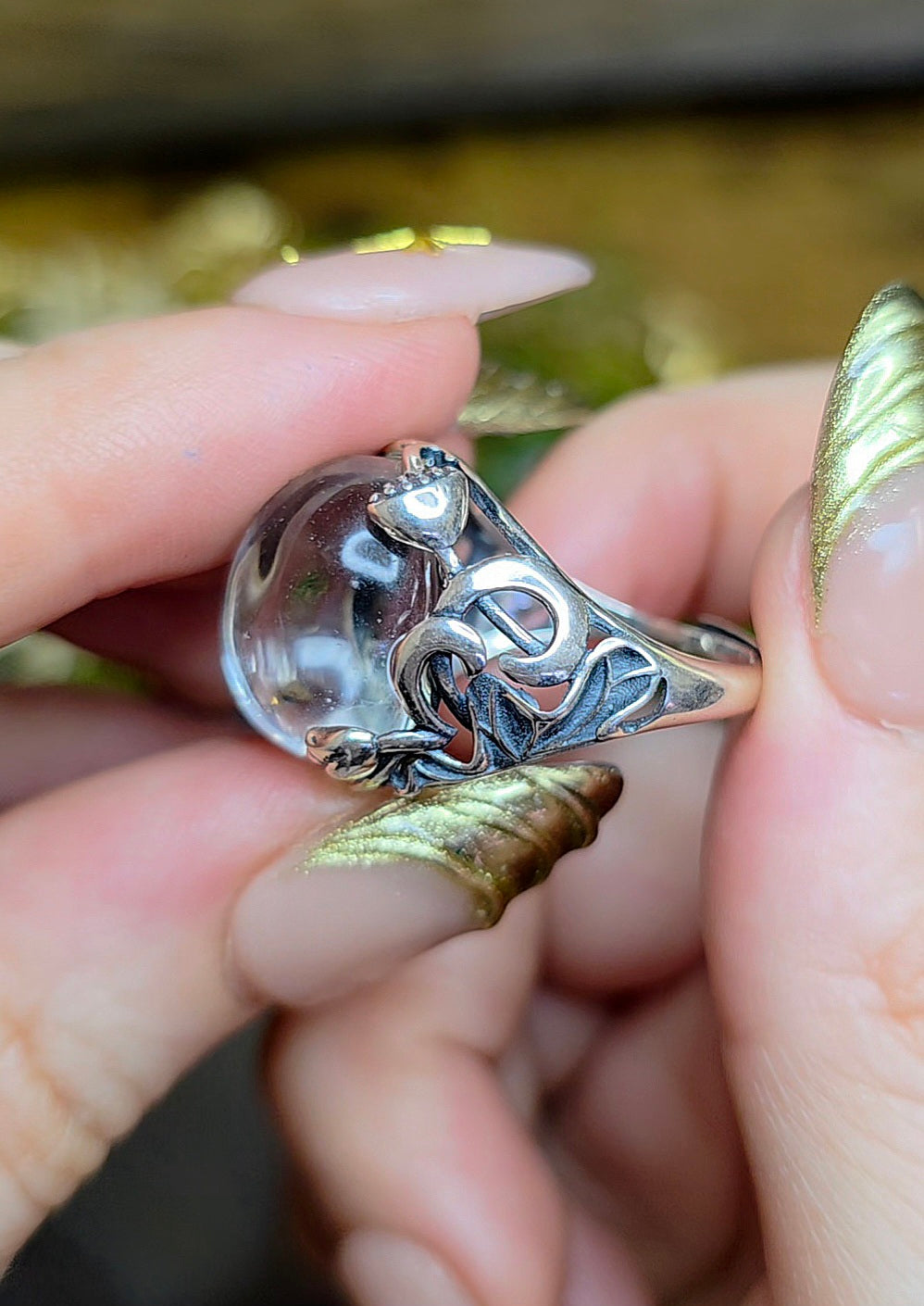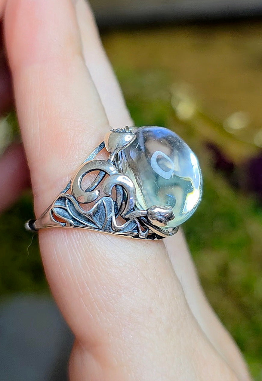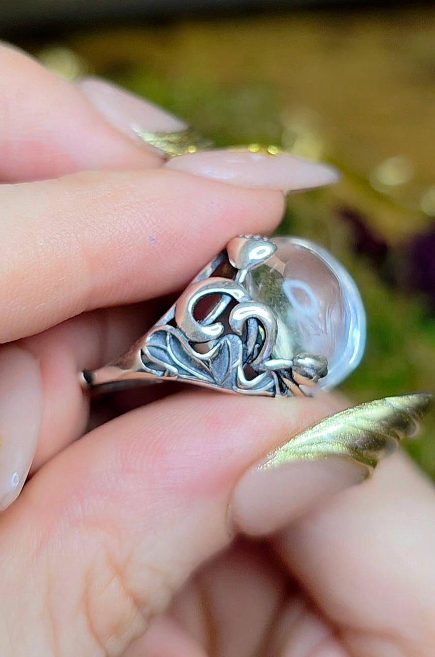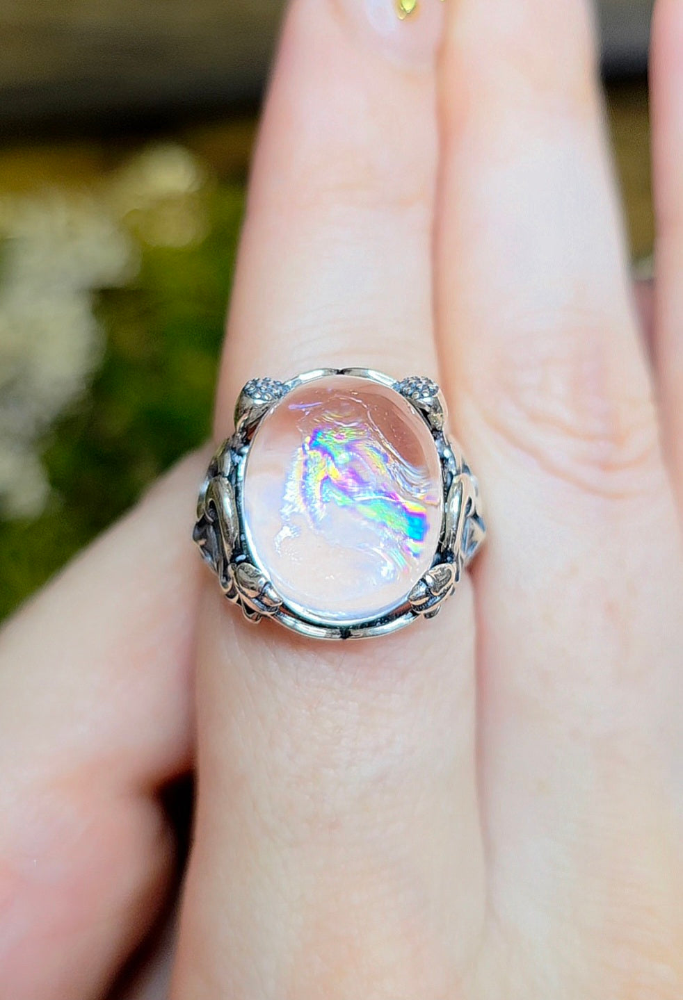 This ring features a 16x13 mm clear quartz with an internal fracture that reflects the light in a way that makes it look like an oil spill. The stone is set into an adjustable sterling silver ring.