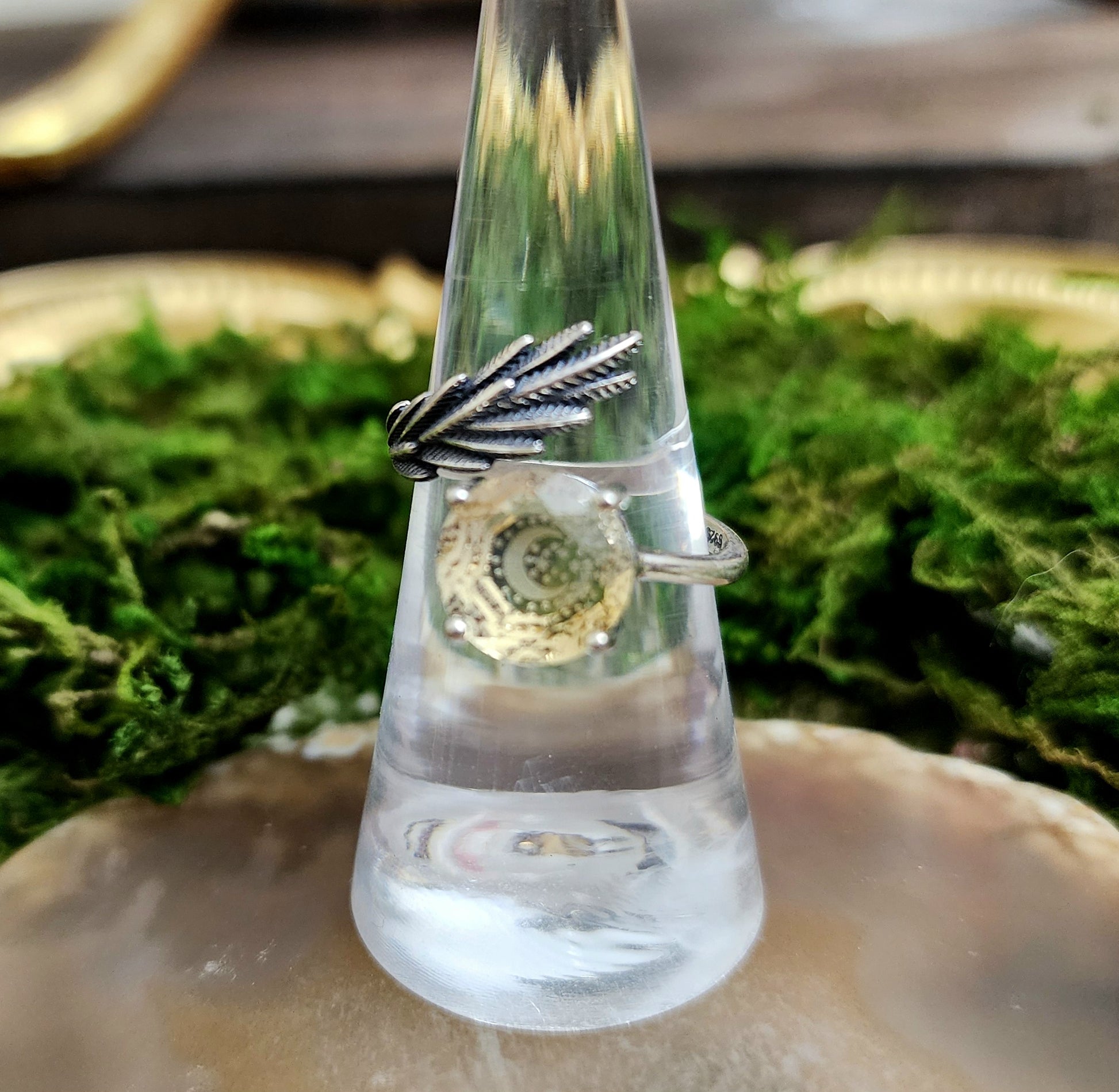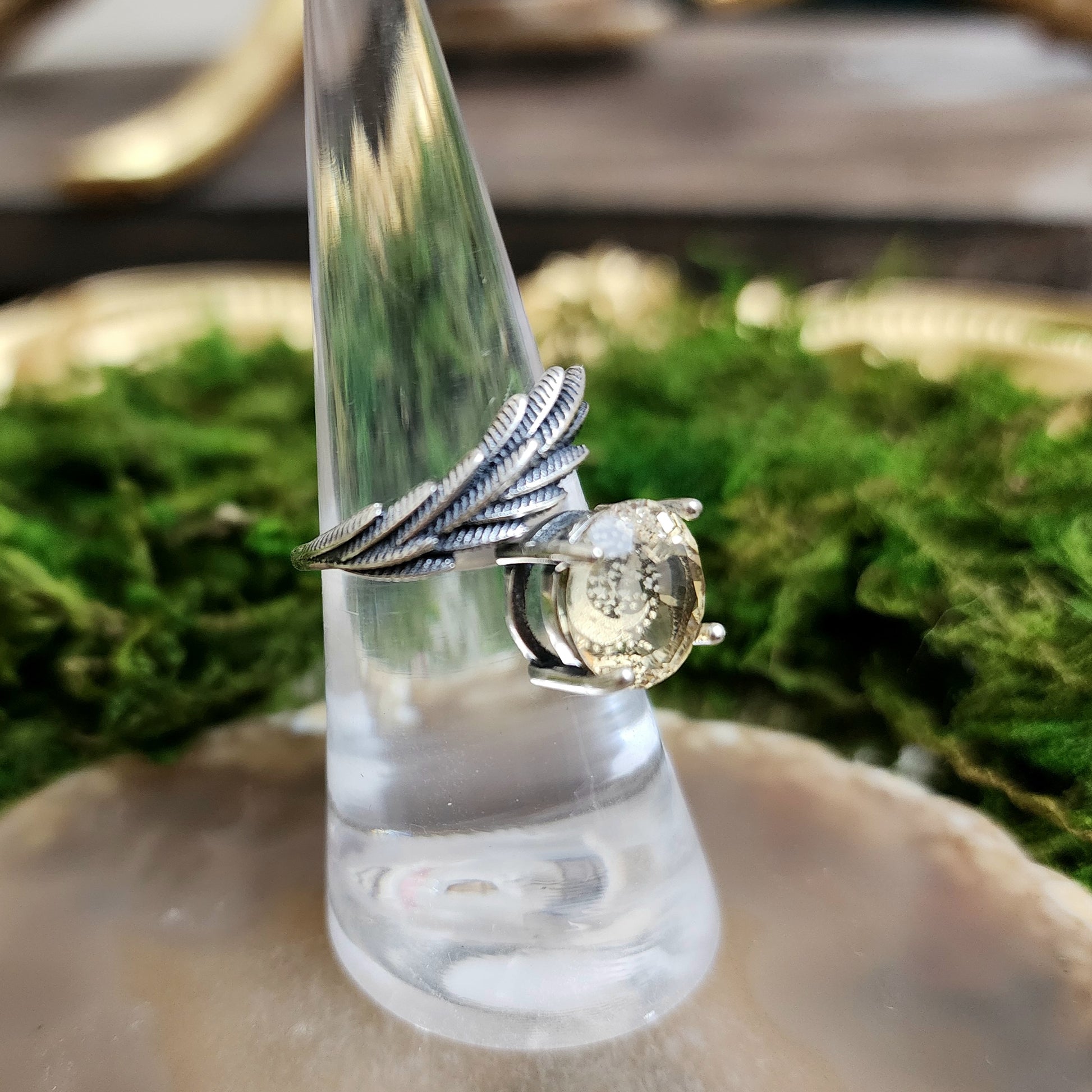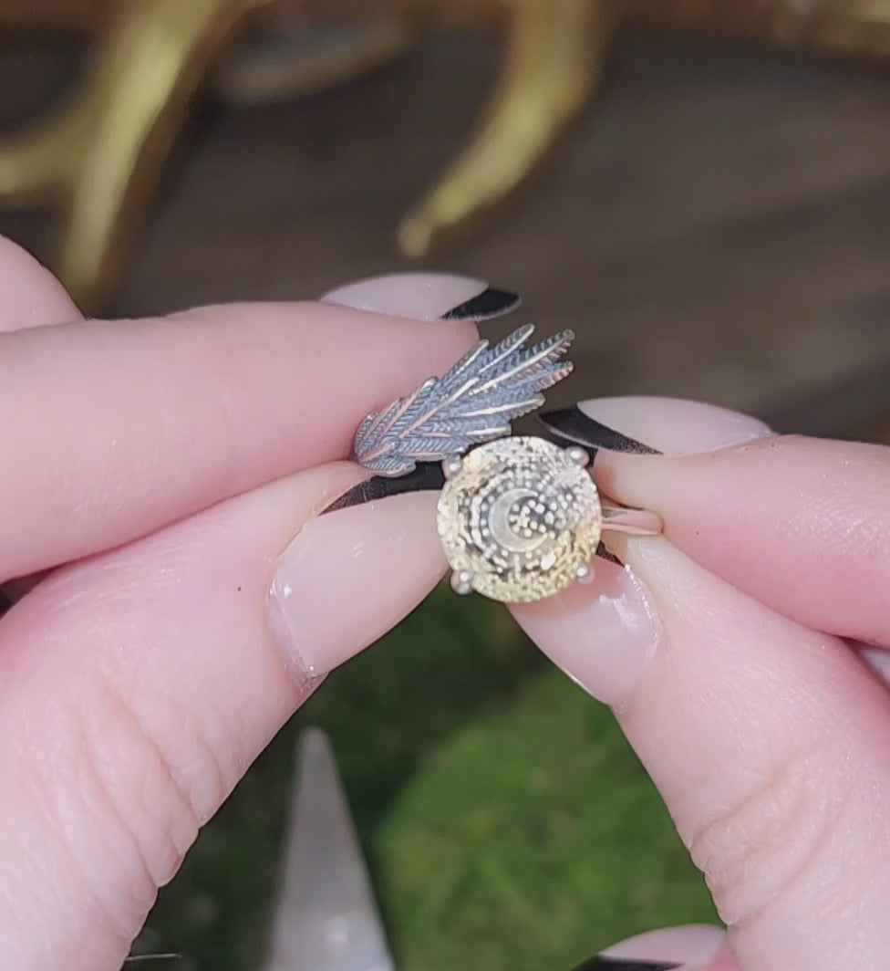 Faceted citrine with an under carving of a crescent moon and stars and set into an adjustable sterling silver ring with wing details.