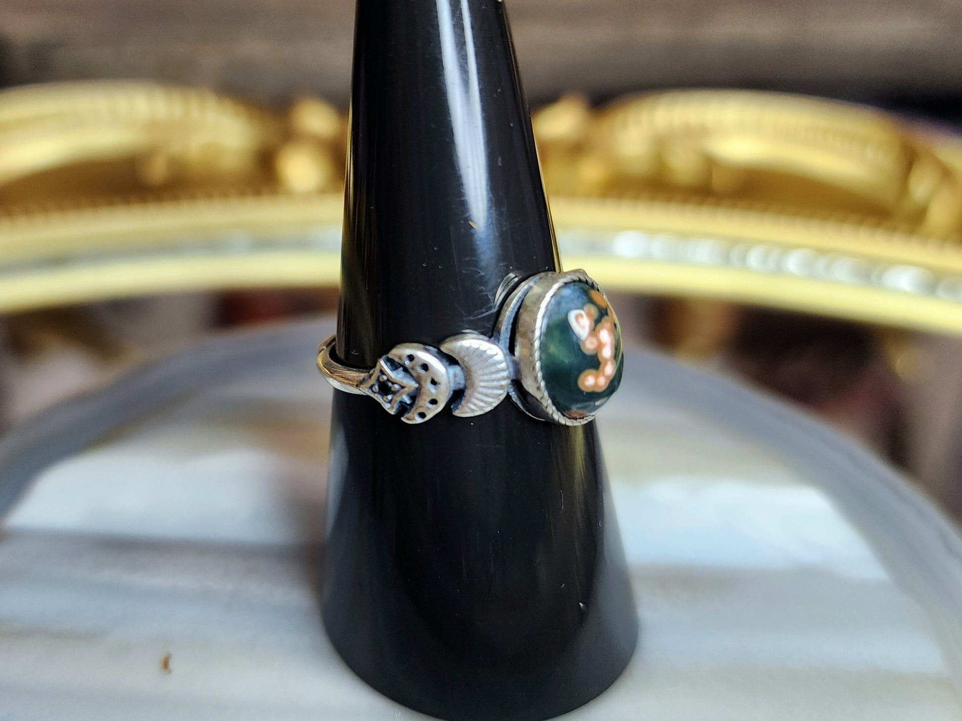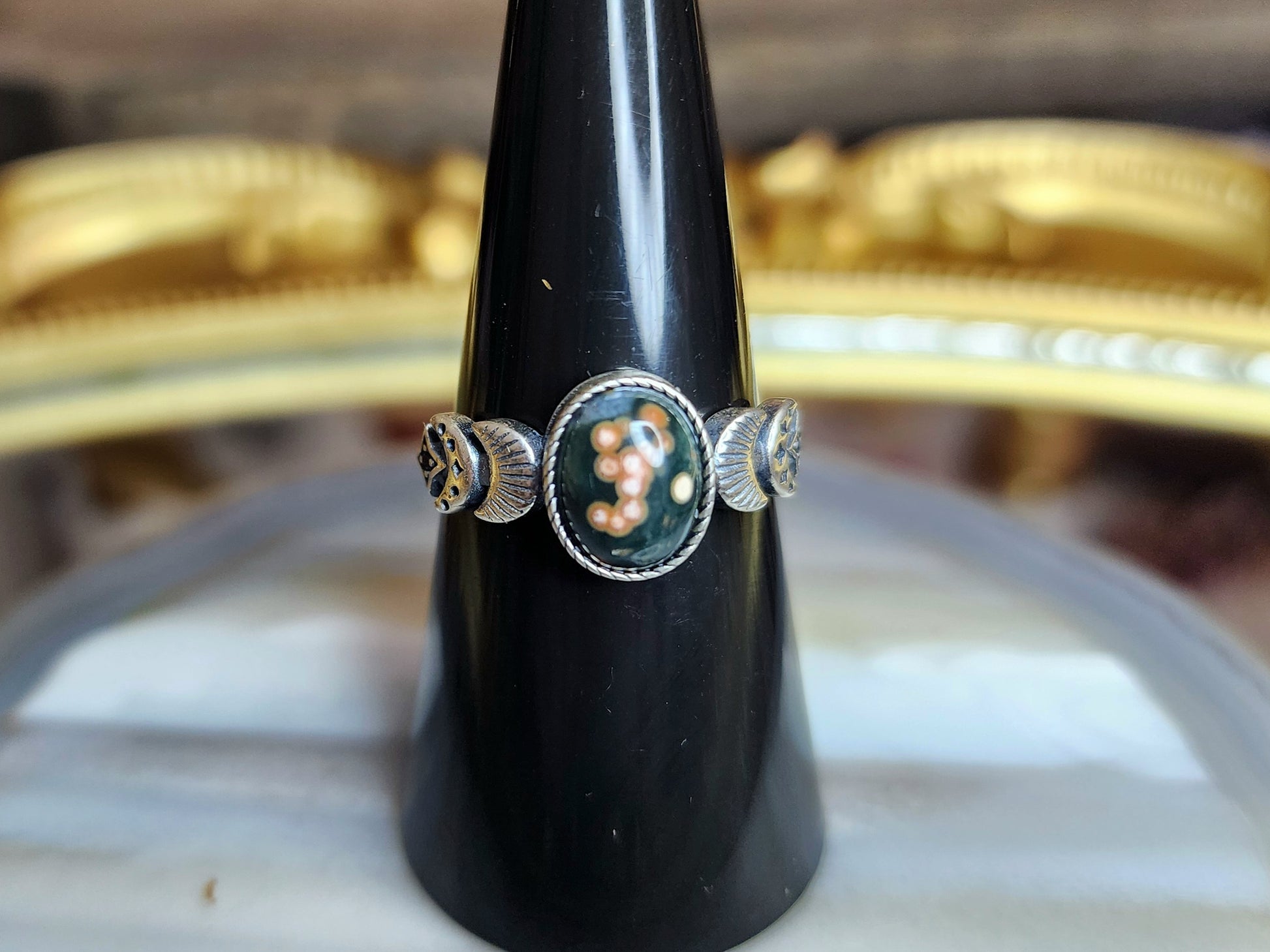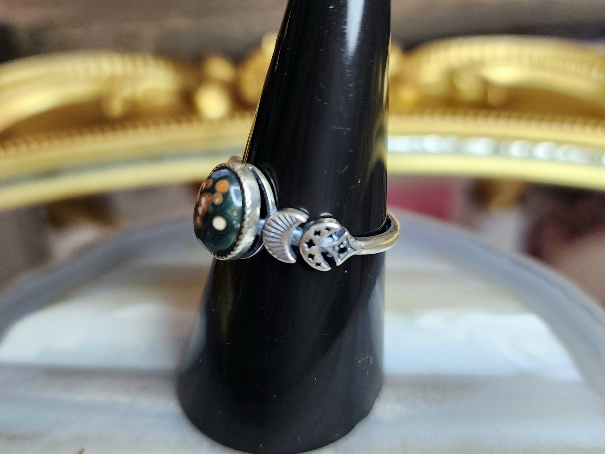 Intricate orbicular sea jasper cab set into an adjustable sterling silver ring with a moon and star design.