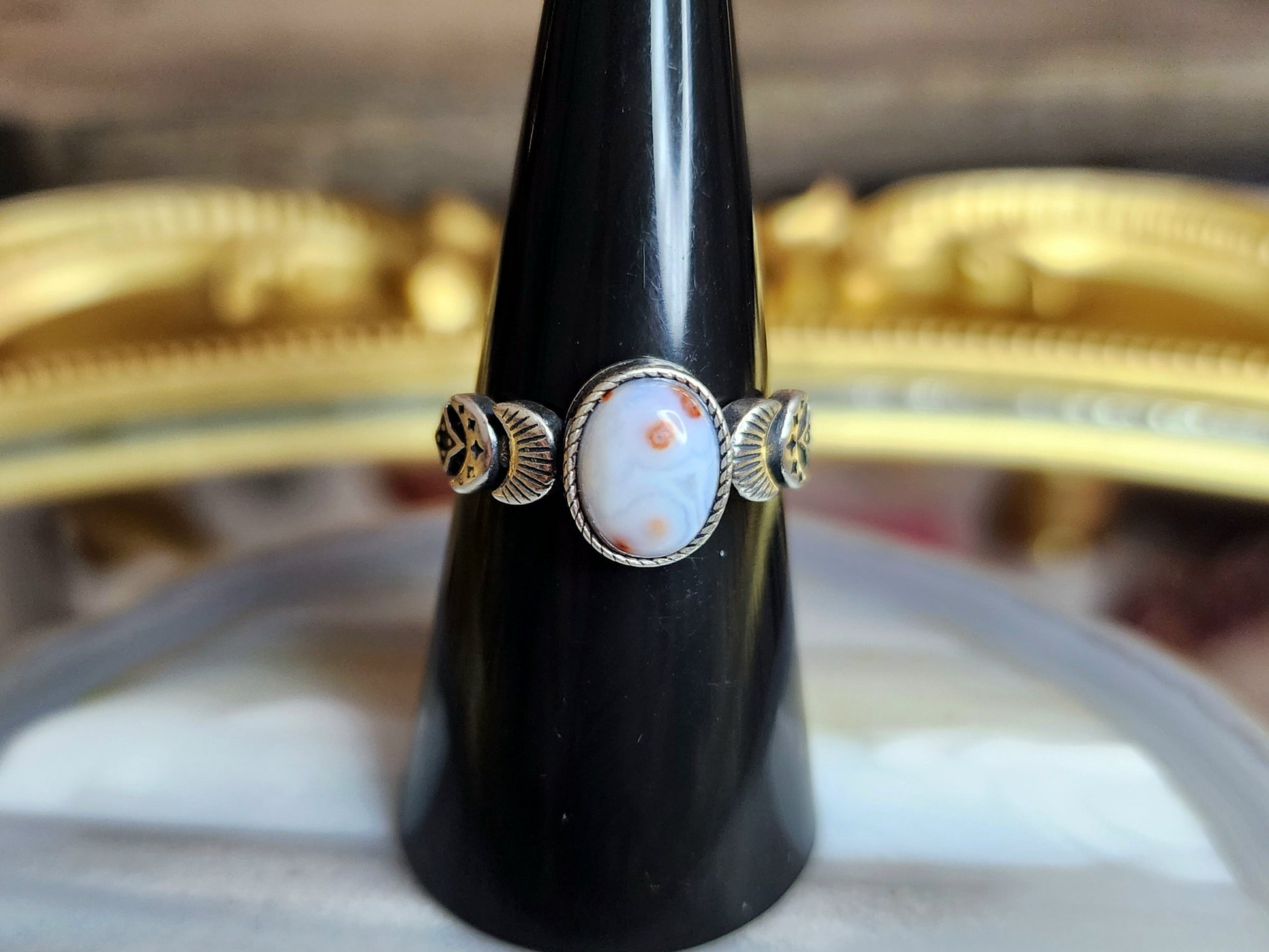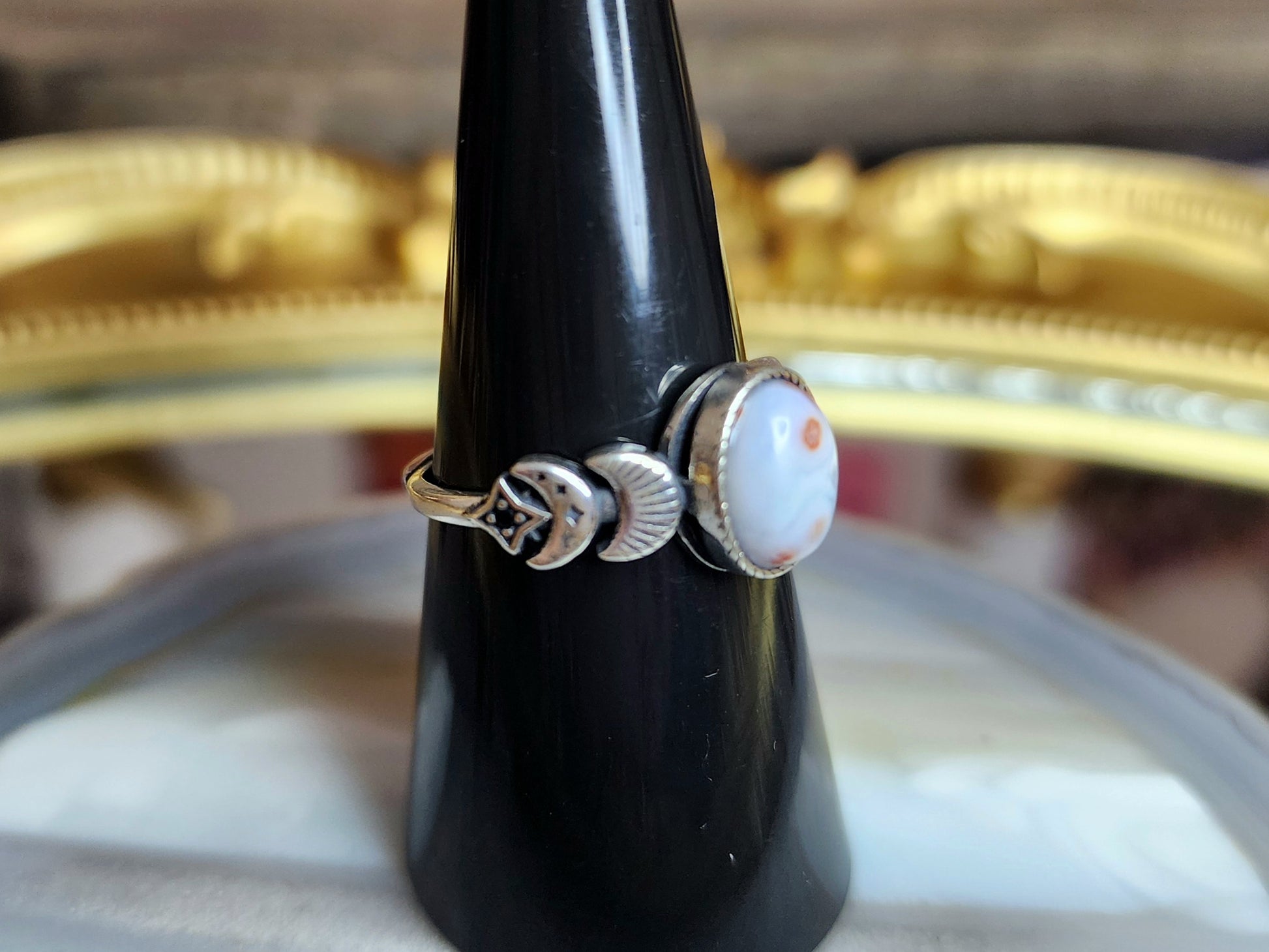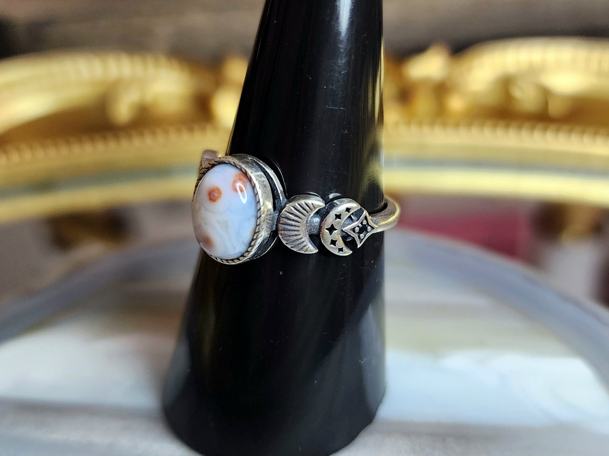Intricate orbicular sea jasper cab set into an adjustable sterling silver ring with a moon and star design.