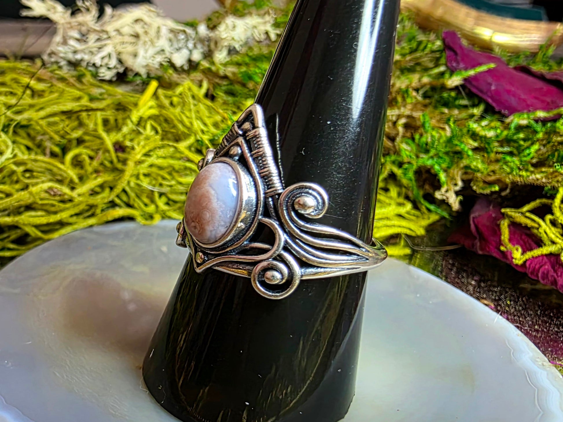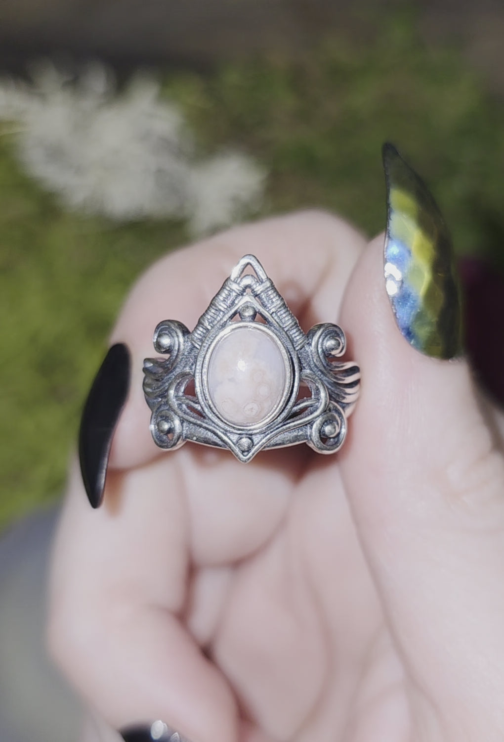 7mm orbicular sea jasper cab set into an adjustable sterling silver ring with a wire wrap-style design.