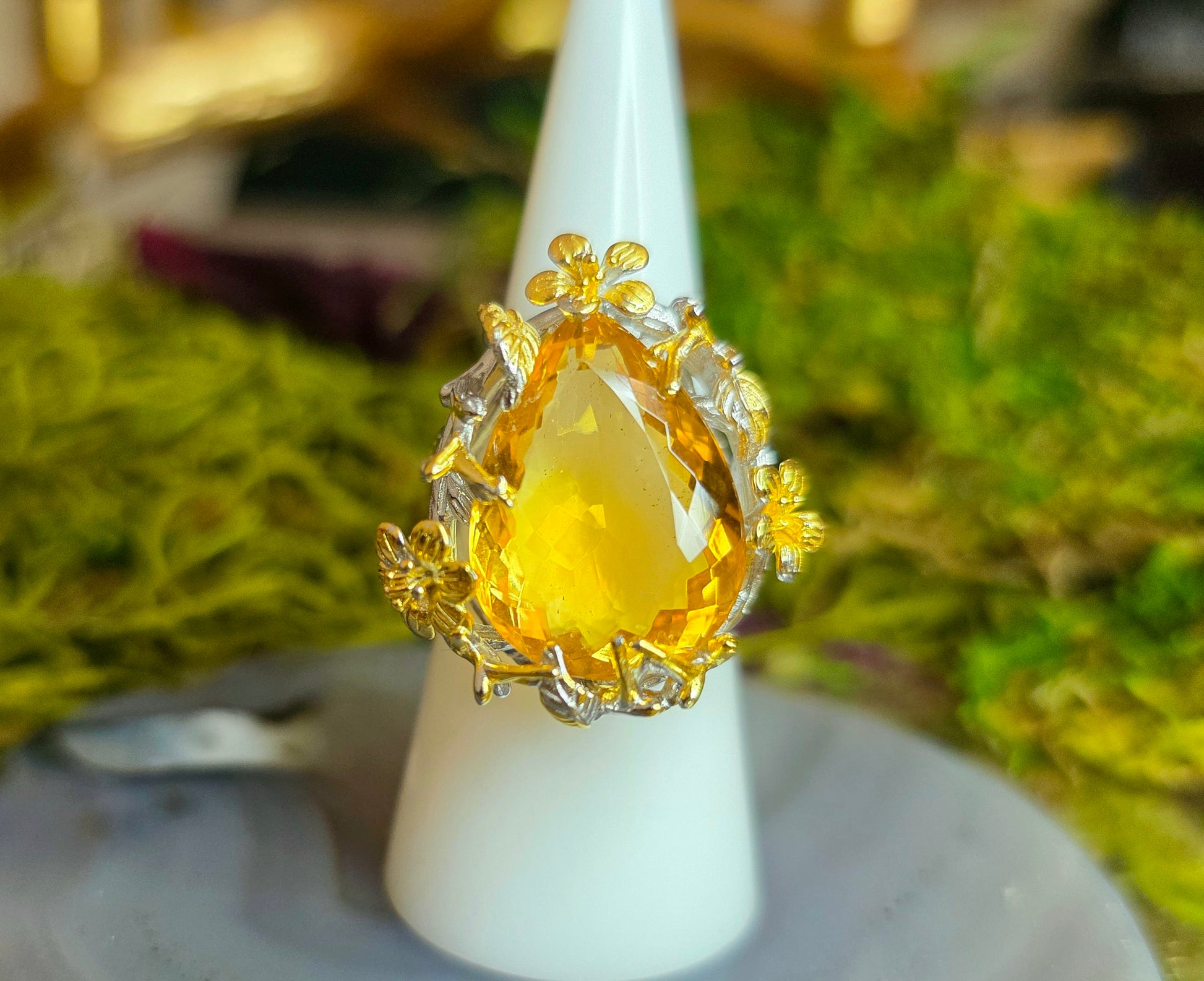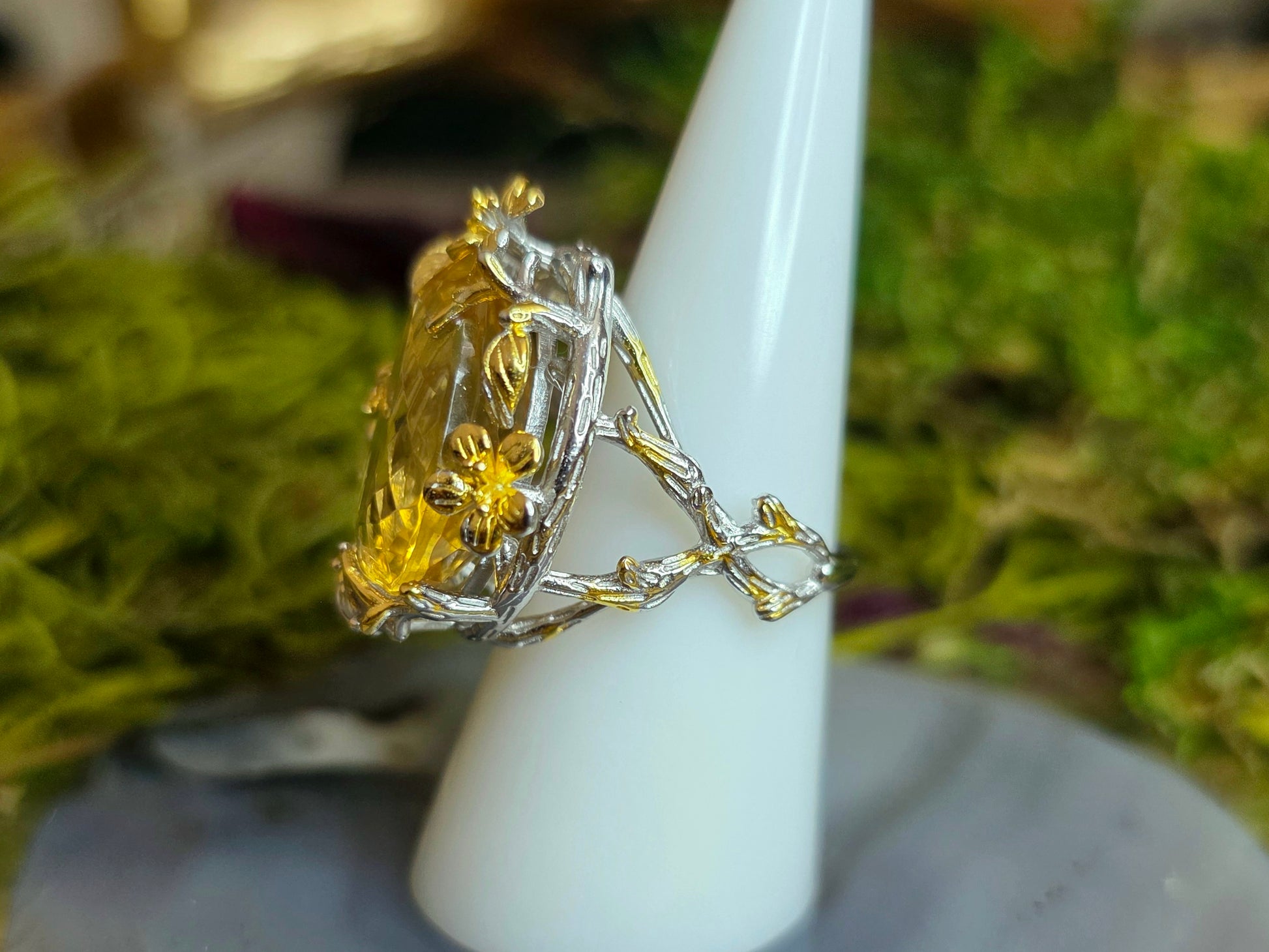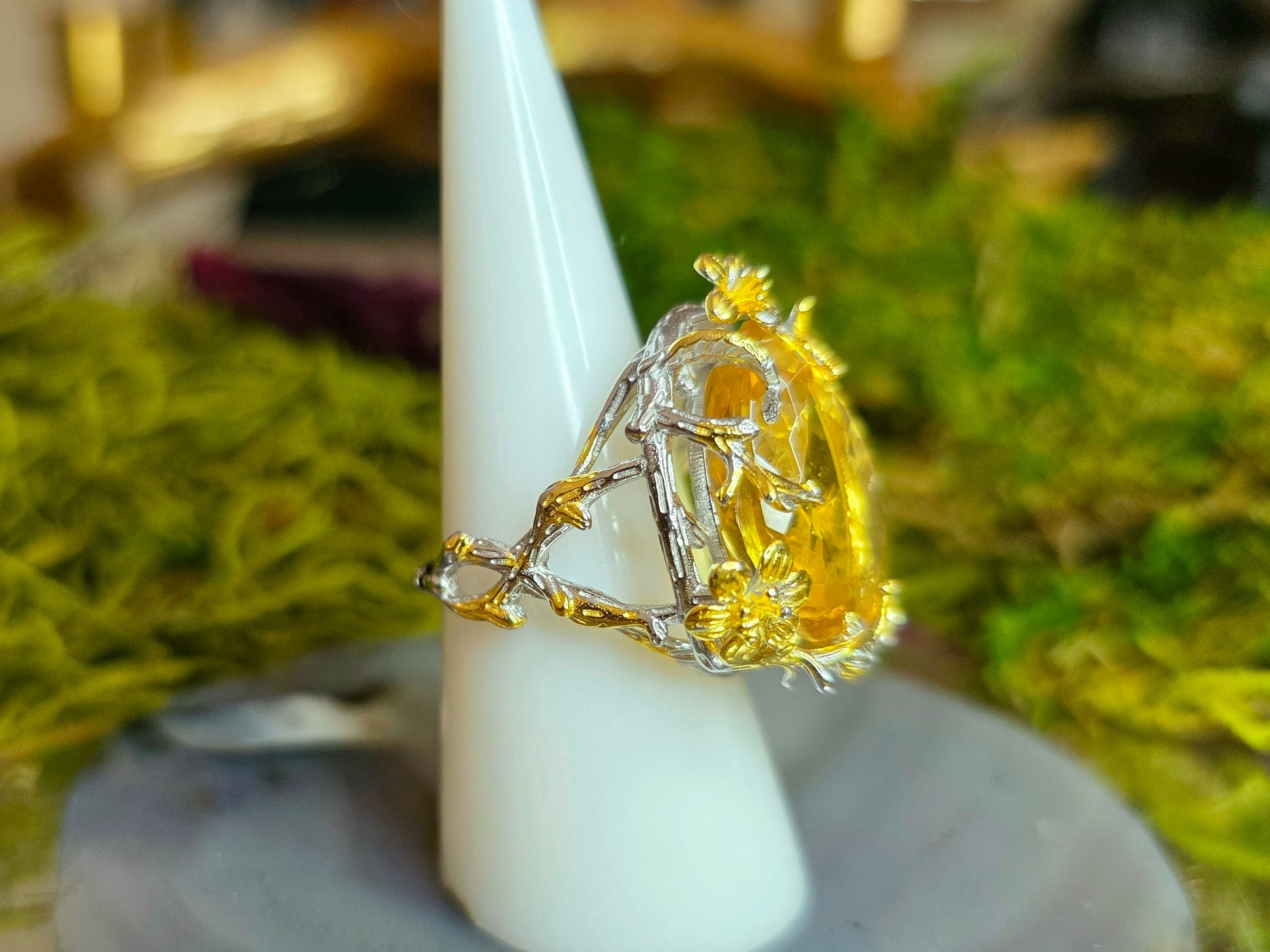 21mm citrine that has been faceted and set into a gold plated adjustable sterling silver ring with branch and flower details.