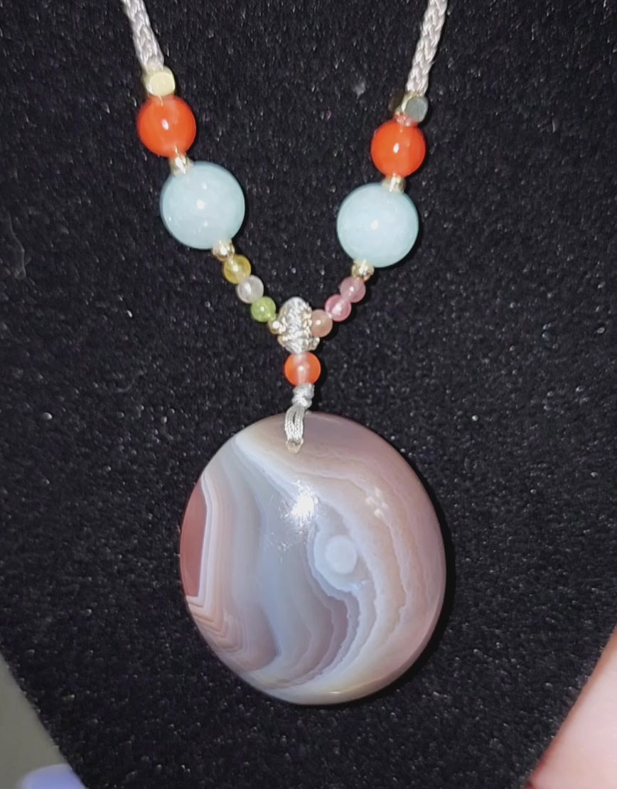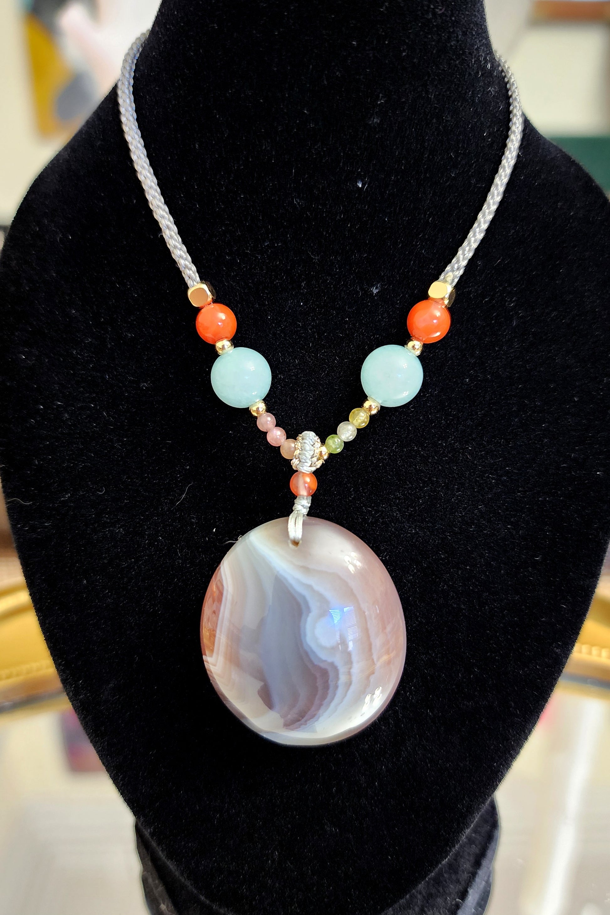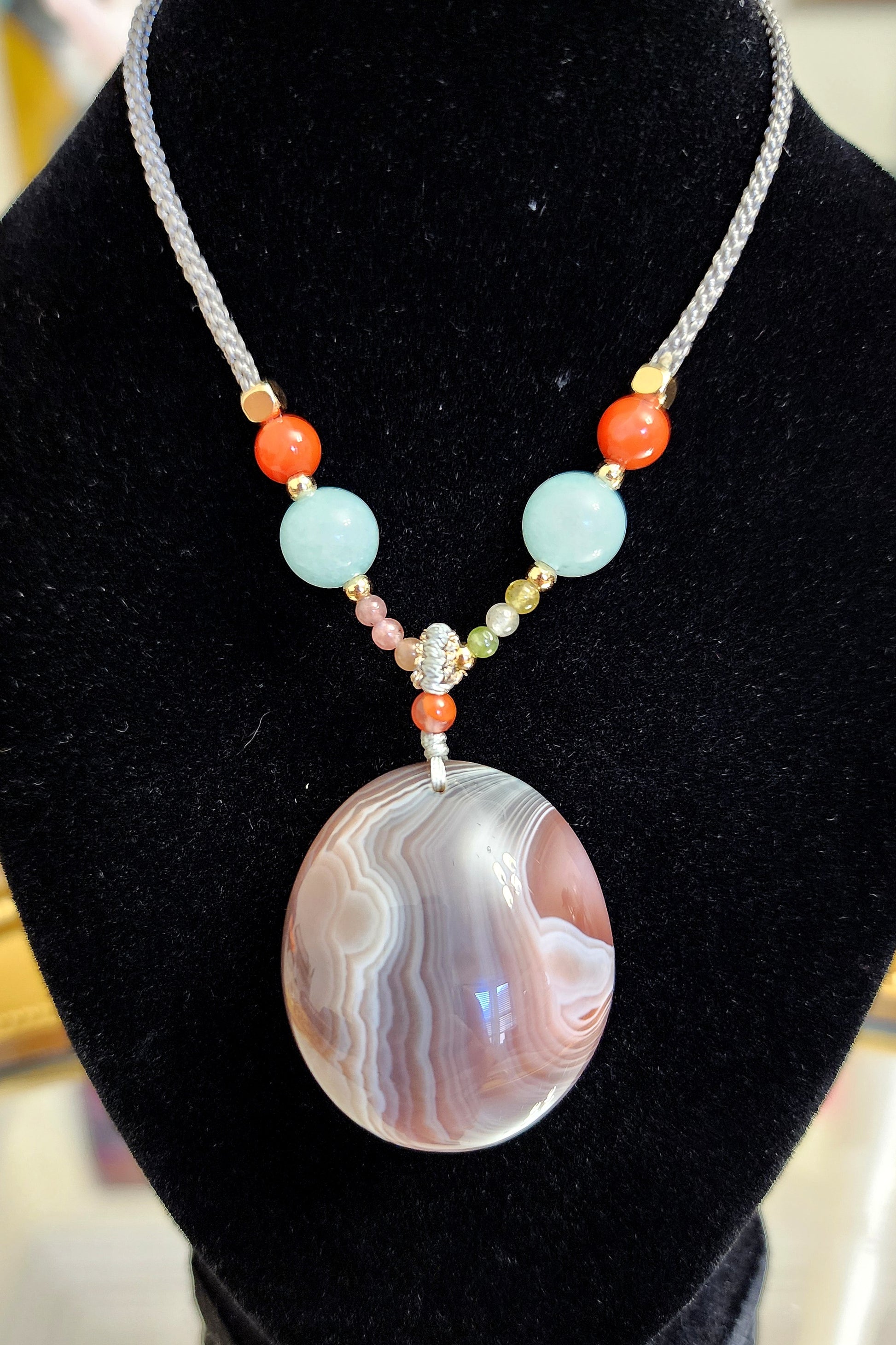 Pink Botswana agate freeform pendant wrapped in an adjustable cord necklace that can be as long as 26 inches. The cord is decorated with carnelian, aquamarine, and tourmaline beads.