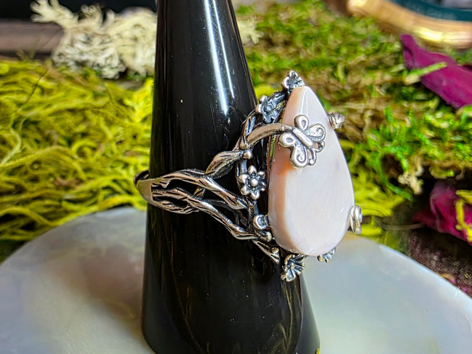 This 20mm cabochon is set into an adjustable sterling silver ring with branch and floral details.