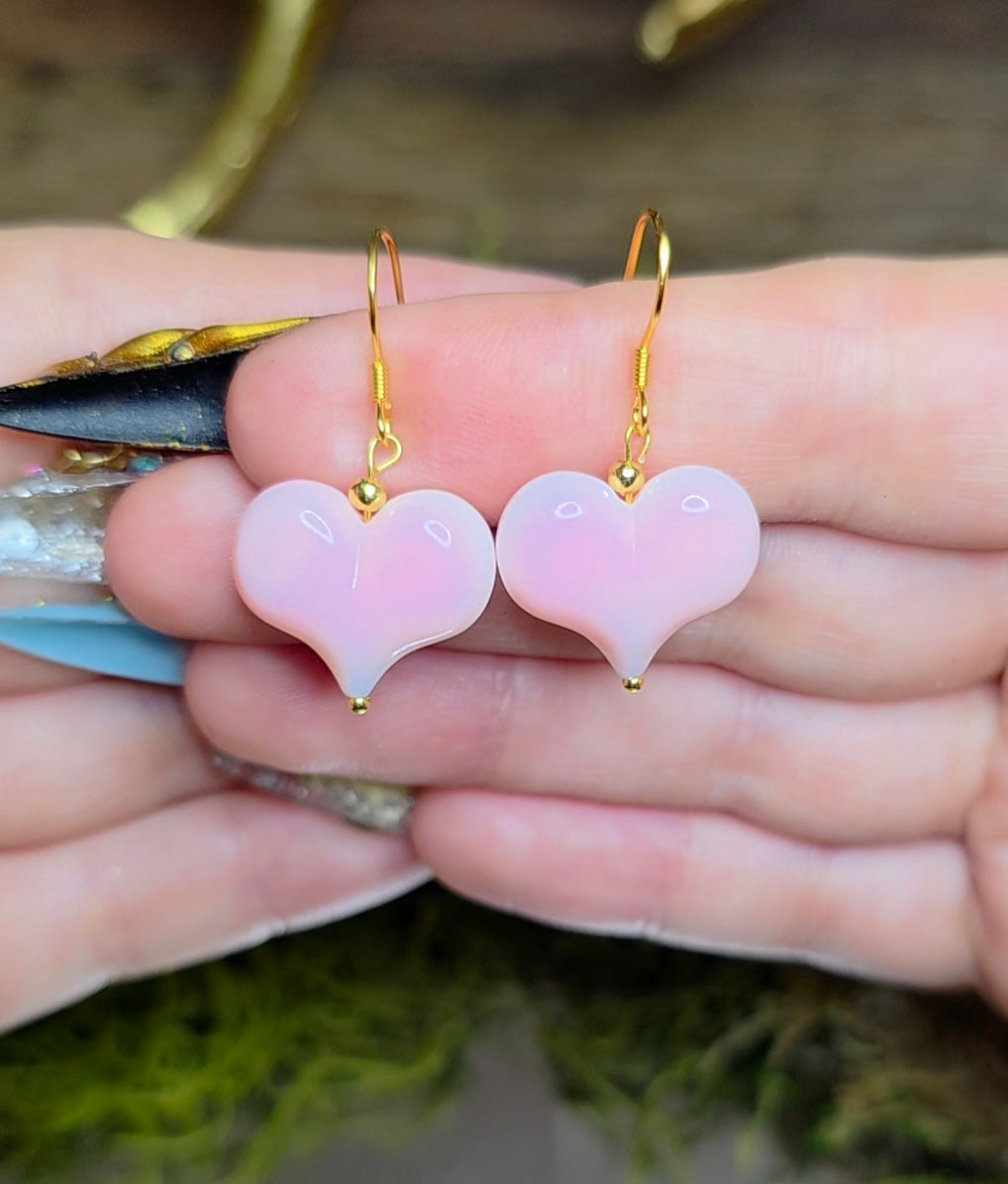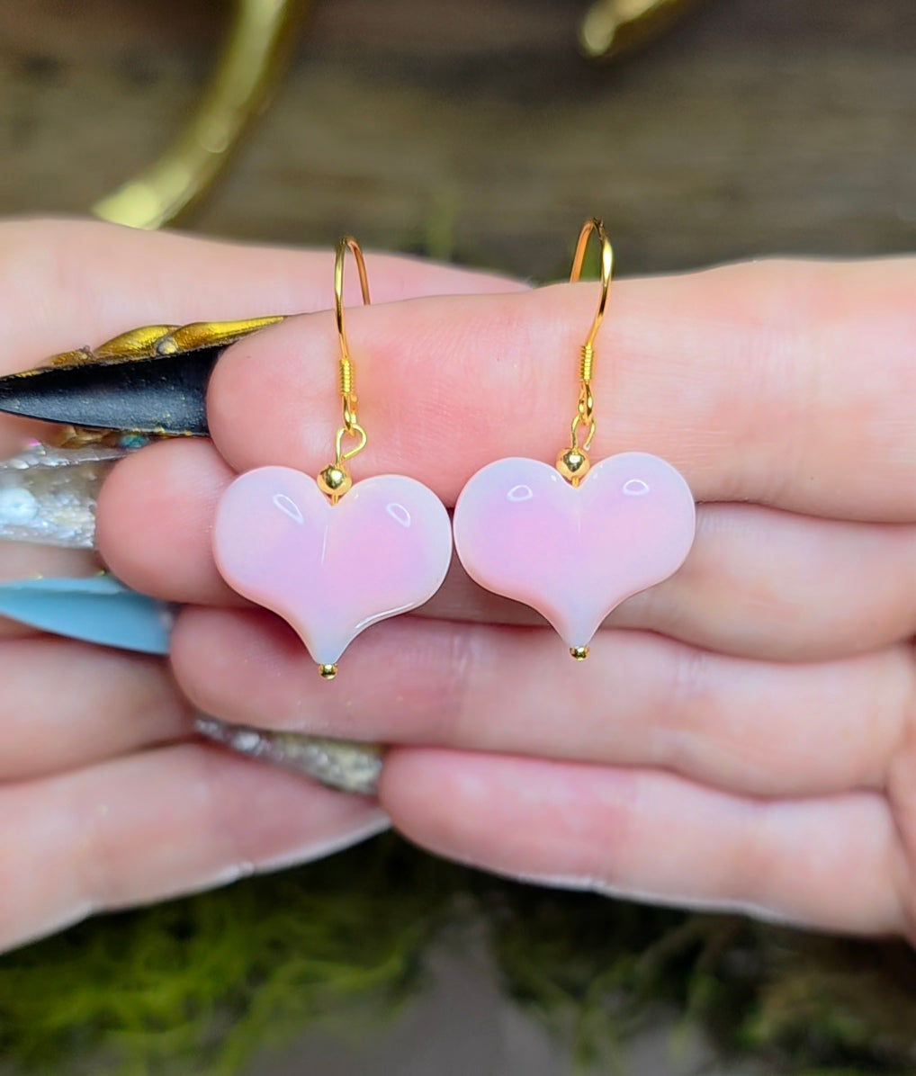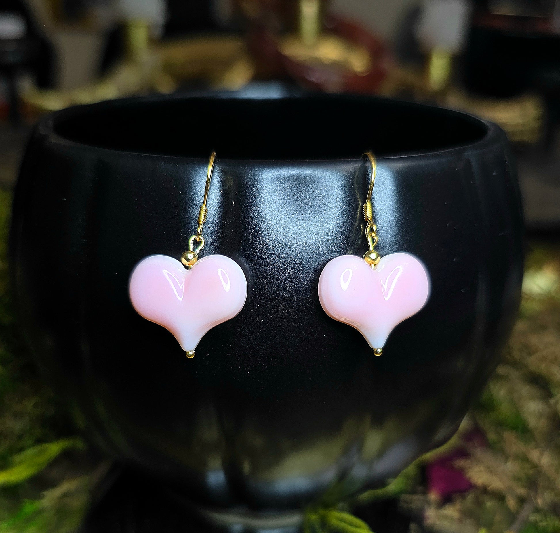 15x18mm pink shell carved into heart shapes amd set into gold plated sterling silver earring hooks.