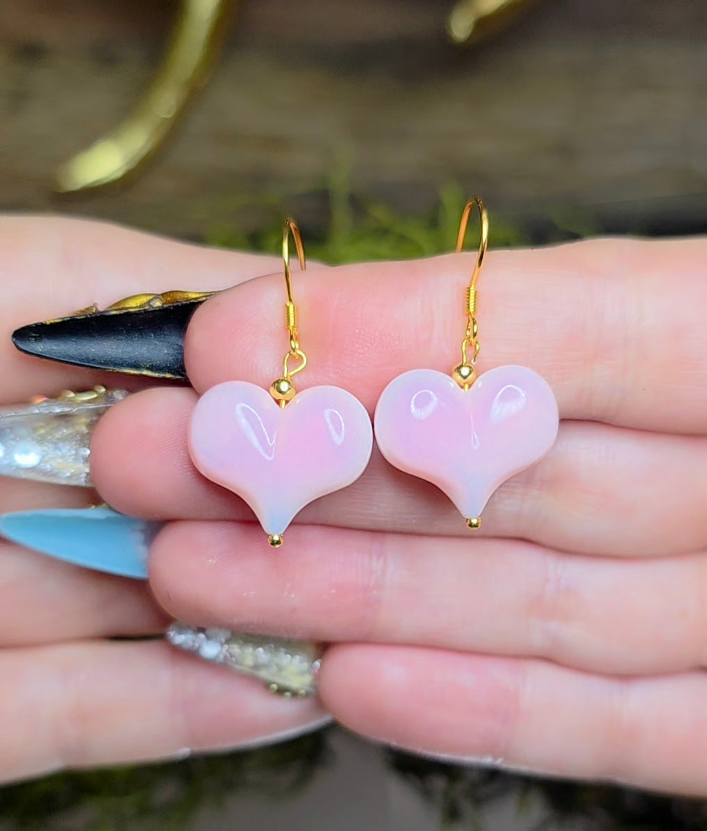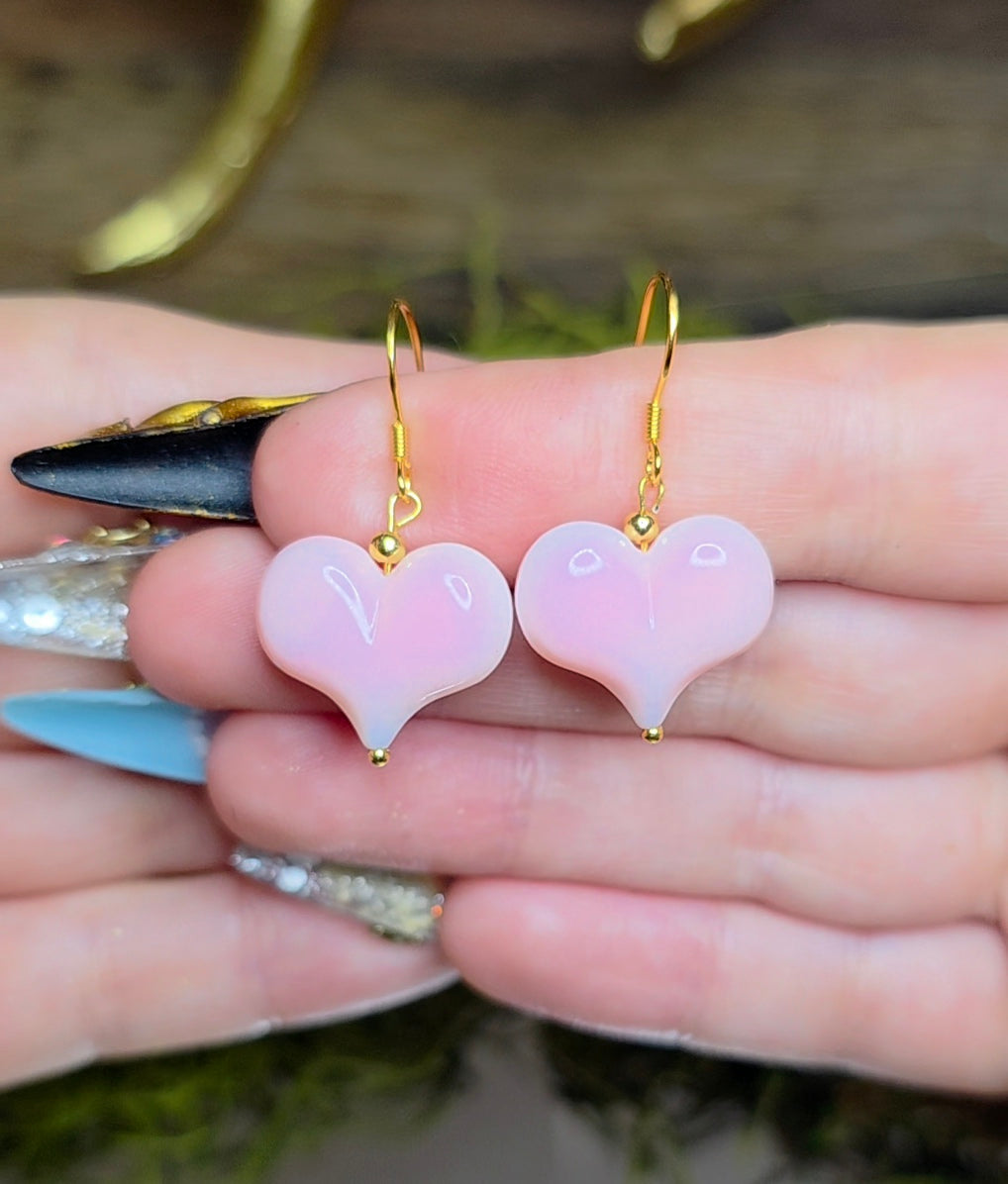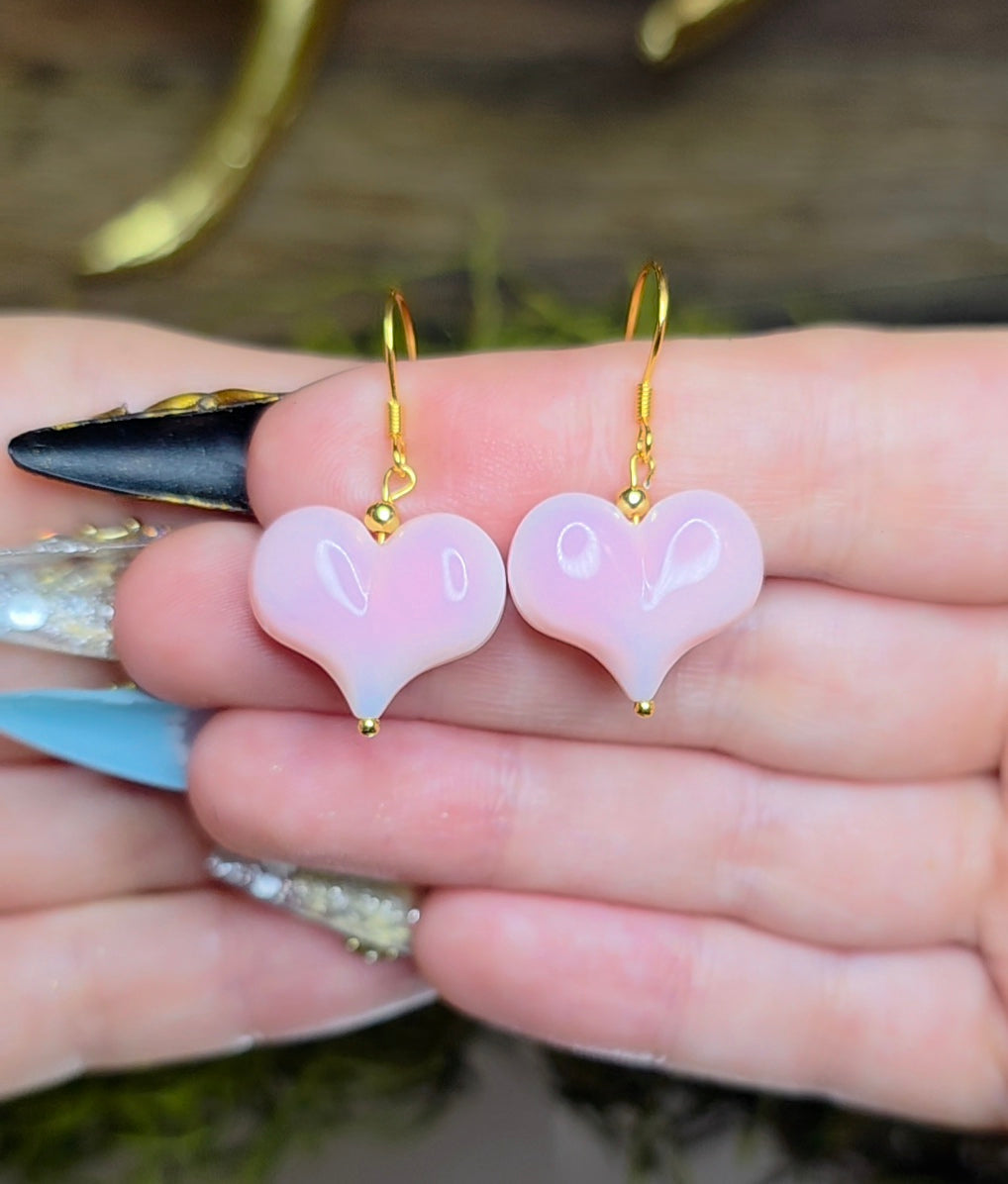 15x18mm pink shell carved into heart shapes amd set into gold plated sterling silver earring hooks.