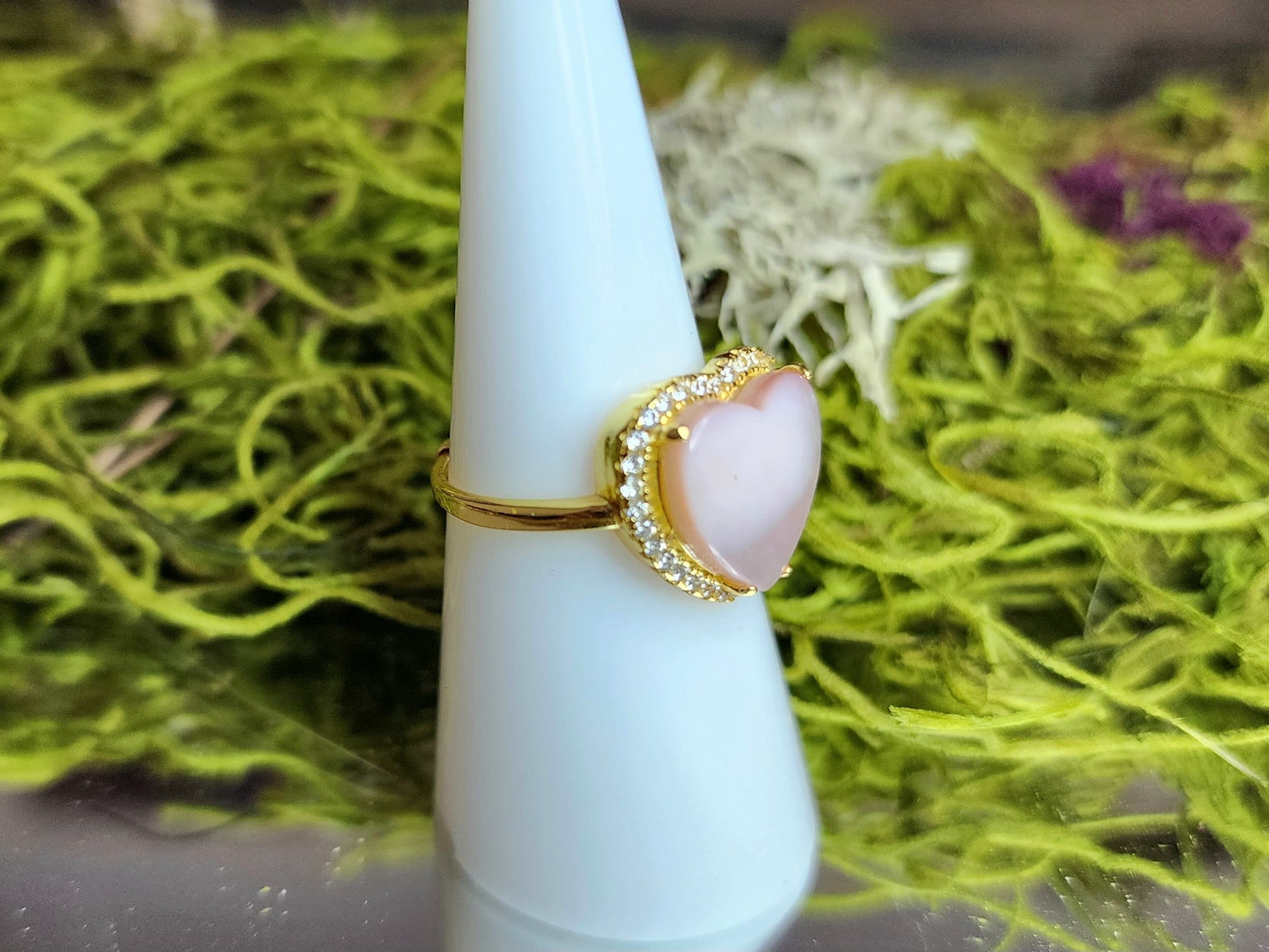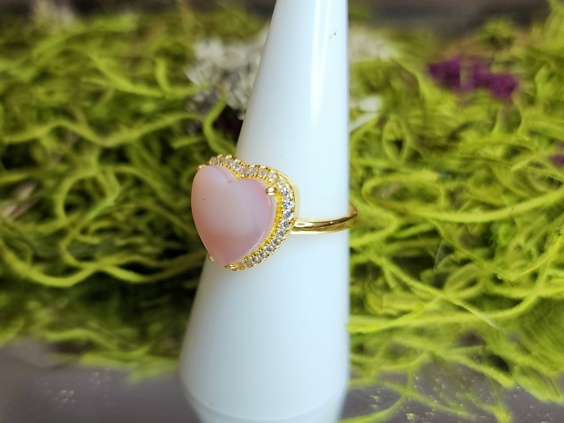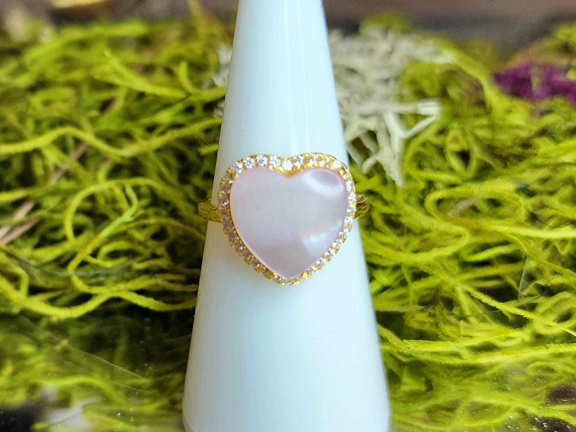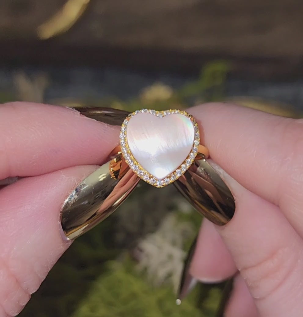 Heart-shaped Pink shell cabochon set in an adjustable sterling silver band that has been gold plated. Man-made zircon accents surround the shell.