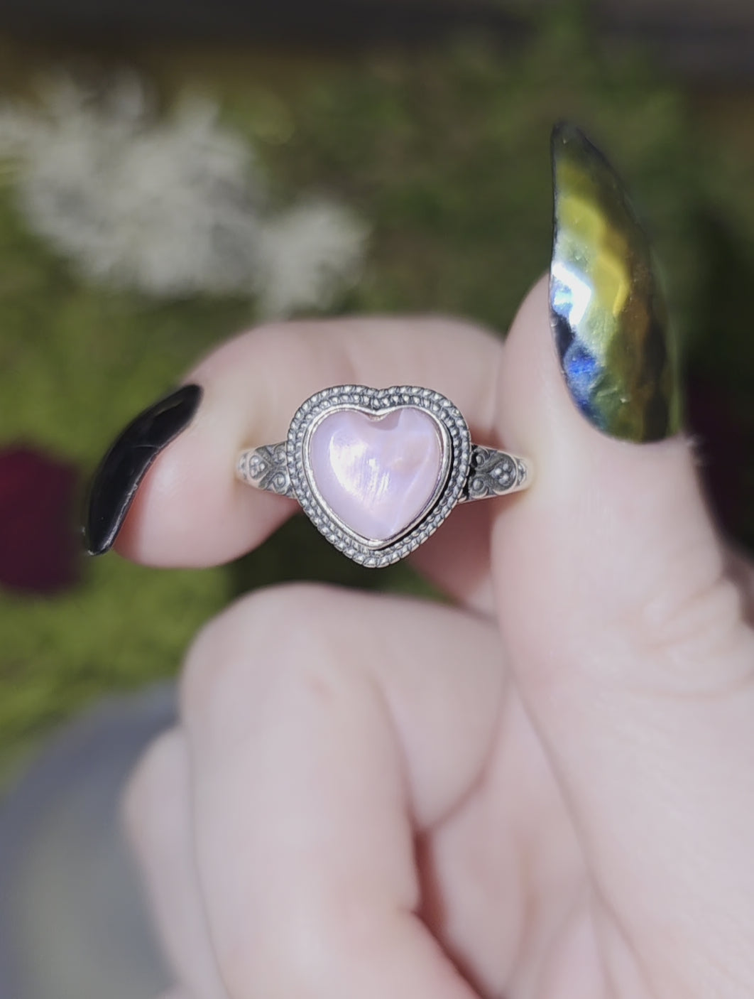 8mm heart-shaped pink shell with clear quartz on top set in an adjustable sterling silver band with rope details.