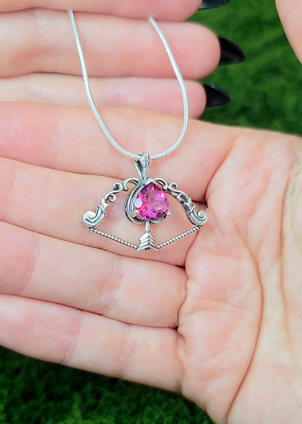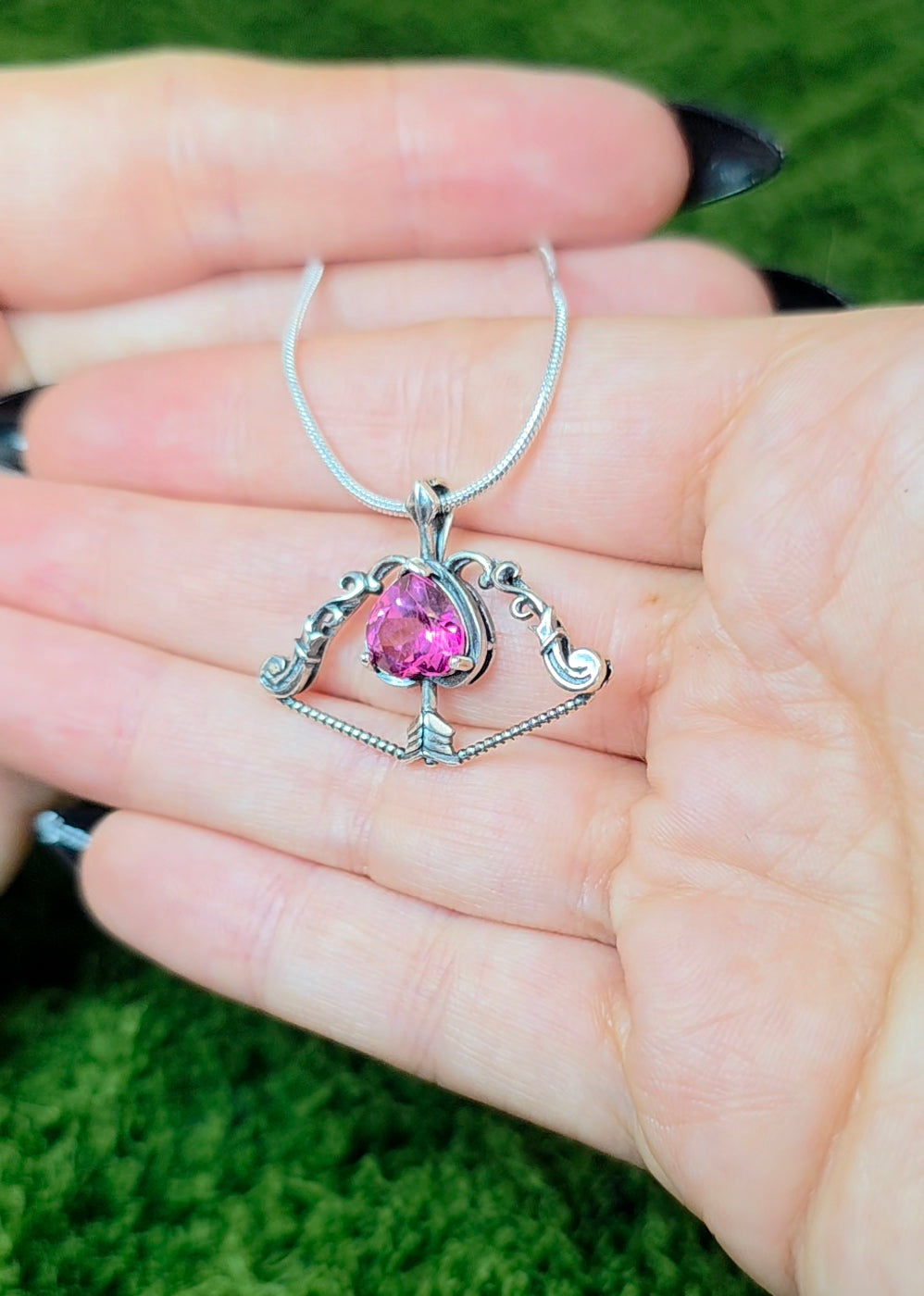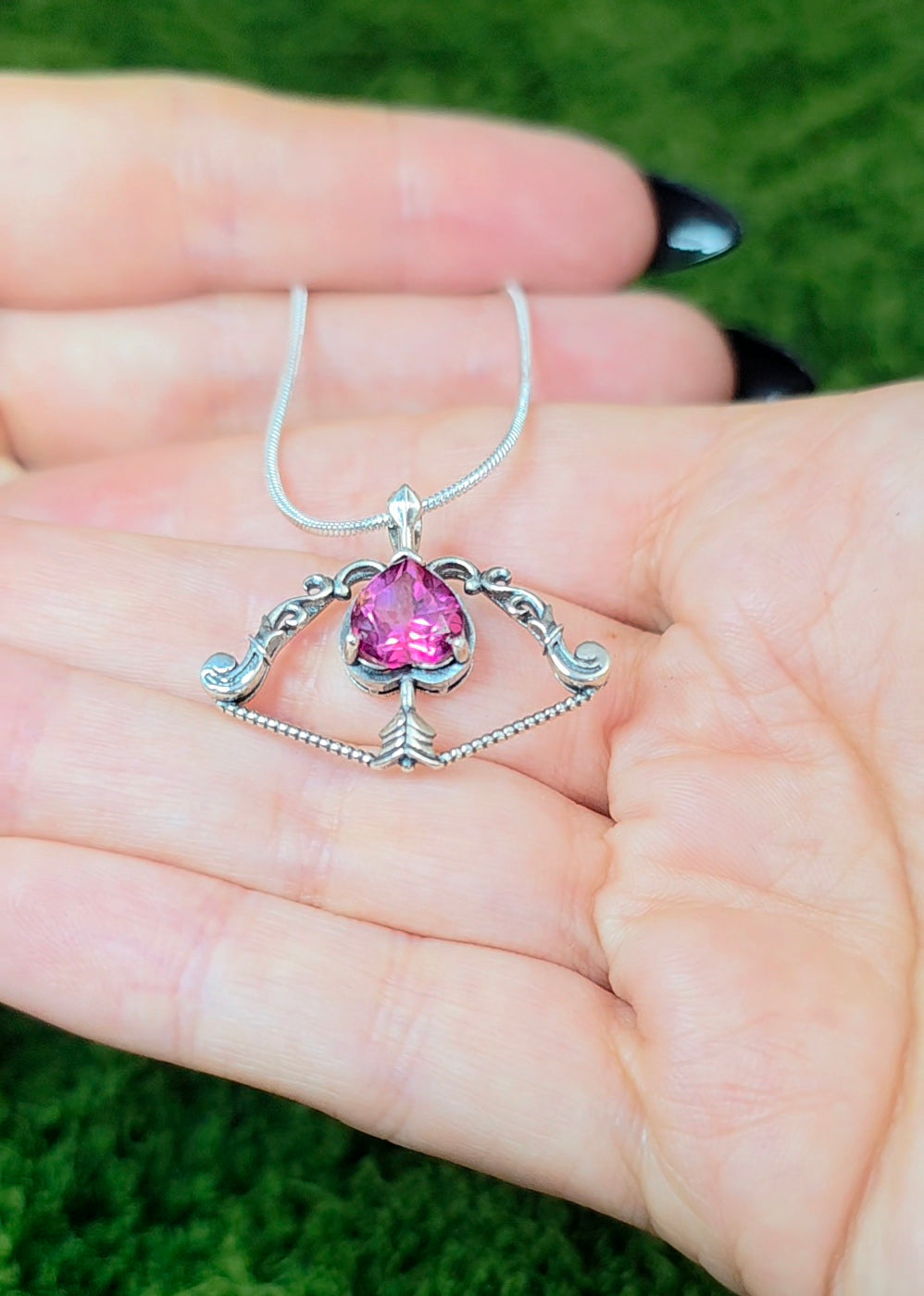 This stone has bene heat treated to achieve its color and has been cut and facted into a heart shape. It's approximately 9mm in size and is set in a sterling silver pendant in the shape of a Cupid's bow. It comes with a base metal chain.