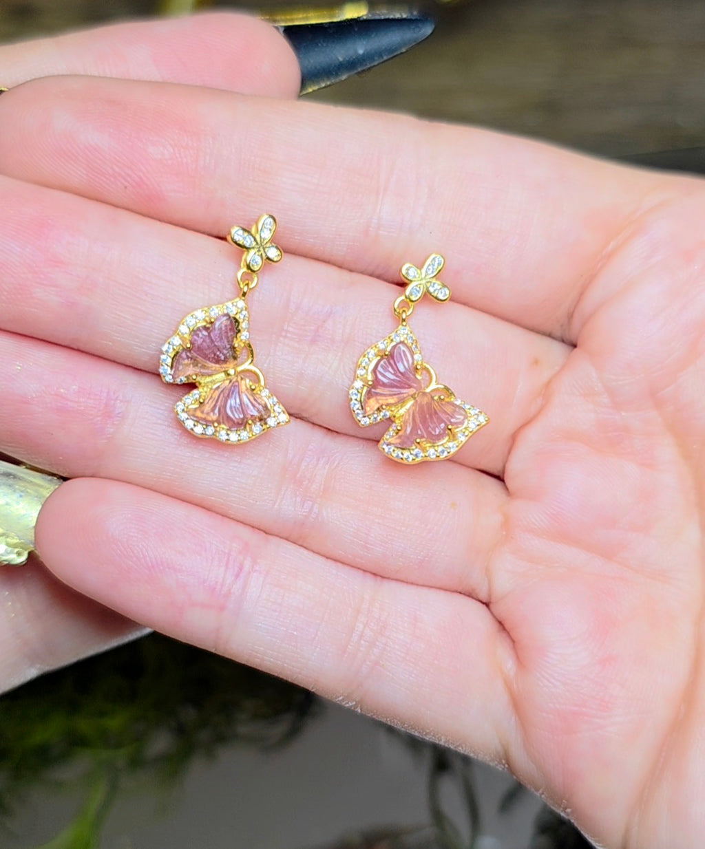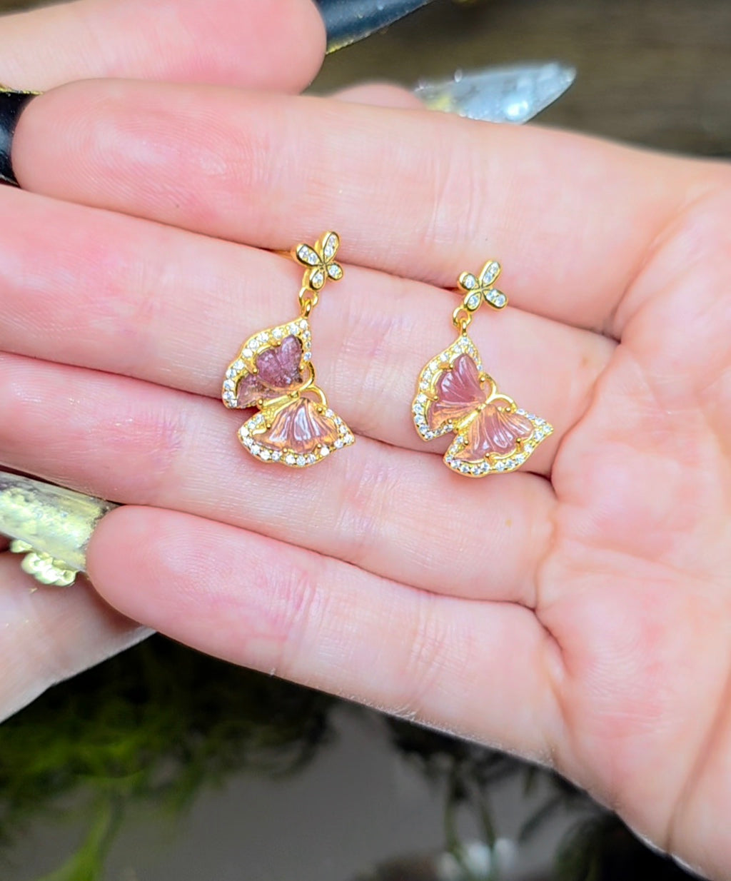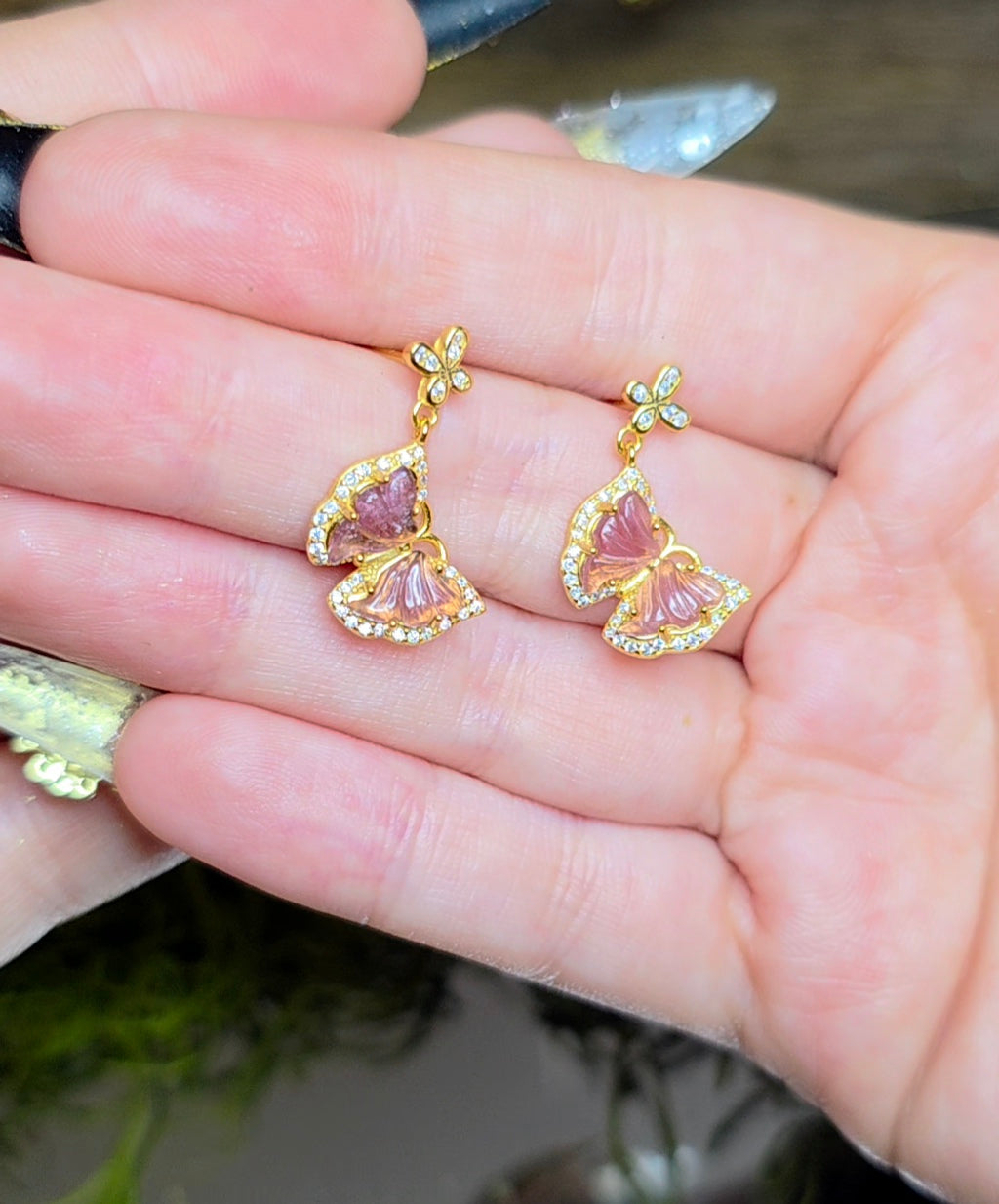 These gold plated sterling silver post earrings feature four pink tourmaline crystals that have been carved into butterfly wings. They are decorated with zircon and are approximately .85 inches long.