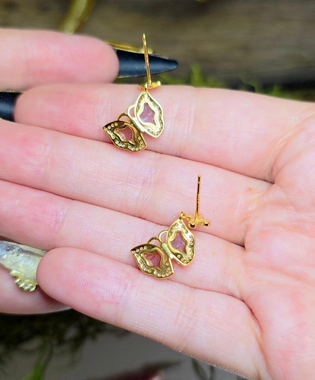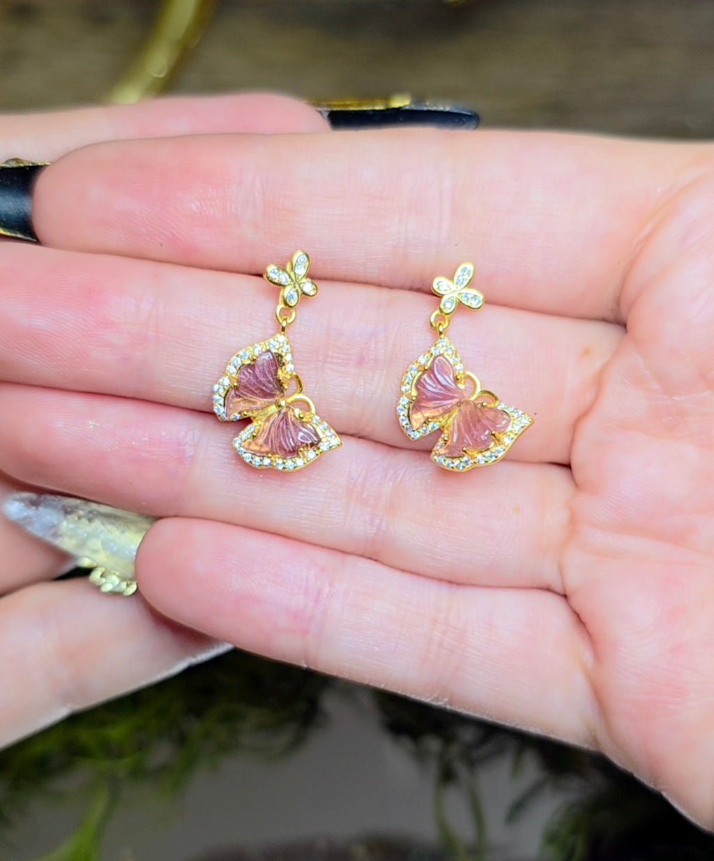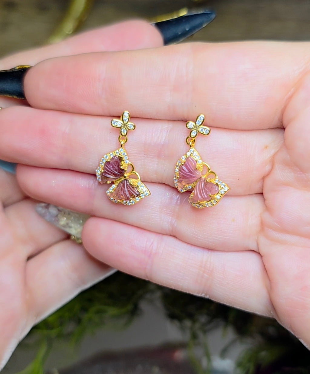 These gold plated sterling silver post earrings feature four pink tourmaline crystals that have been carved into butterfly wings. They are decorated with zircon and are approximately .85 inches long.