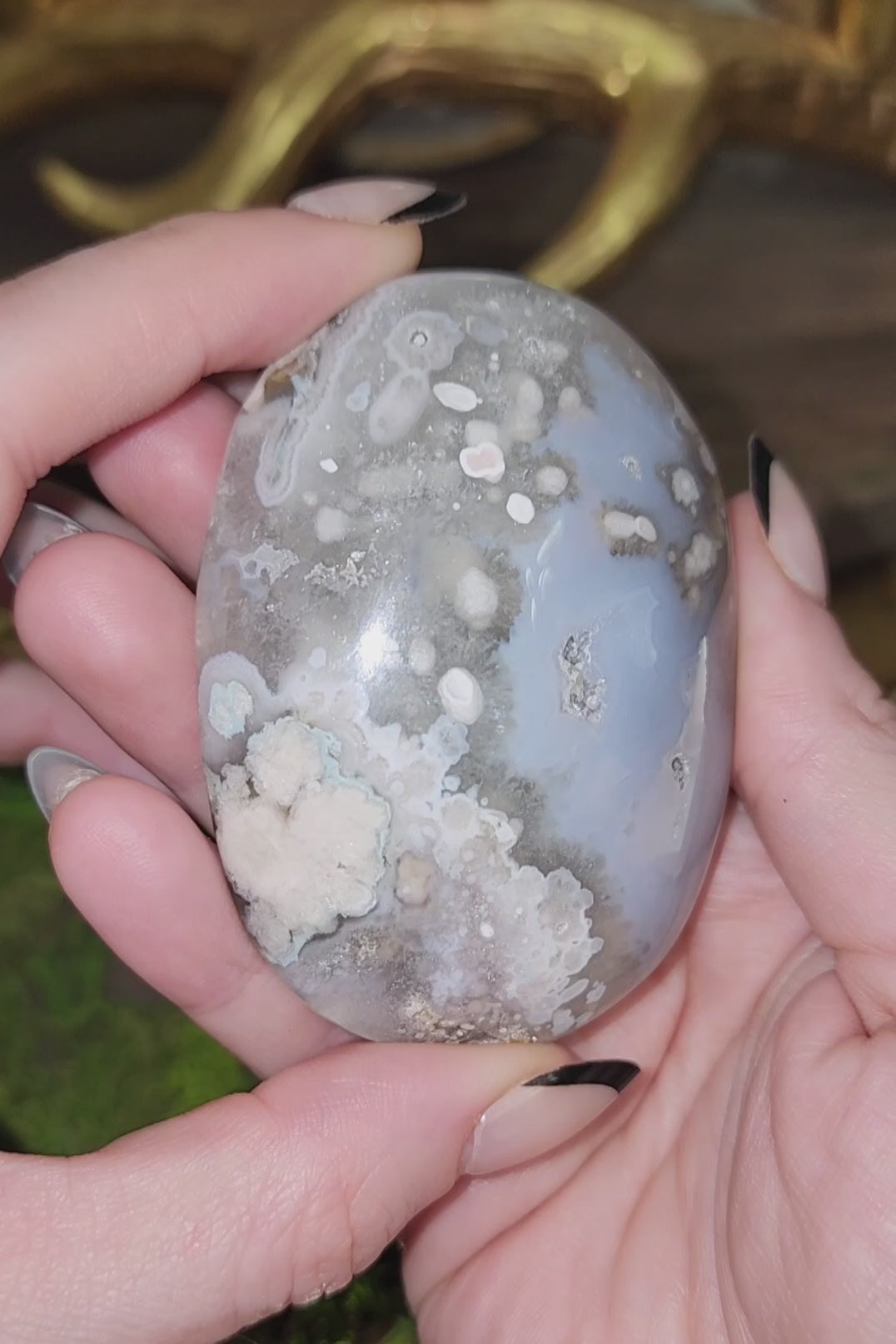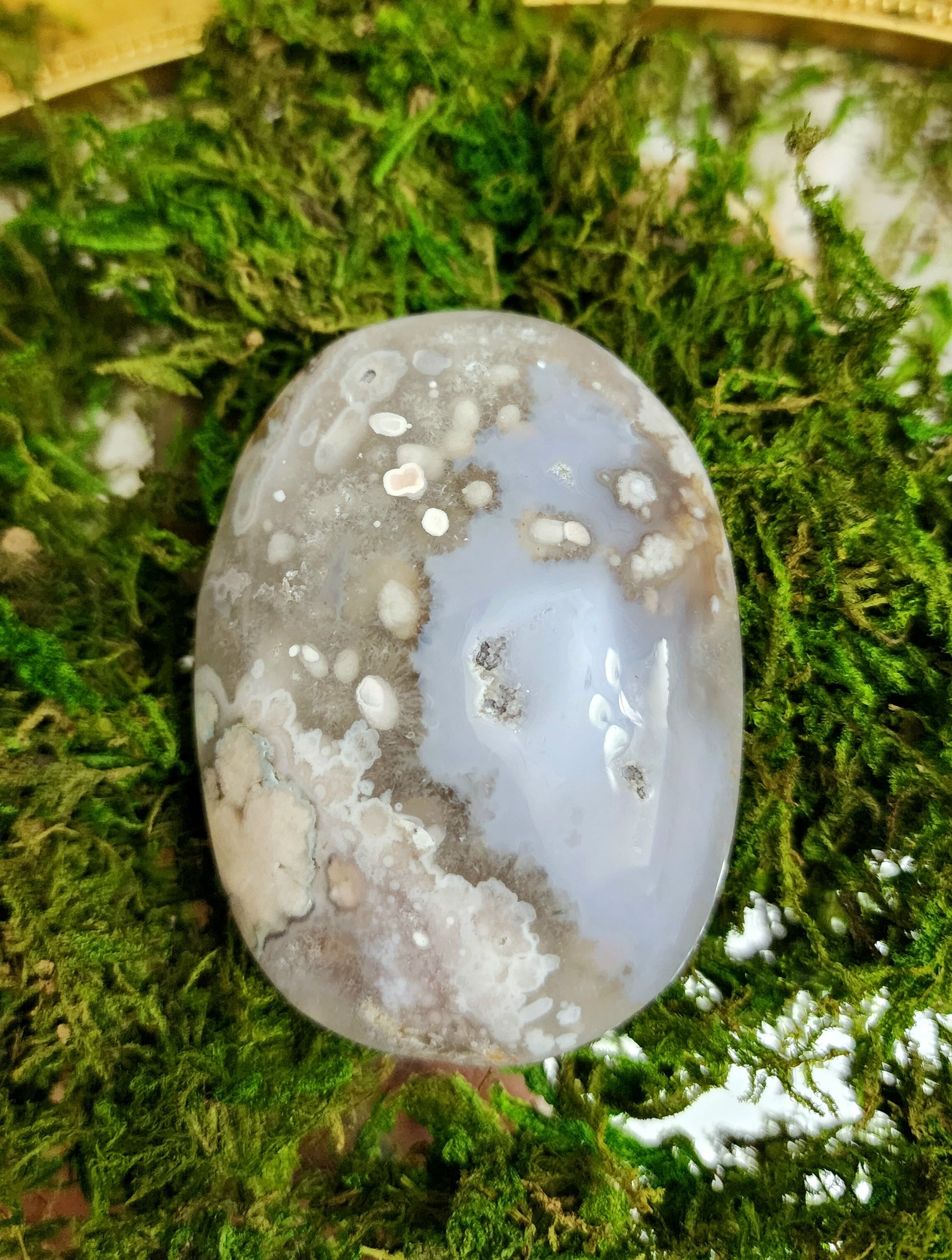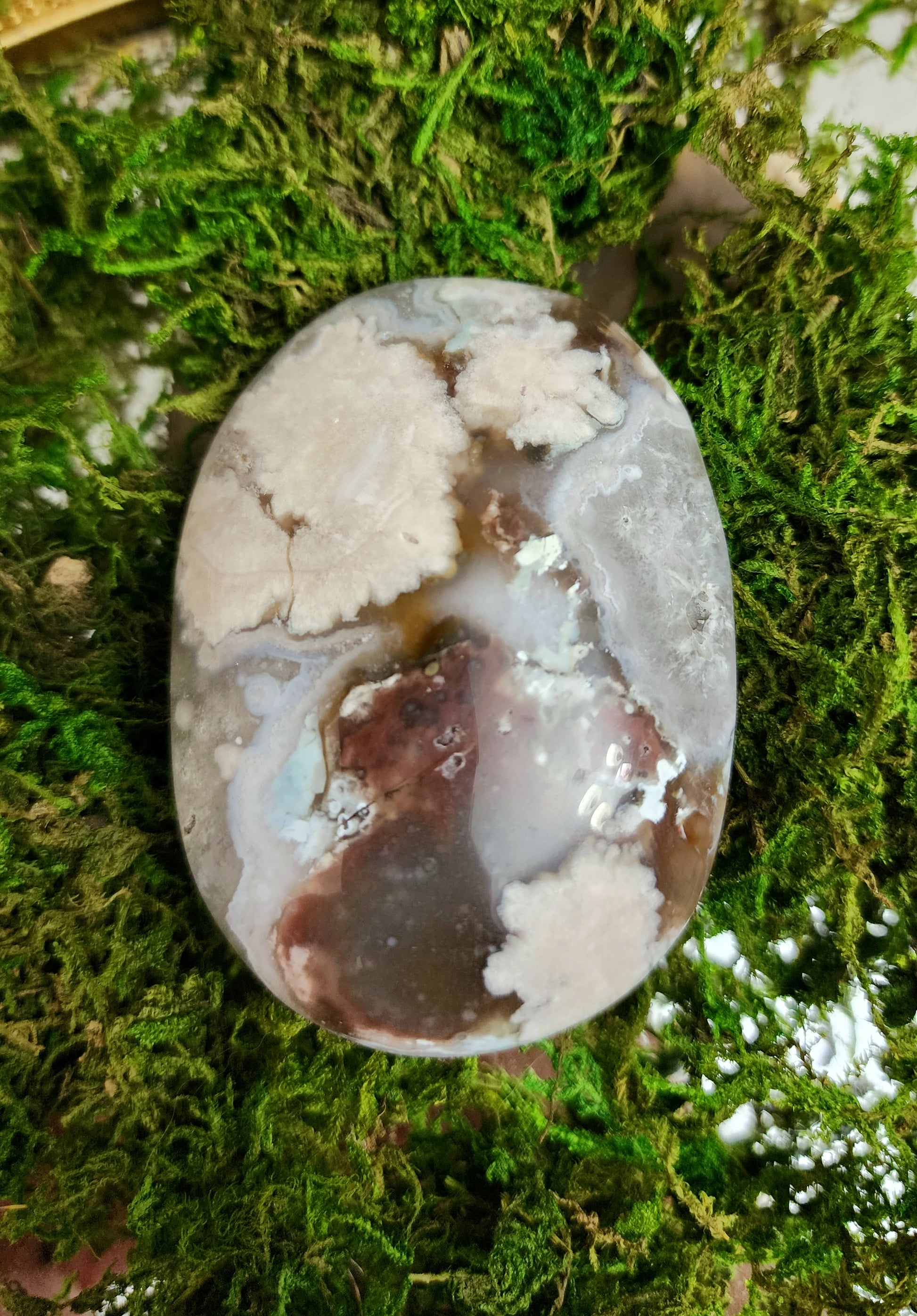This stone also features flower agate with colors of brown, white, and milky blue.