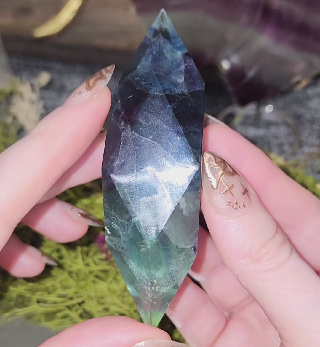 Beautiful blue and purple banded fluorite, faceted and set onto a custom stand.
