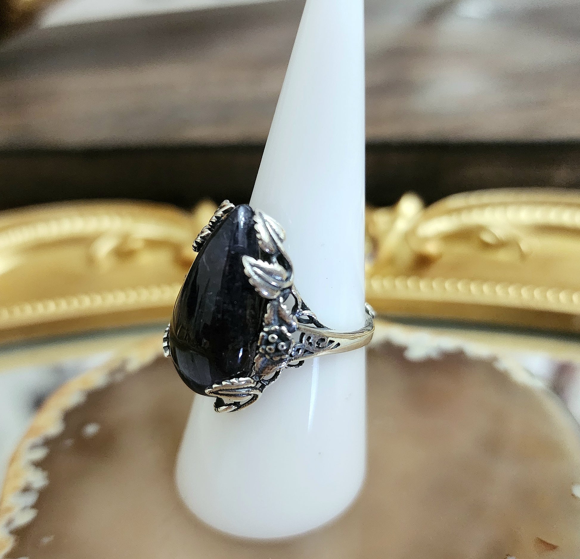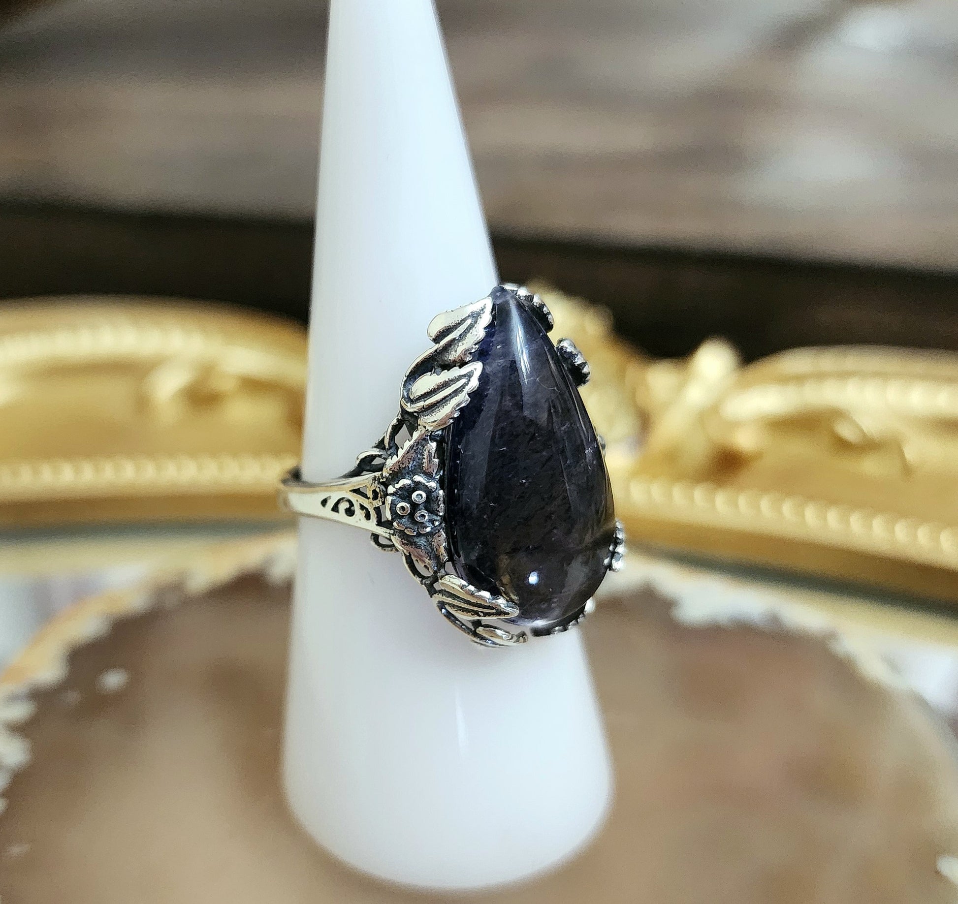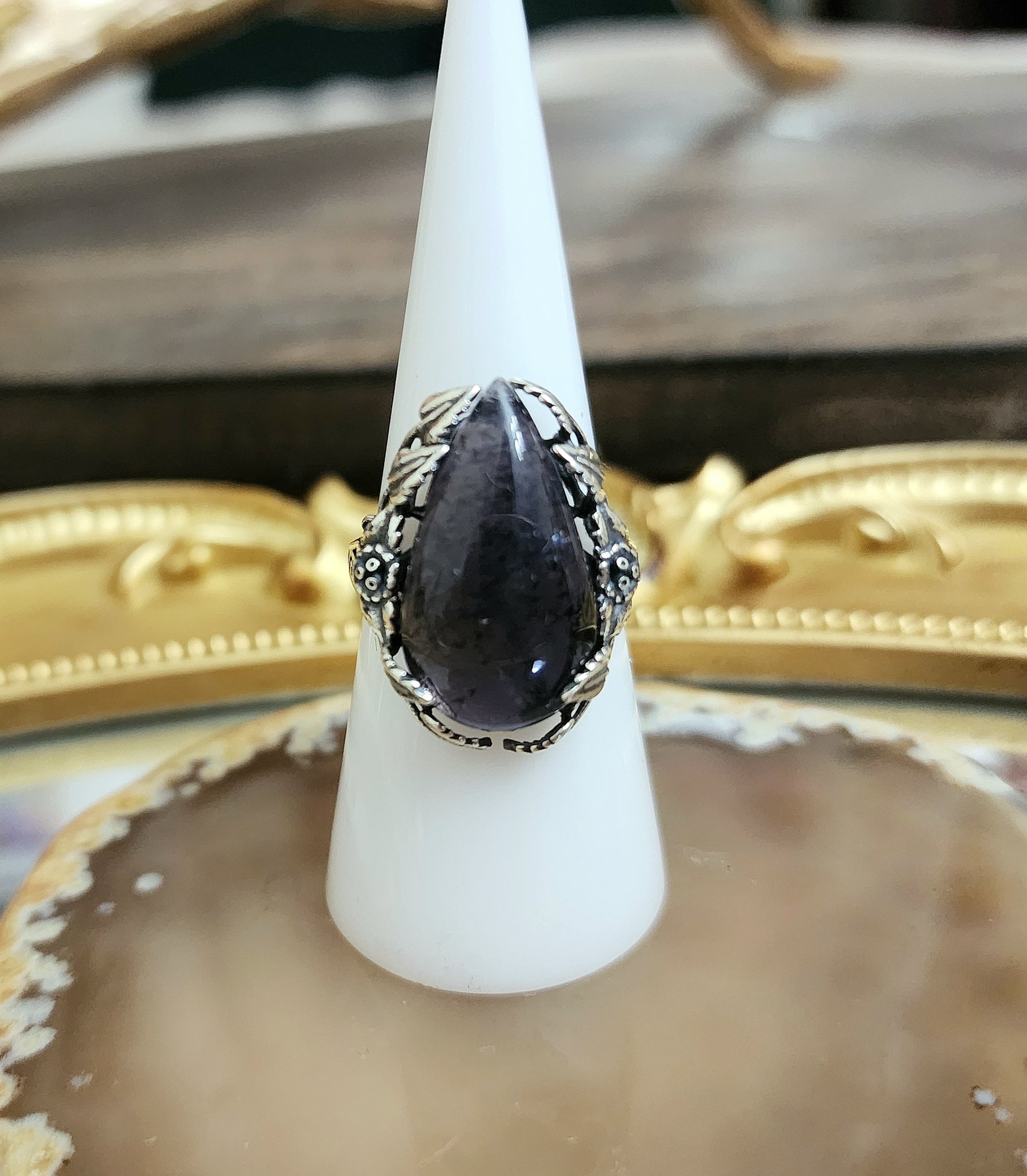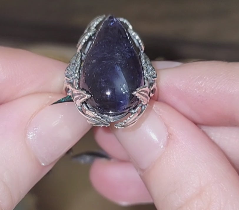 Dark purple iolite with many inclusions cut into a teardrop shape. The stone itself is so dark it almost appears to be black. The cabochon is set into an adjustable sterling silver ring with flower and leaf details
