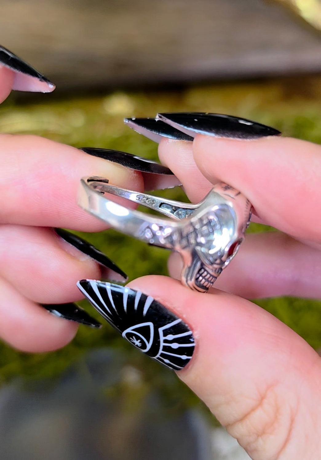 Two 4mm red faceted garnet set into an adjustable sterling silver ring with an intricate skull design. The ring is adjustable and will best fit sizes 7 - 9