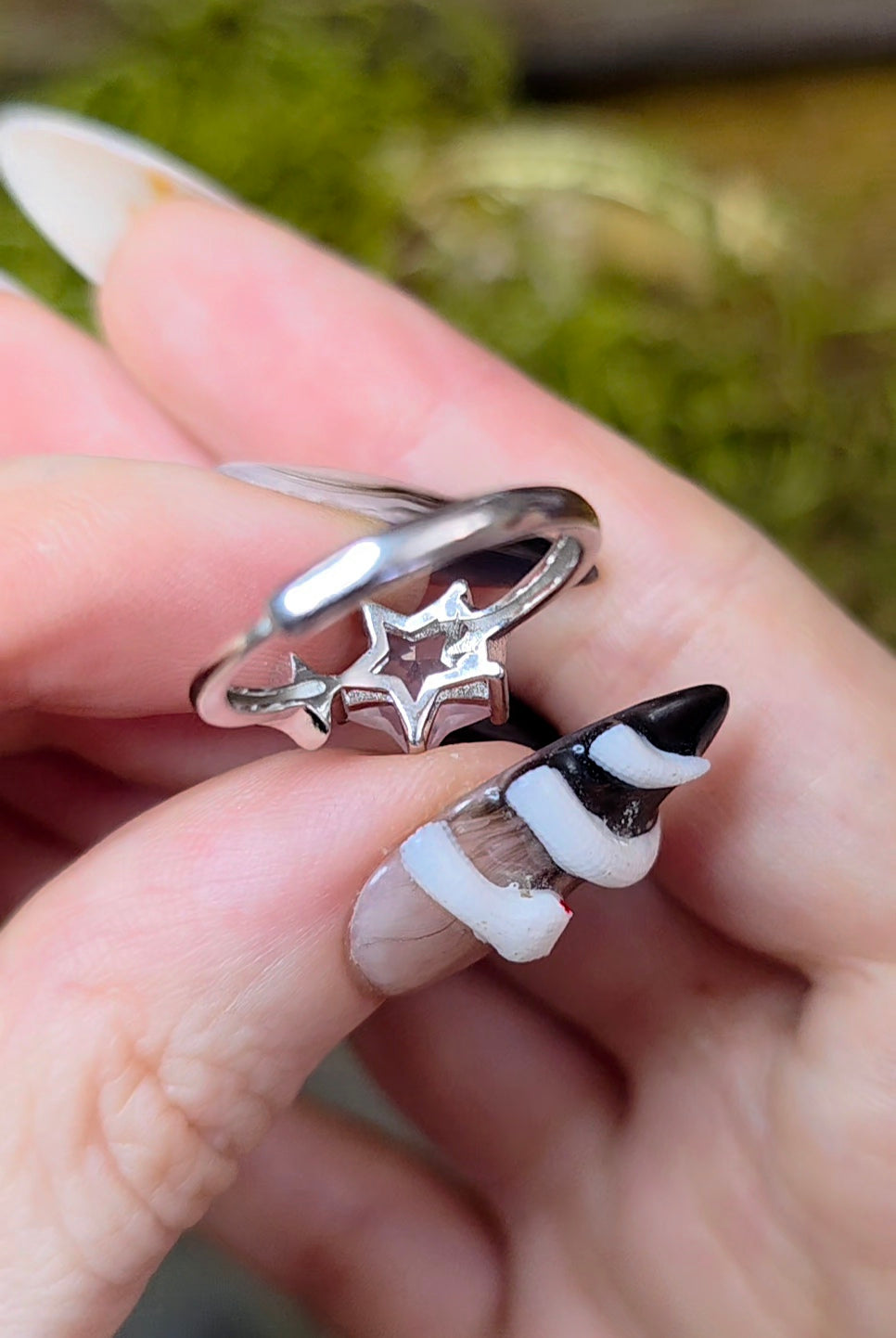 9mm star cut rose quartz set on an adjustable sterling silver ring with a star design.