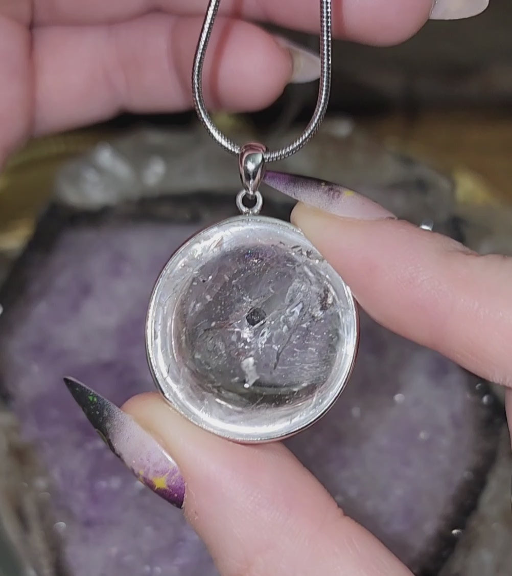 This pendant features a natural quartz crystal with water and black sand trapped inside of it and pleanty of rainbows. It is set in a simple sterling silver bail.