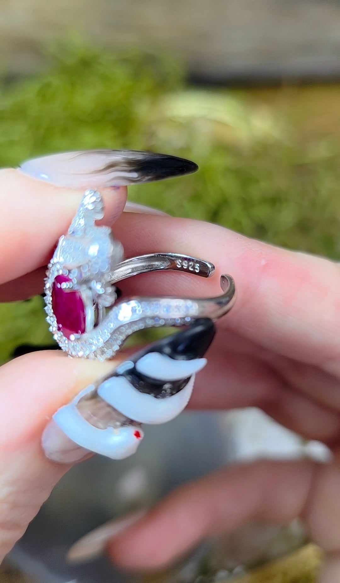 8x6mm natural faceted ruby set into the center of an adjustable sterling silver crocodile ring with many zircon accents and blue sapphire eyes.