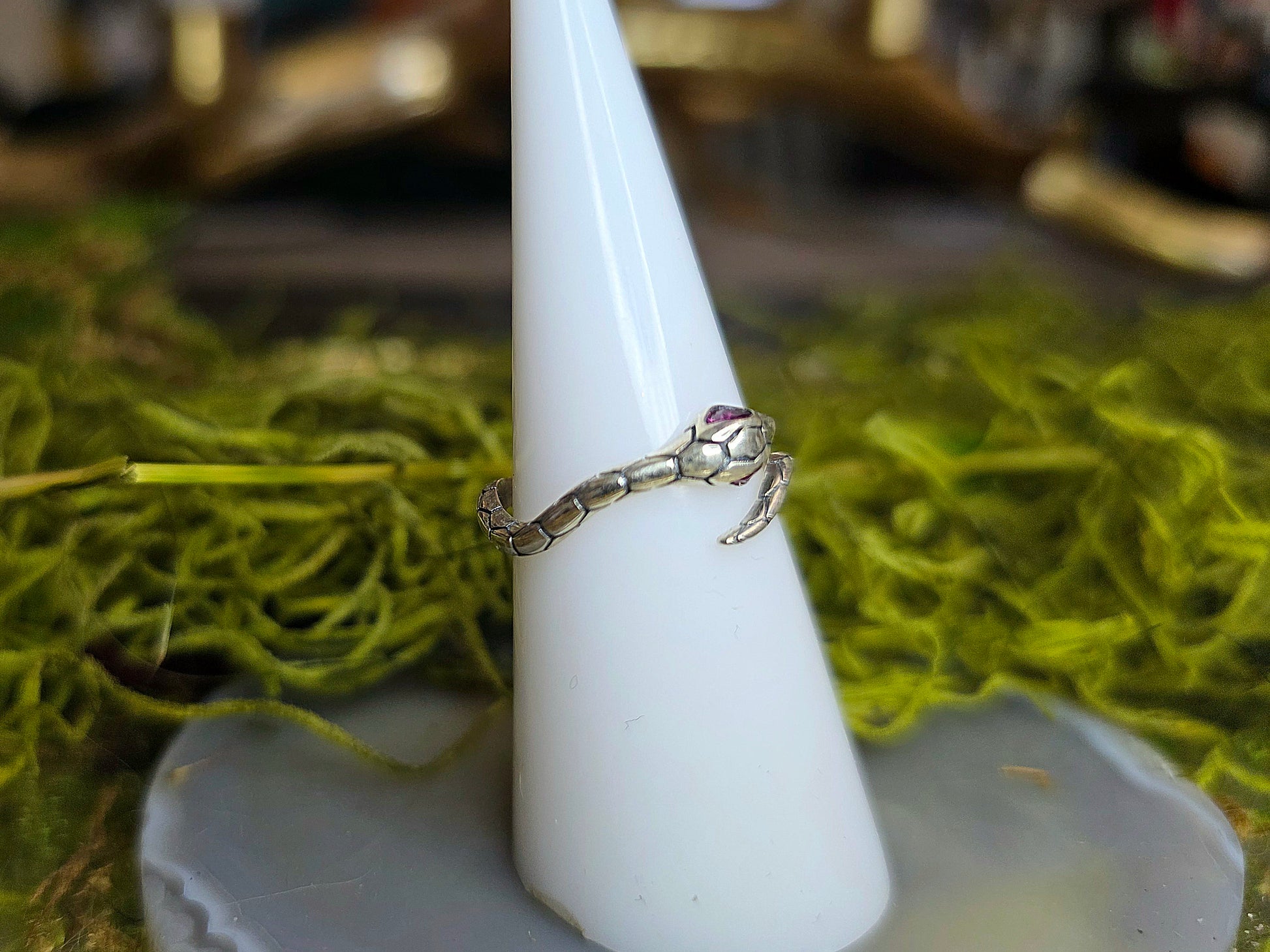 This ring features two 2.5mm faceted rubies set into the eyes of a coiledsnake. The ring is adjustable and will best fit sizes 5 - 7