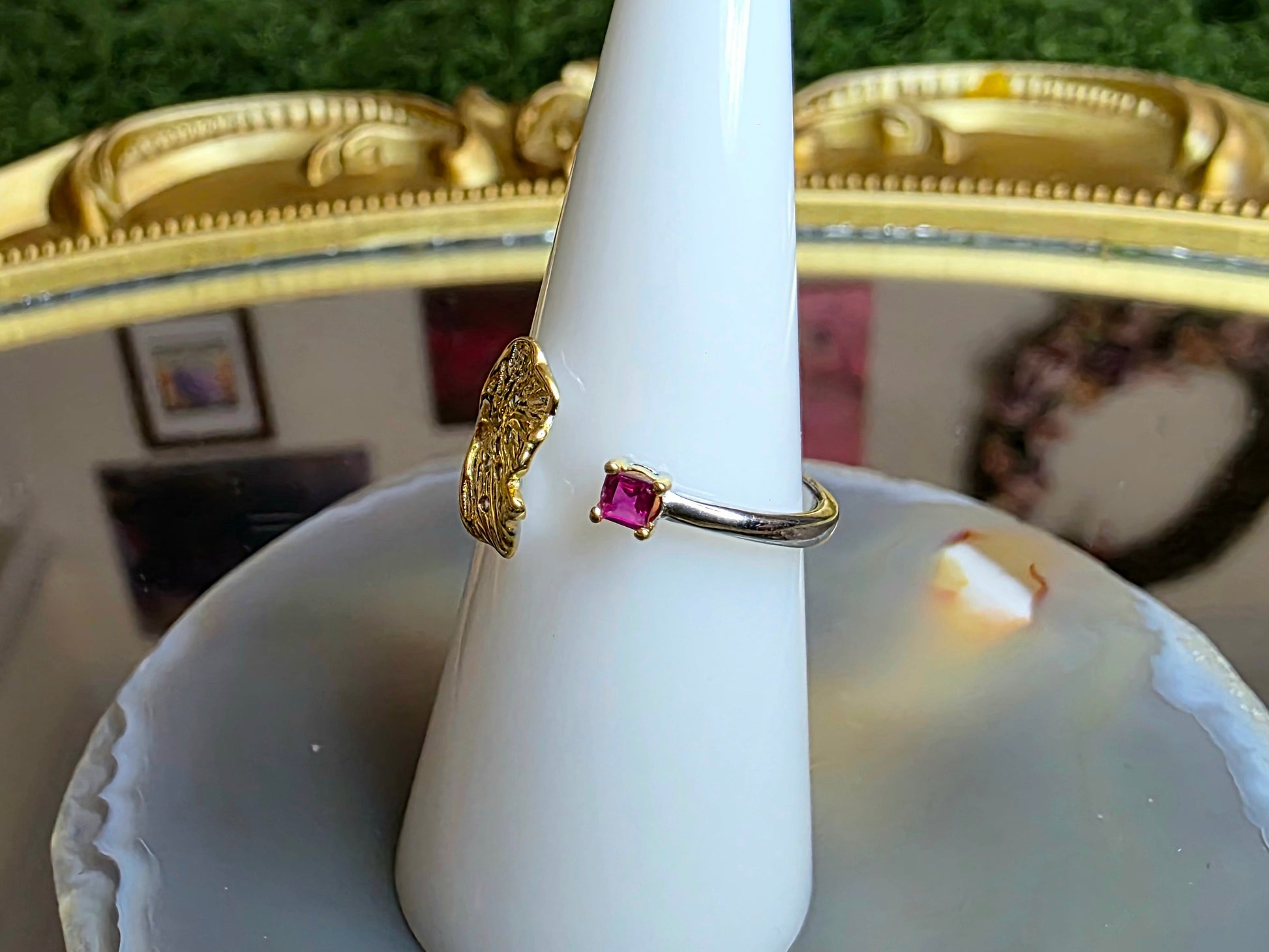 3mm natural faceted ruby set into an adjustable cuff style ring with a gold plated and zircon decorated ginkgo leat.