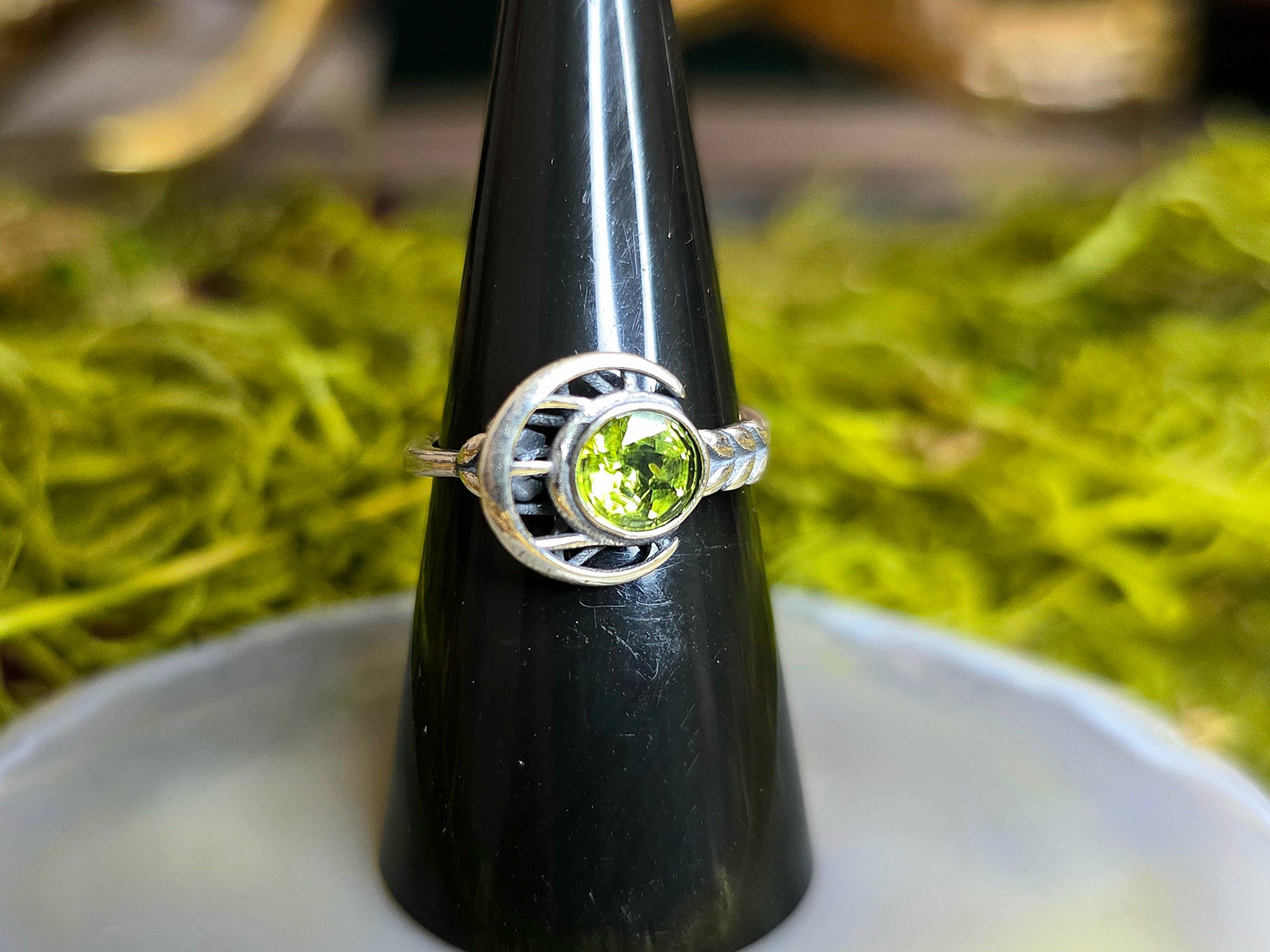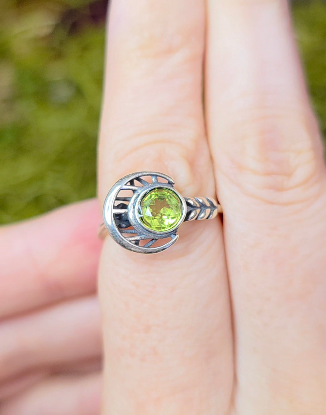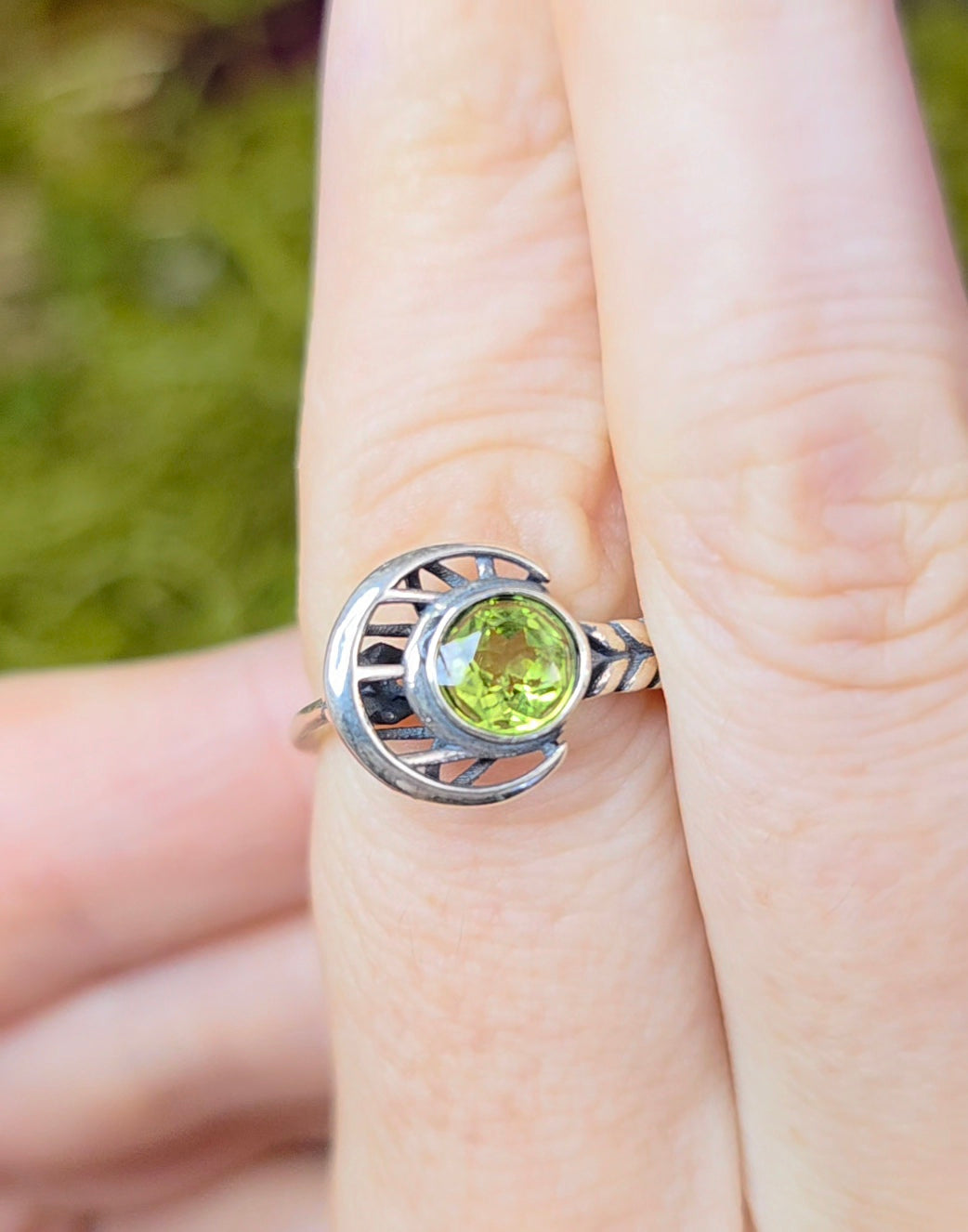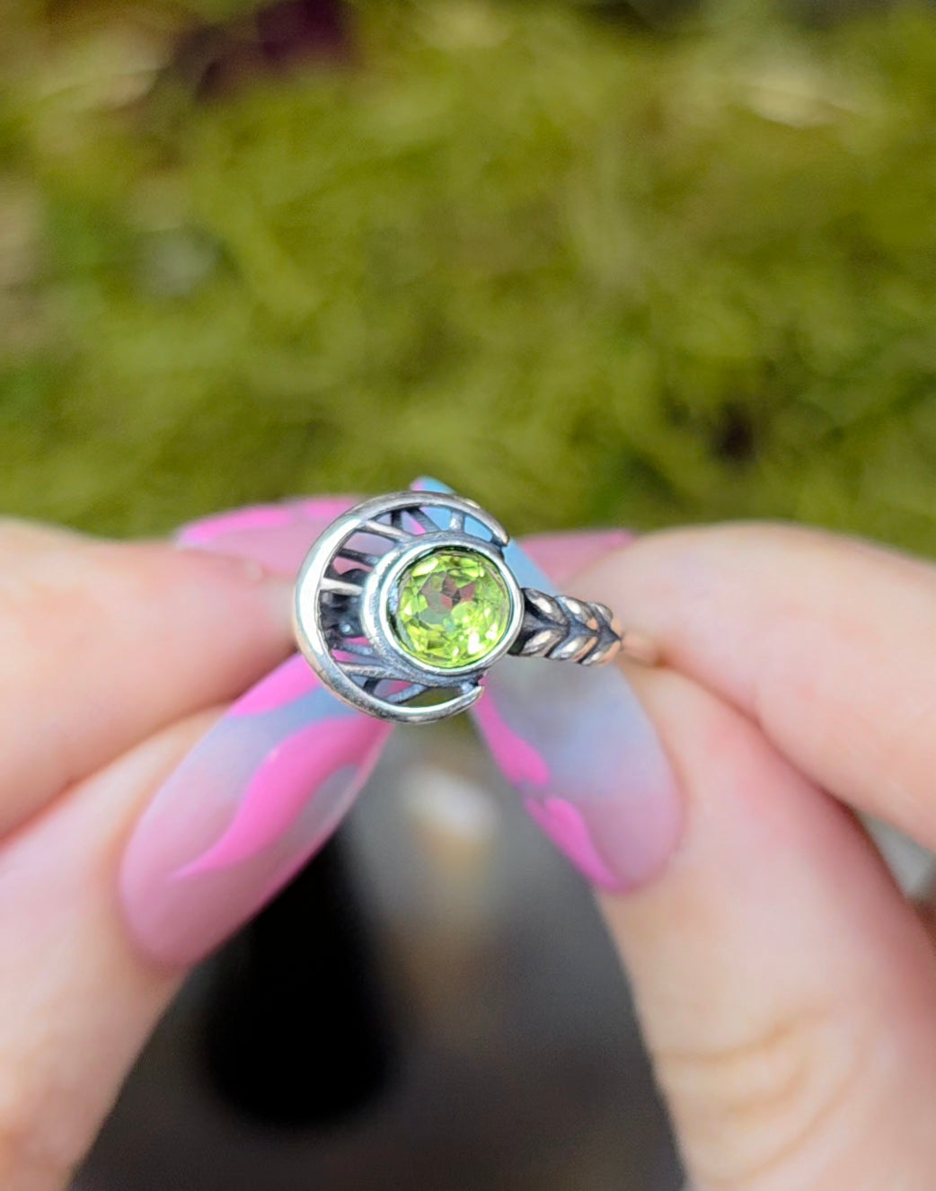 6mm faceted peridot gemstone set into an adjustable sterling silver ring with a crescent moon design. This ring is adjustable and will best fit sizes 6 - 9.