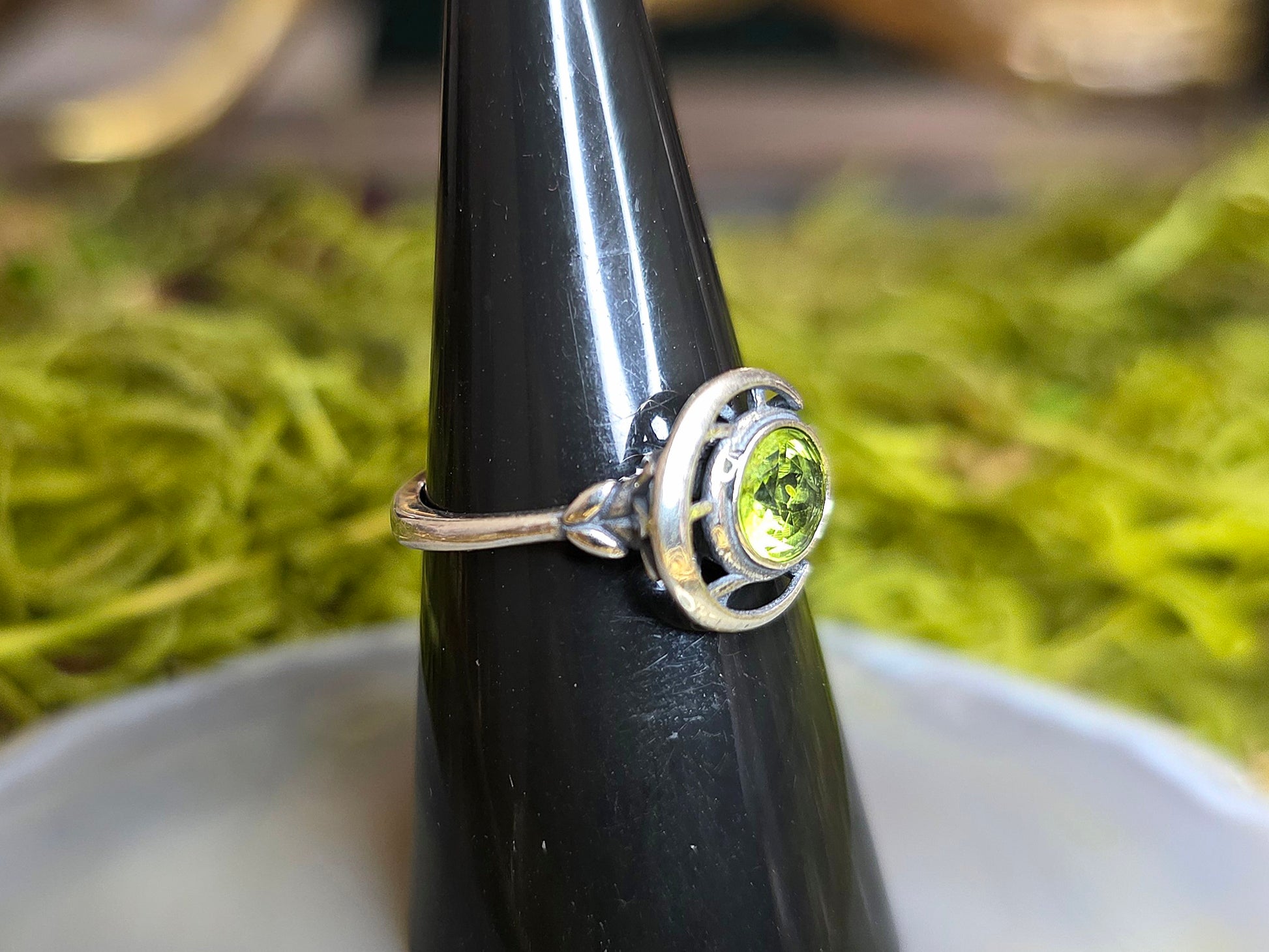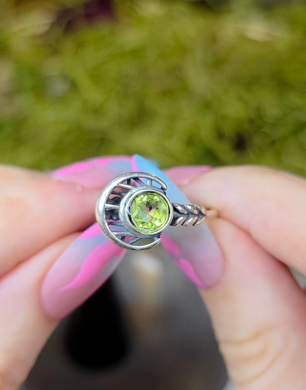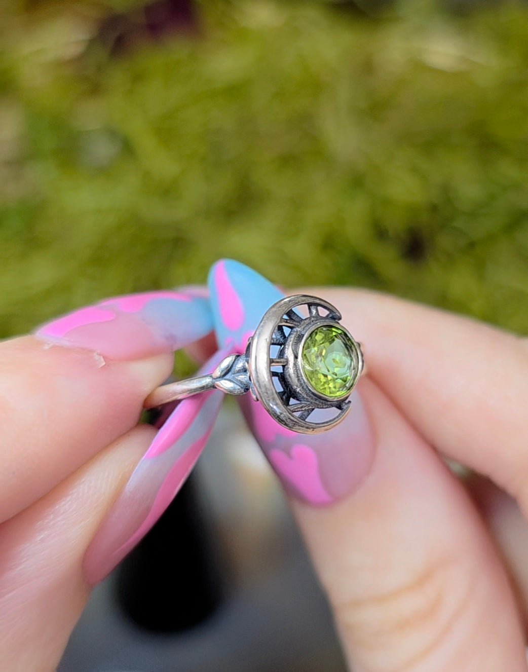 6mm faceted peridot gemstone set into an adjustable sterling silver ring with a crescent moon design. This ring is adjustable and will best fit sizes 6 - 9.