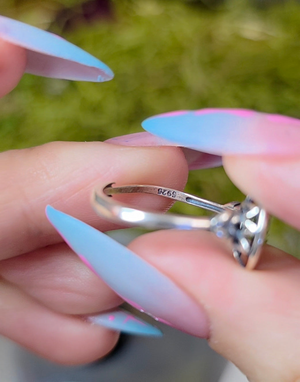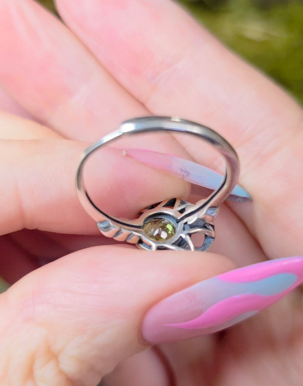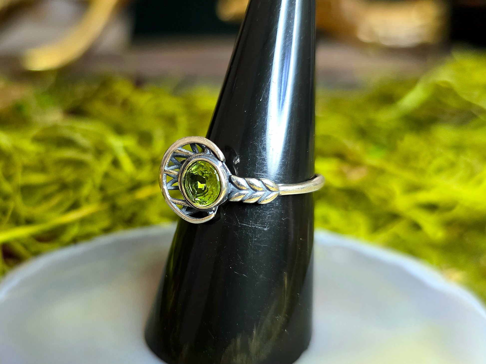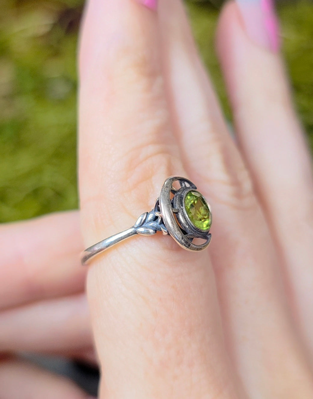6mm faceted peridot gemstone set into an adjustable sterling silver ring with a crescent moon design. This ring is adjustable and will best fit sizes 6 - 9.