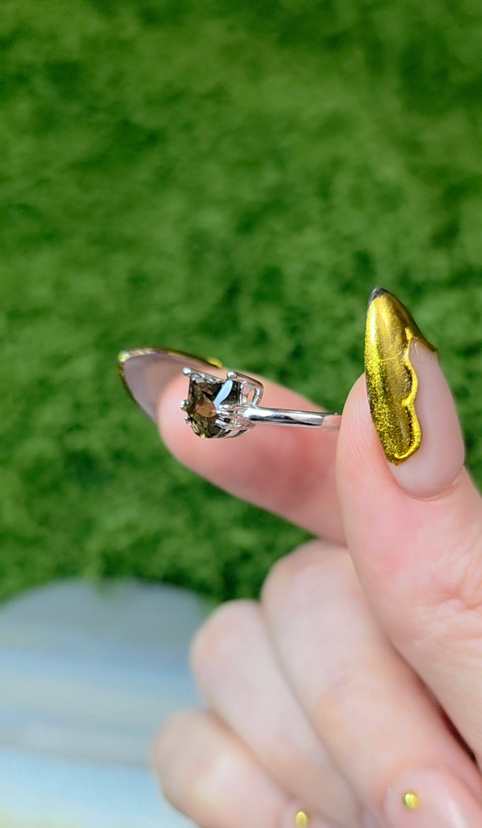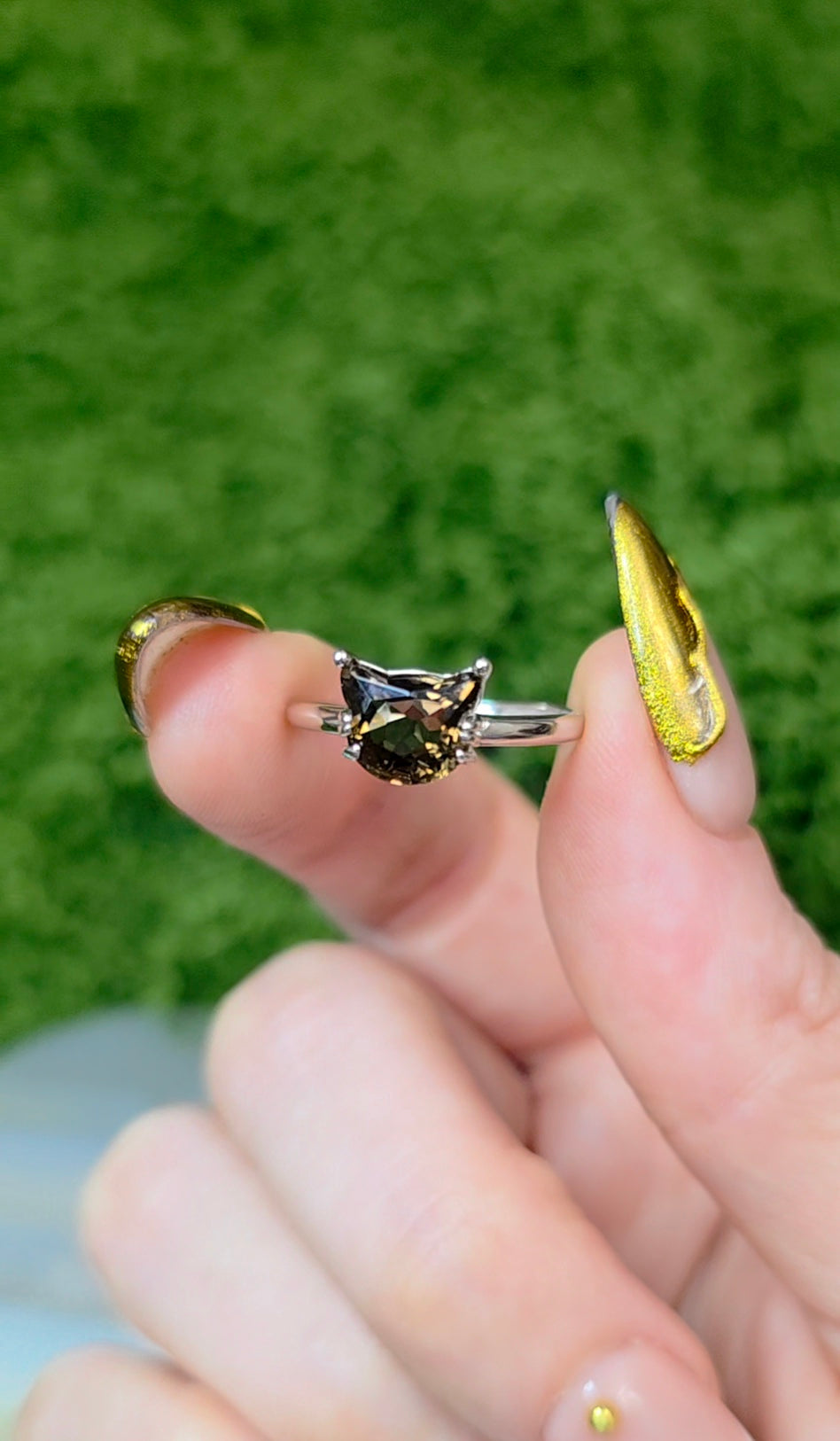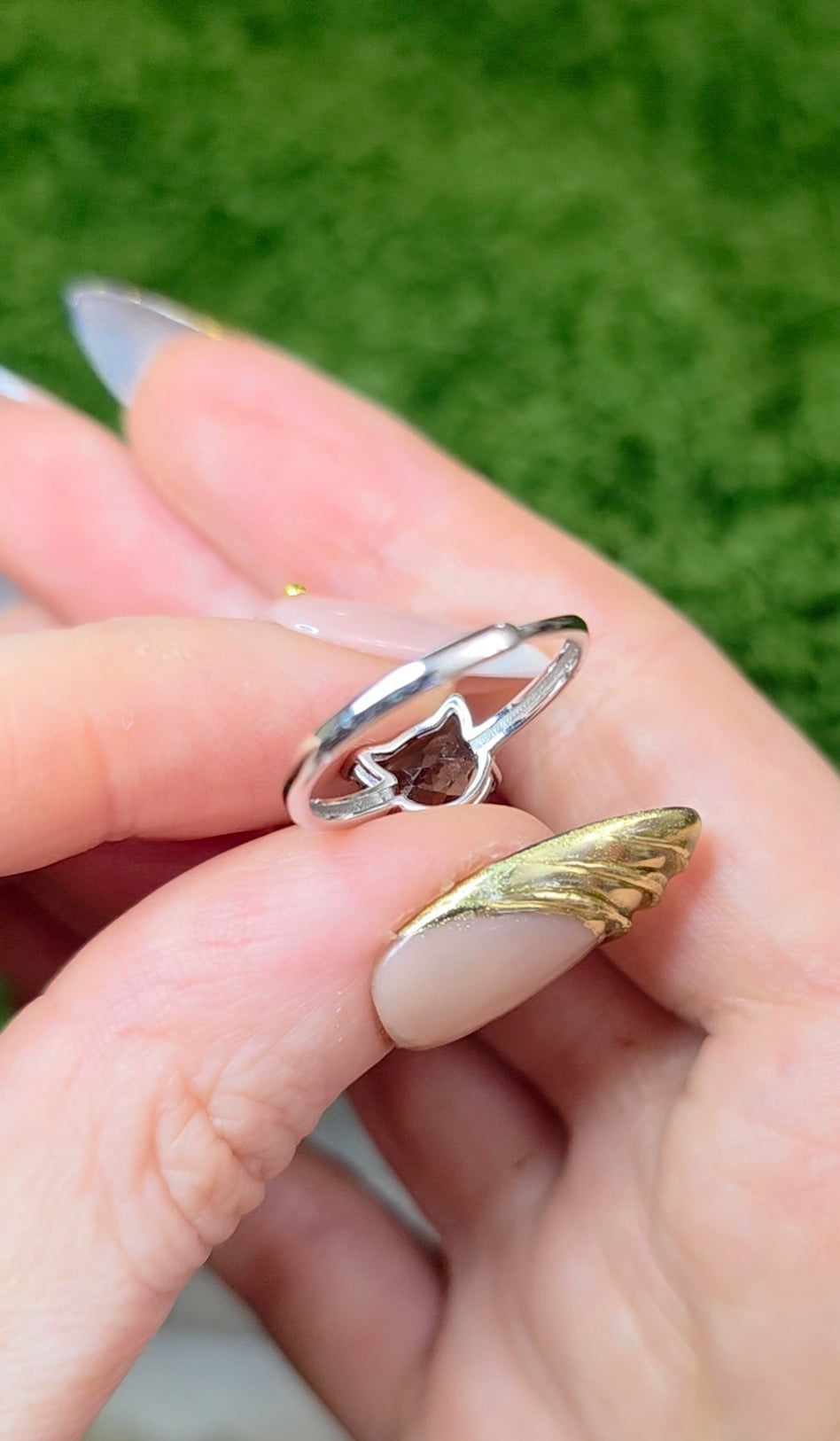 This ring features a 7x8mm faceted Smokey Quartz crystal that has been cut into a cat shape. The ring is adjustable and will best fit sizes 6 - 8