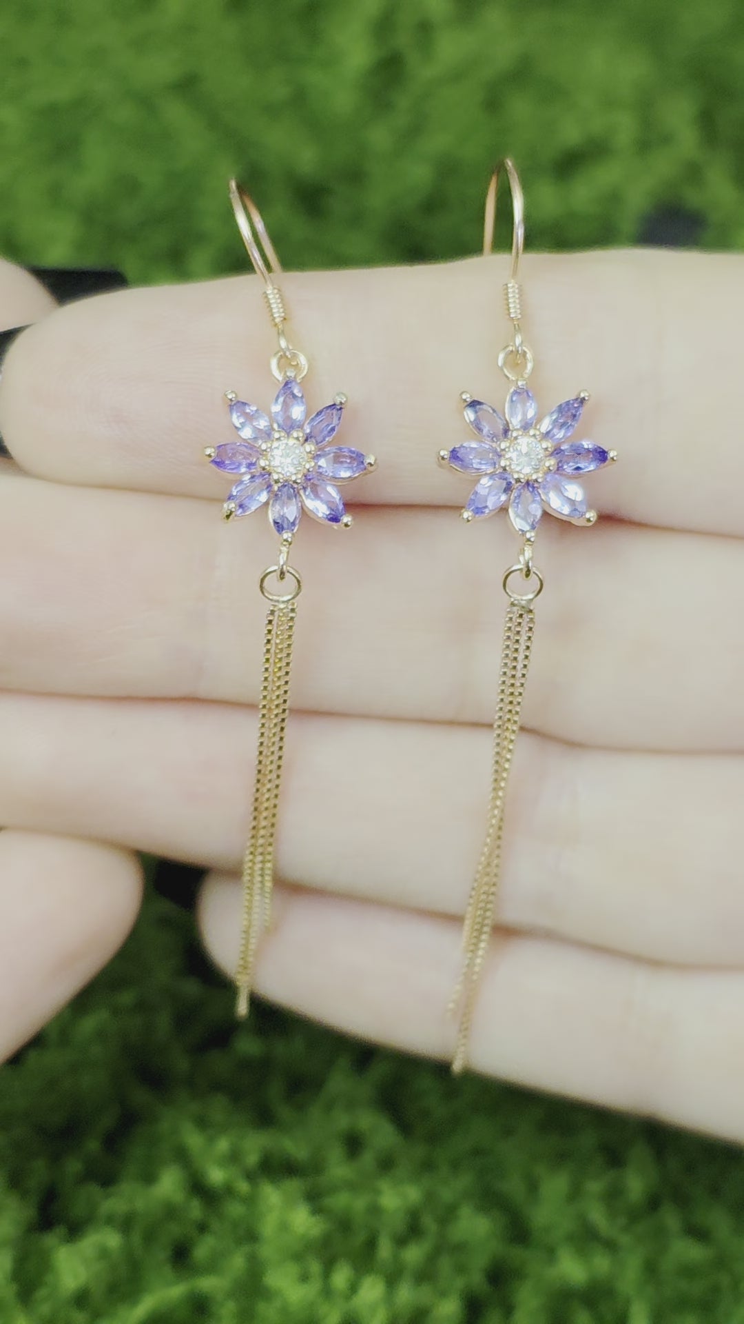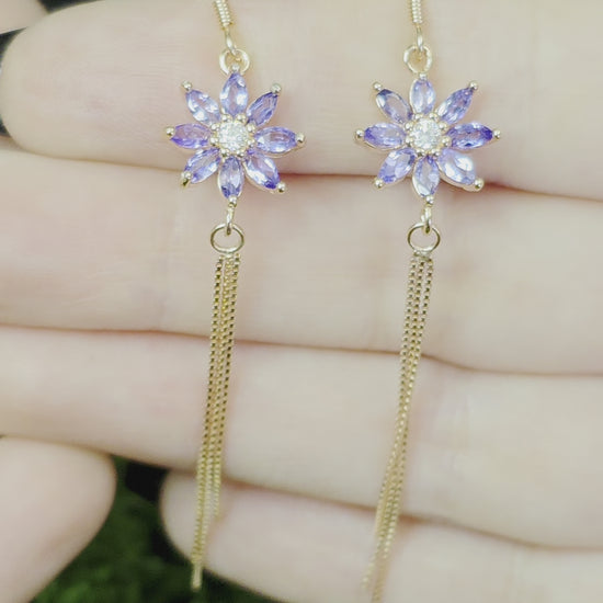 Rose gold plated sterling silver hook earrings each with eight 4x2mm tanzanite crystals set into a flower pattern eith a zircon center stone and three links of box chains dangling below.