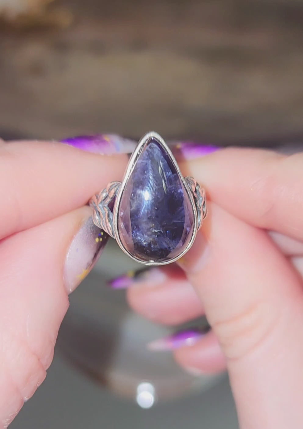 Dark purple iolite cut into a teardrop shape. The stone itself is so dark it almost appears to be black. The cabochon is set into an adjustable sterling silver ring with leaf details.