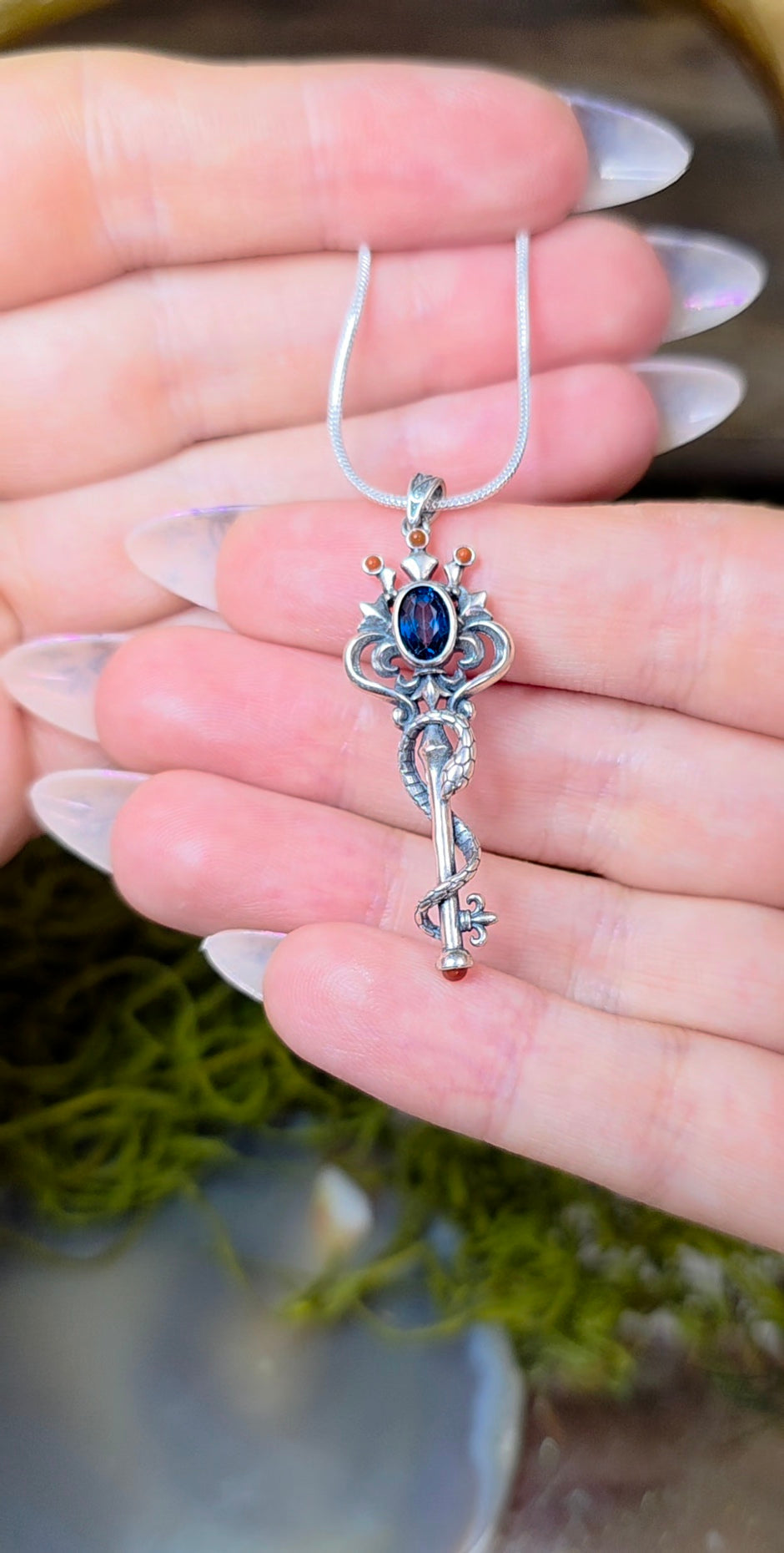 7x6mm faceted blue topaz set into a sterling silver pendant with a key and snake design with carnelian accents. The pendant's approximate length is 42mm long and comes with a base metal chain.