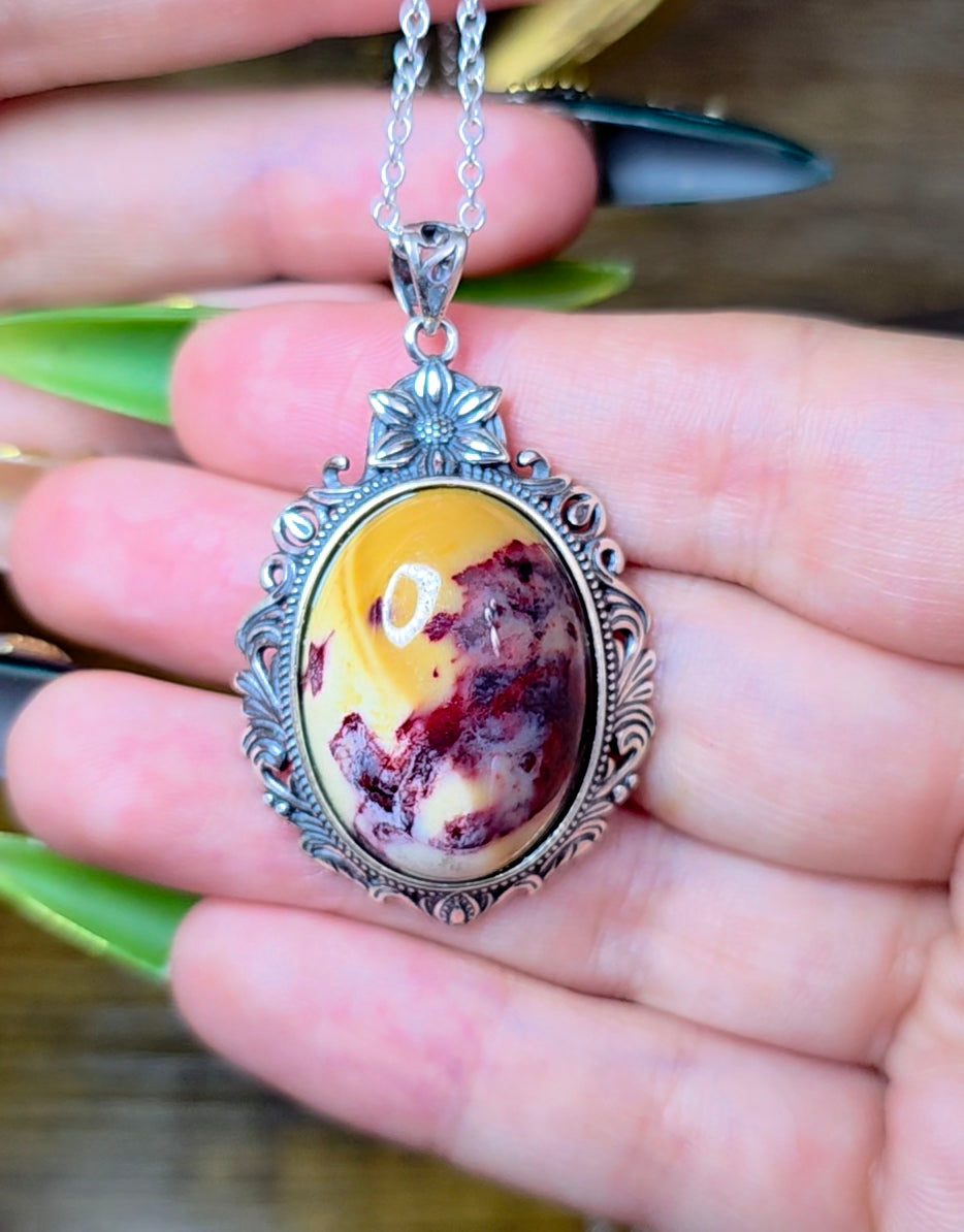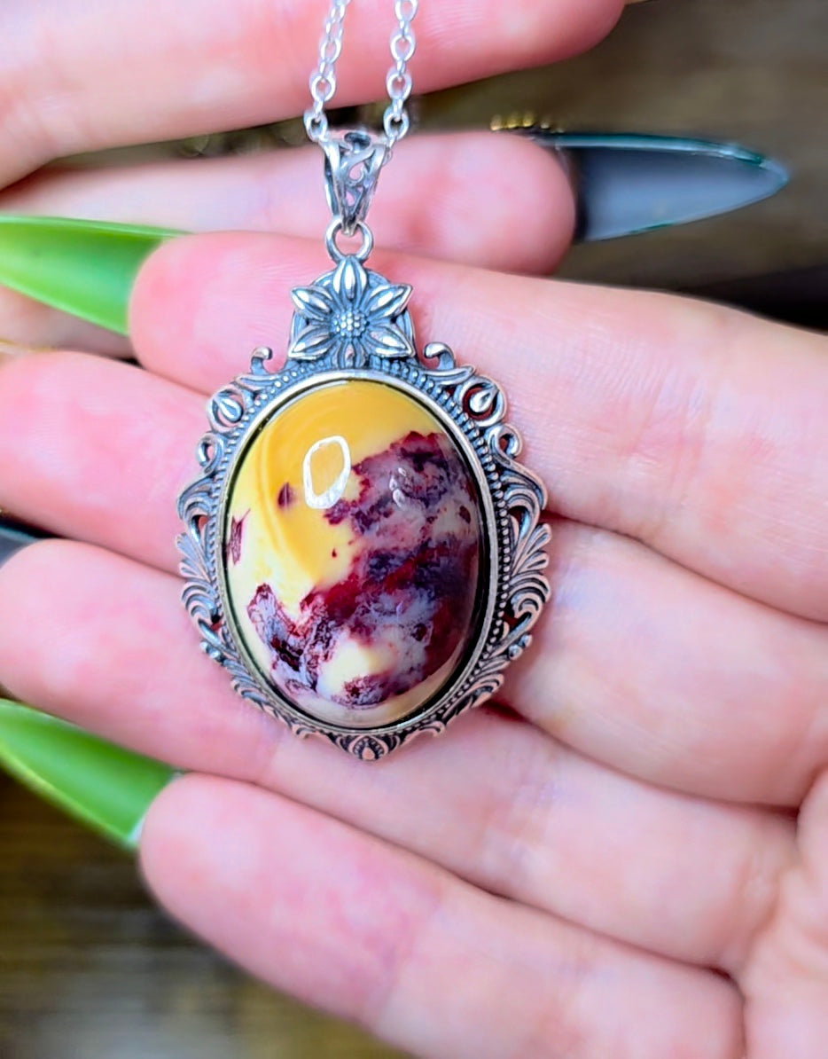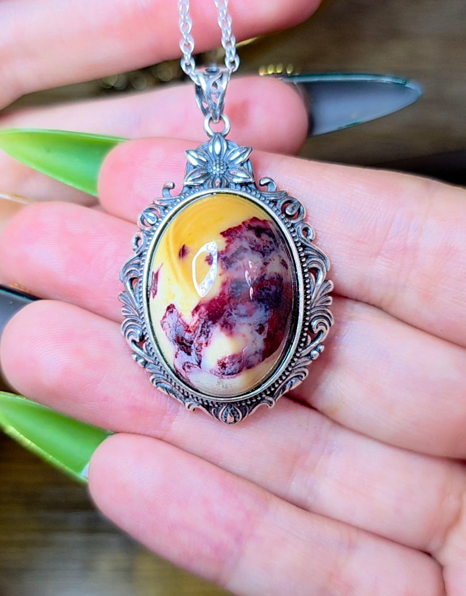 This necklace features a high quality mookaite pendant in shades of purple, yellow, and pink and set into a sterling silver pendant bail.