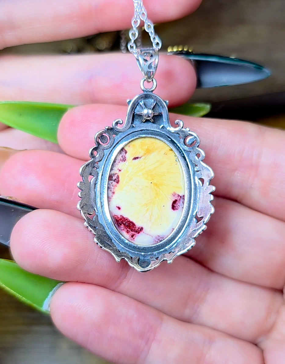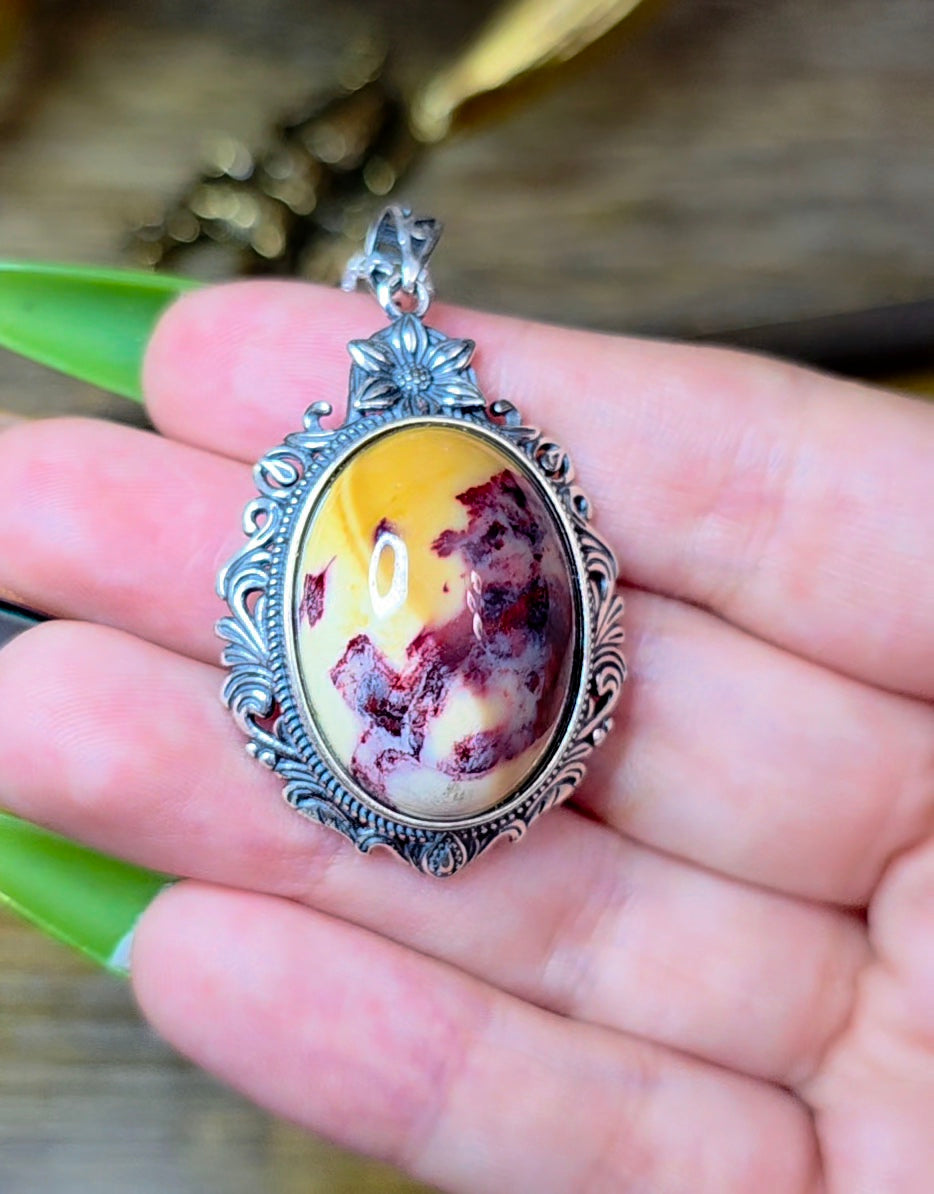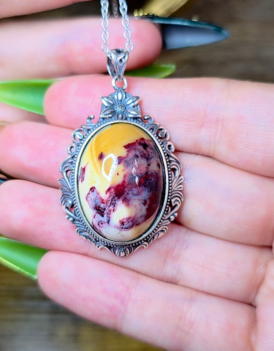 This necklace features a high quality mookaite pendant in shades of purple, yellow, and pink and set into a sterling silver pendant bail.