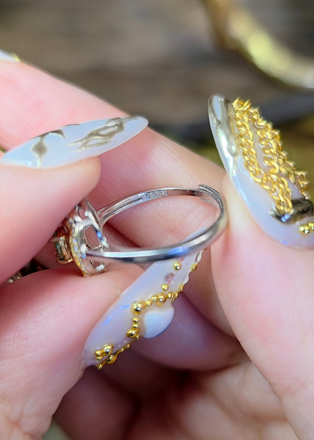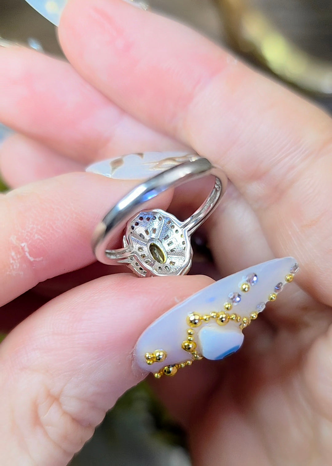 This 5x3mm stone has been facted and set into an ornate, adjustable sterling silver ring that eill best fit sizes 5-8